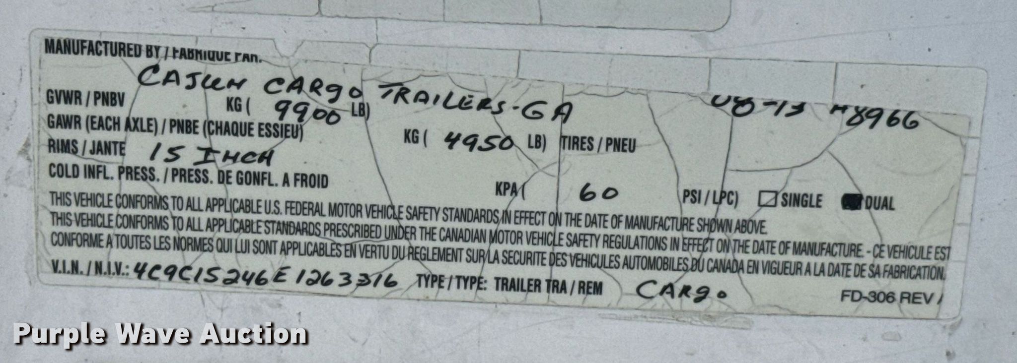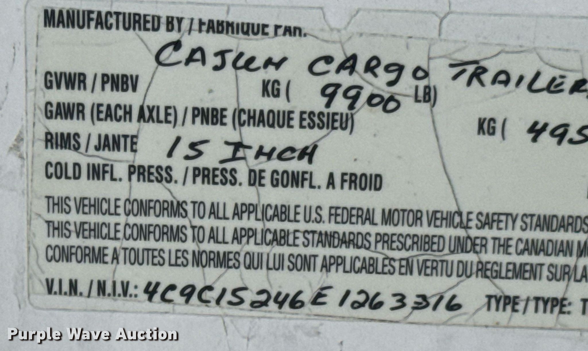 2014 Cajuan Cargo Trailers mobile office. VIN: 4C9C15246E1263316. Dimensions Overall: 28' L x 96" W, Body: 24' L x 96" W, Height: 96�. Features Deck type: Wood, (3) water storage tanks Type: stainless steel, Capacity: Approx. 1,500 gallons, Water pump CountyLine CLTS5, Phase: Single, HP: 1/2, Volts: 115/230, HVAC units: 2. Chassis Ball hitch: 2 5/16", Landing gear: Single, Suspension: Spring, Brakes: Electric, Axles: Tandem, GVWR: 9,900 lbs. Tires Steel wheels, Size: ST235/80R16. Transfer of ownership documentation will be a bill of sale. Premier Field Services LLC. Bartlesville, OK 74003