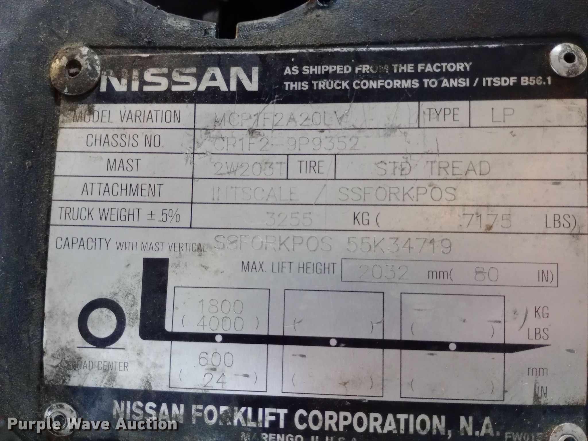 Nissan 40 forklift. Hours: 10,628 on meter. Engine Nissan, Cylinders: 4, Fuel type: LPG LP bottle: Not included. Transmission Powershift. Operators station Canopy. Features Maximum lift capacity: 4,000 lbs, Maximum lift height: 80", Mast stages: 2, Side shift, Mast tilt, Fork length: 40". Tires Solid. QP Distrubution. Mulvane, KS 67110