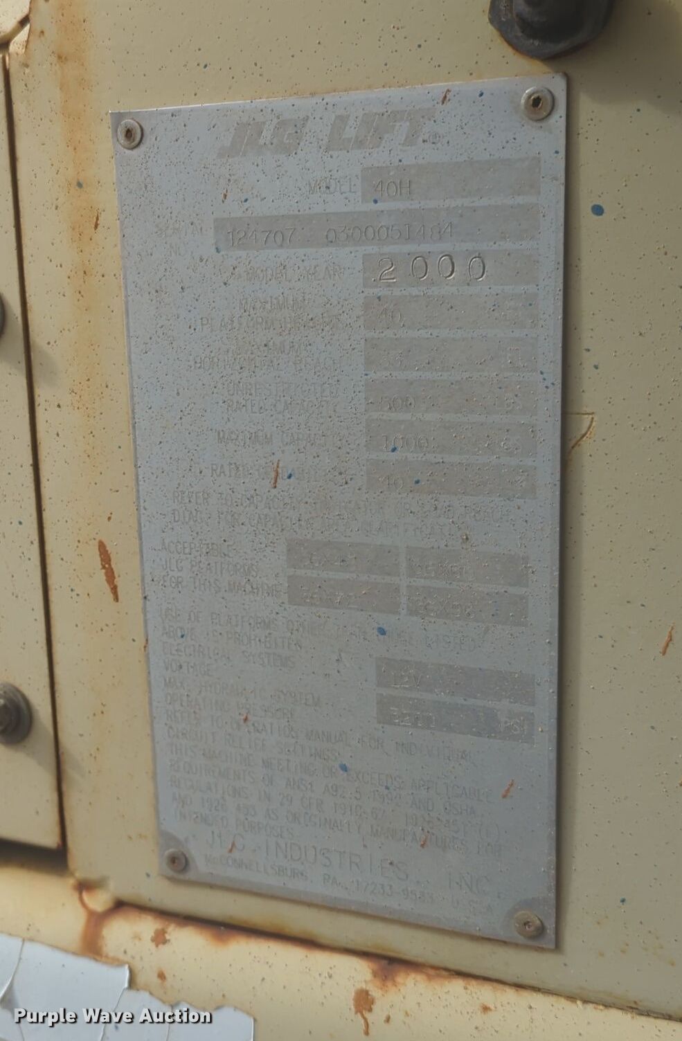 2000 JLG 40H boom lift. Hours: 4,086 on meter, Serial: 124707 030051484. Engine Cylinders: 4, Fuel type: Diesel. Features Rough terrain, Maximum lift capacity: 500 lbs, Maximum reach length: 33', Maximum lift height: 40', Platform: 96" L x 36" W, AC power outlet, Controls: Platform, Ground. Tires Tire size: 12.5L-15SL. Notes Engine runs but will not move. Steve's Wholesale Tools. Oklahoma City, OK 73139