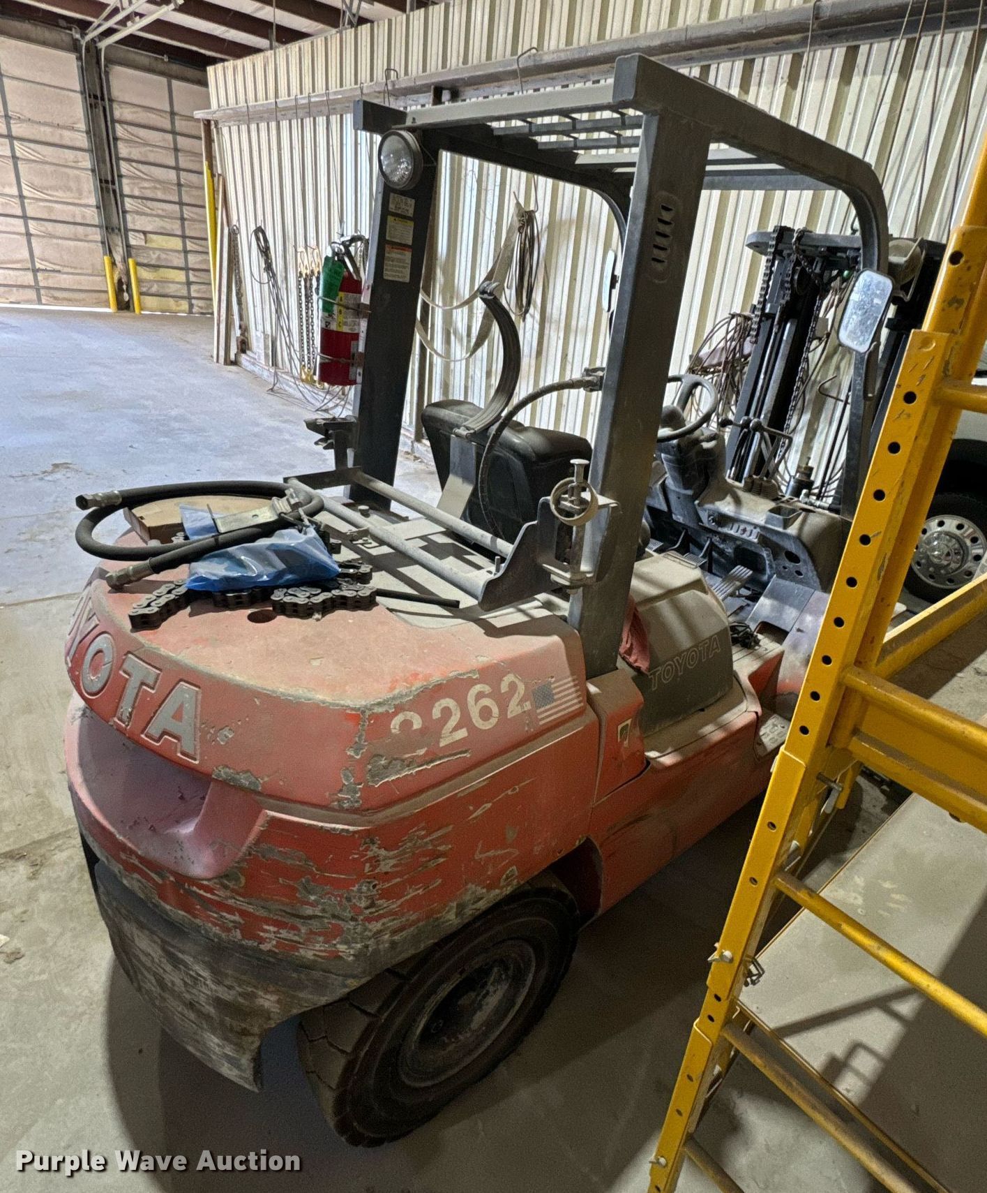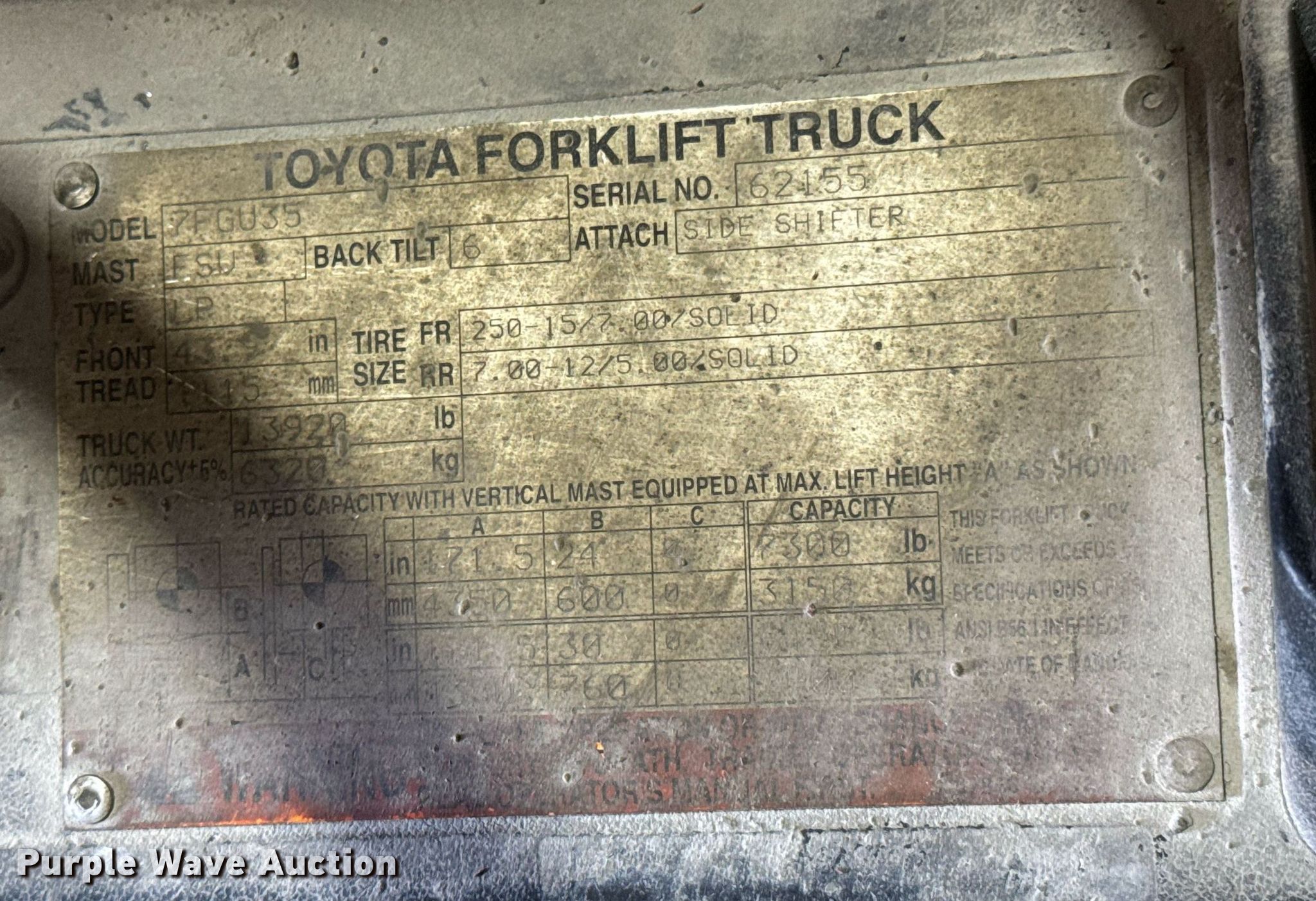 Purple Wave is selling a used Warehouse Forklift in Kansas. This item is a Toyota 7FGU35 forklift with the following: Hours: Unknown, Serial: 62155