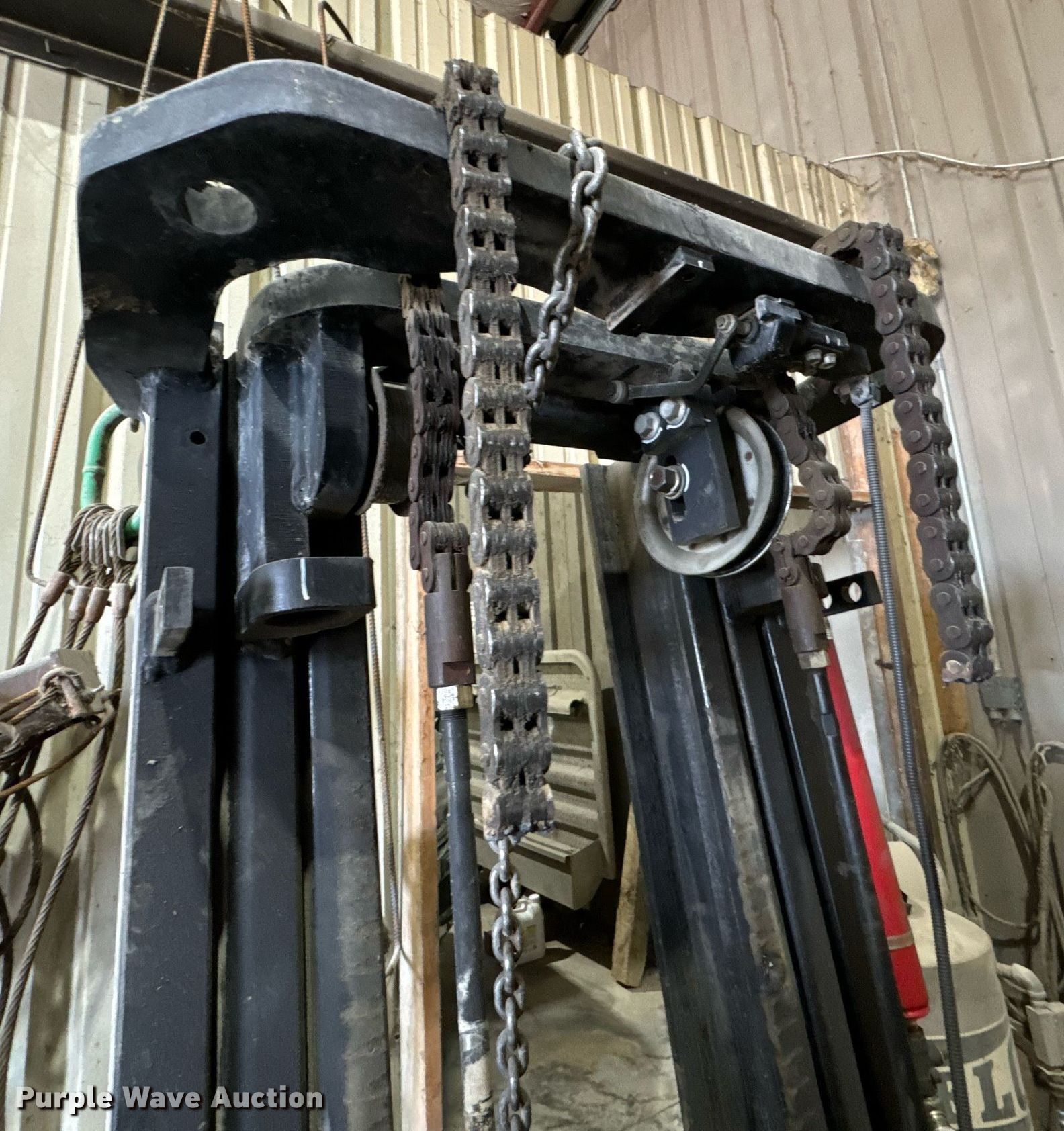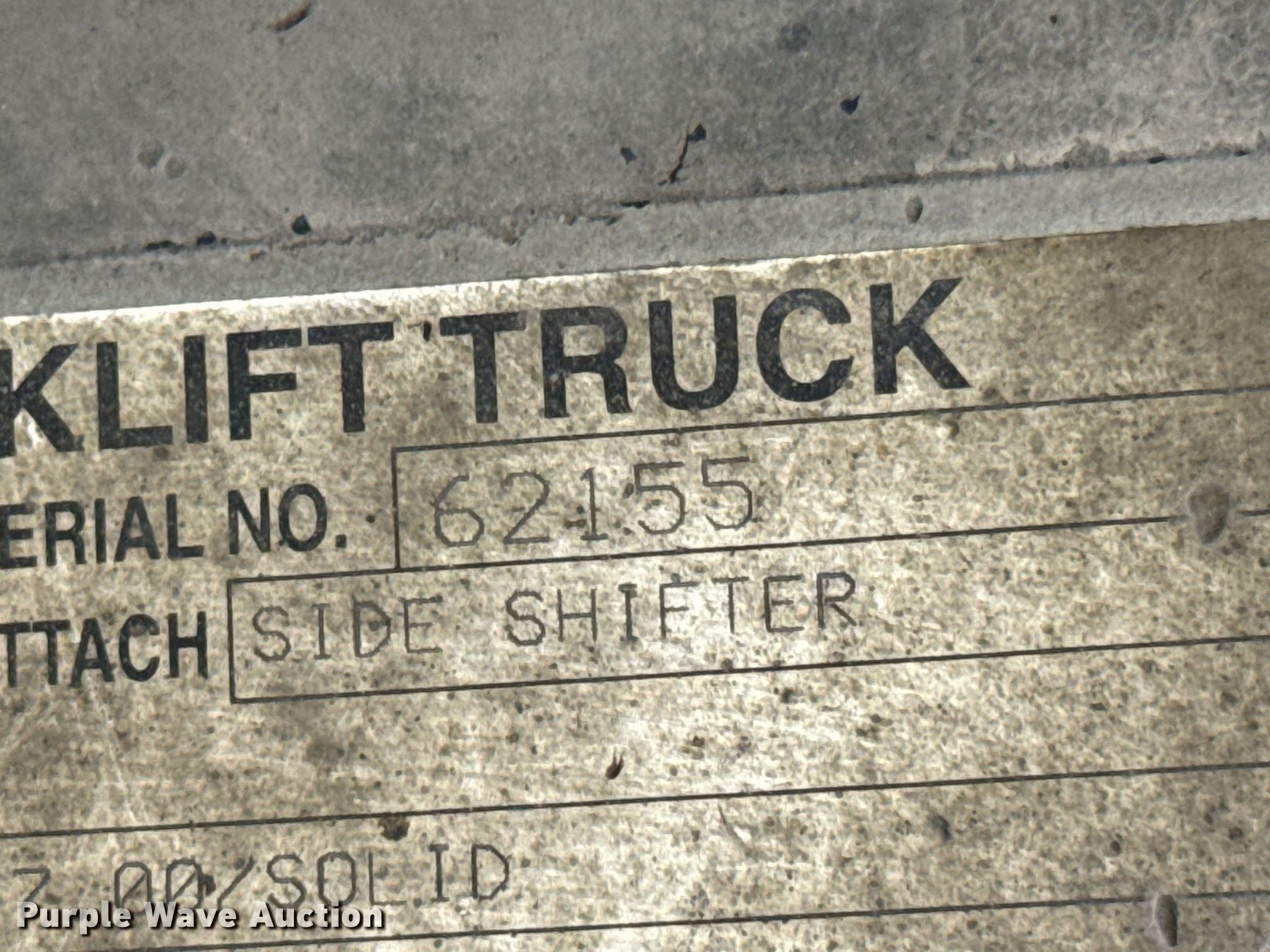 Toyota 7FGU35 forklift. Hours: Unknown, Serial: 62155. Engine Vortec, Cylinders: 6, Fuel type: LPG. Transmission Powershift. Operators station Canopy. Features Maximum lift capacity: 6,450 lbs, Maximum lift height: 171", Mast stages: 3, Mast tilt, Fork length: 48". Tires Front: 250-15, Rear: 7.00R12. Notes Dead battery, Parts missing, Non-operational unit. Wilbert Funeral Services. Parsons, KS 67357