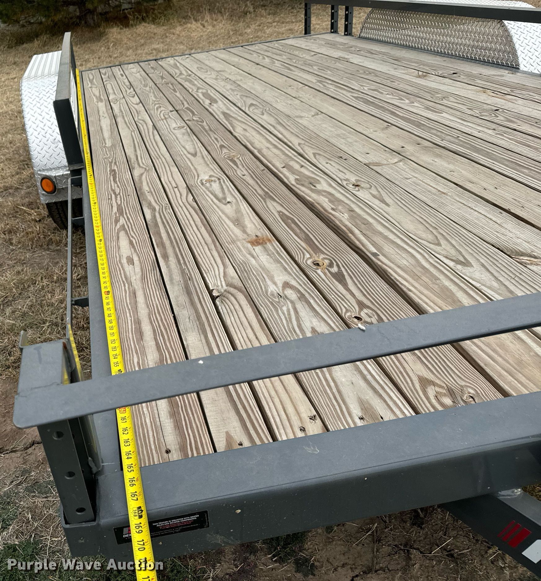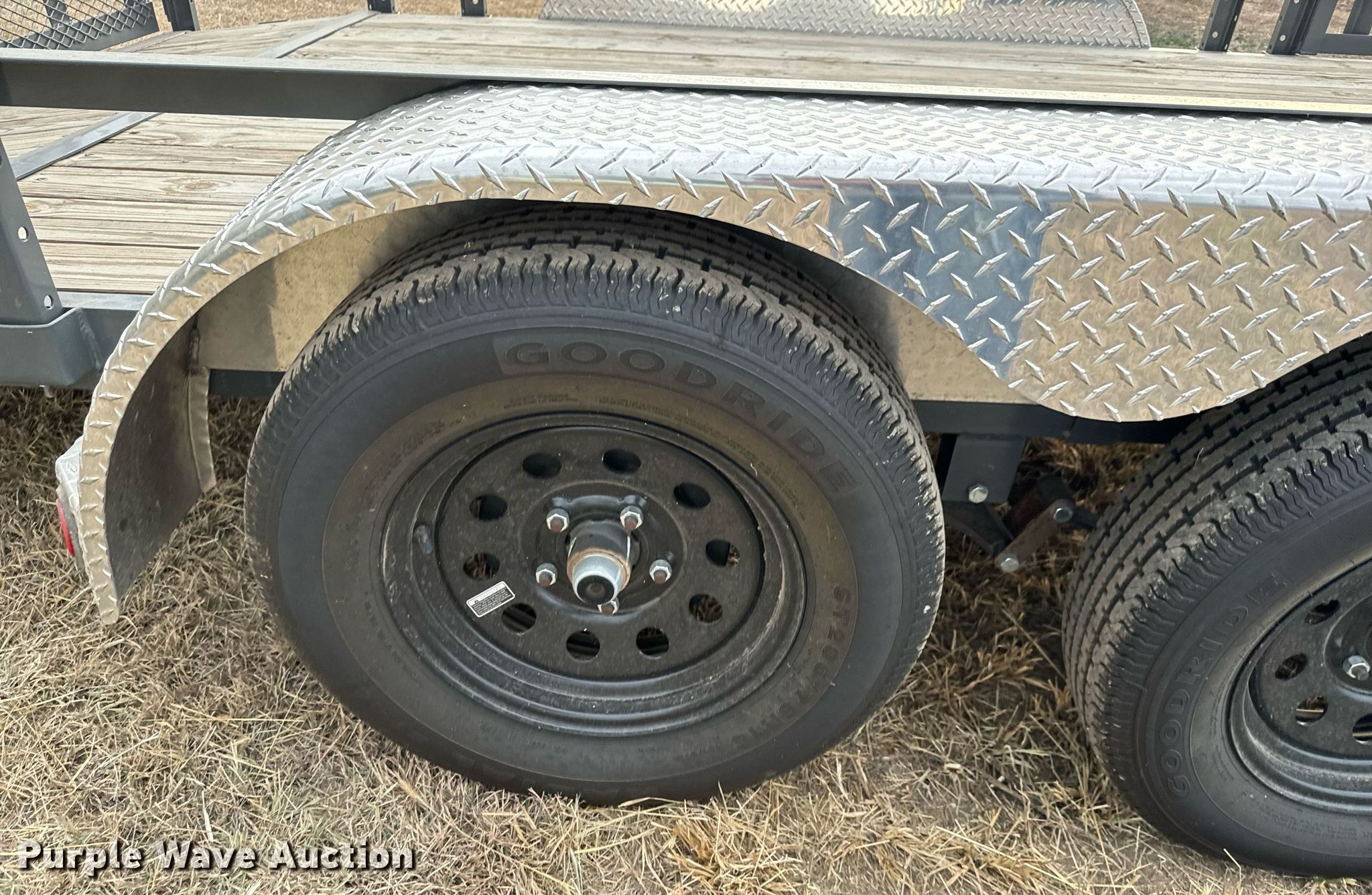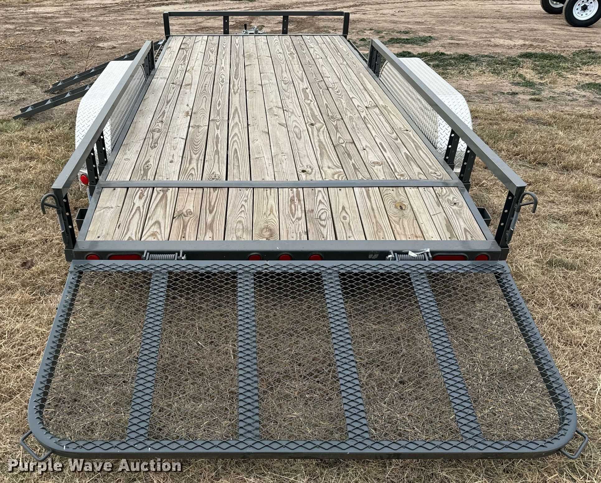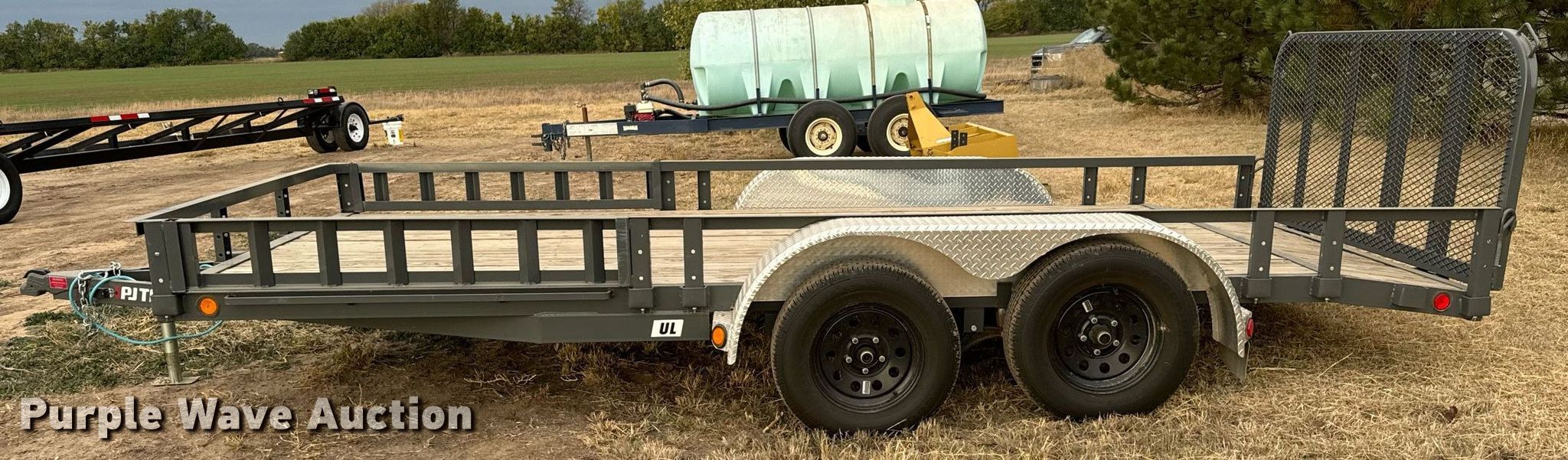 2023 PJ 1U20 utility trailer. VIN: 3CV1U2026P2651654. Dimensions Overall: 19' 6" L x 102" W, Deck: 14' L x 83" W, Tail length: 24", Ramps: Manual Length: 38", Side ramp length: 61". Features Deck type: Wood. Chassis Ball hitch: 2", Landing gear: Single, Suspension: Spring, Brakes: Electric, Axles: Tandem, GVWR: 7,000 lbs, GAWR: 3,500 lbs. Tires Steel wheels, Size: 205/75R15. Kansas title. Title distribution may be delayed up to 14 days from verification of funds. Geneseo, KS 67554