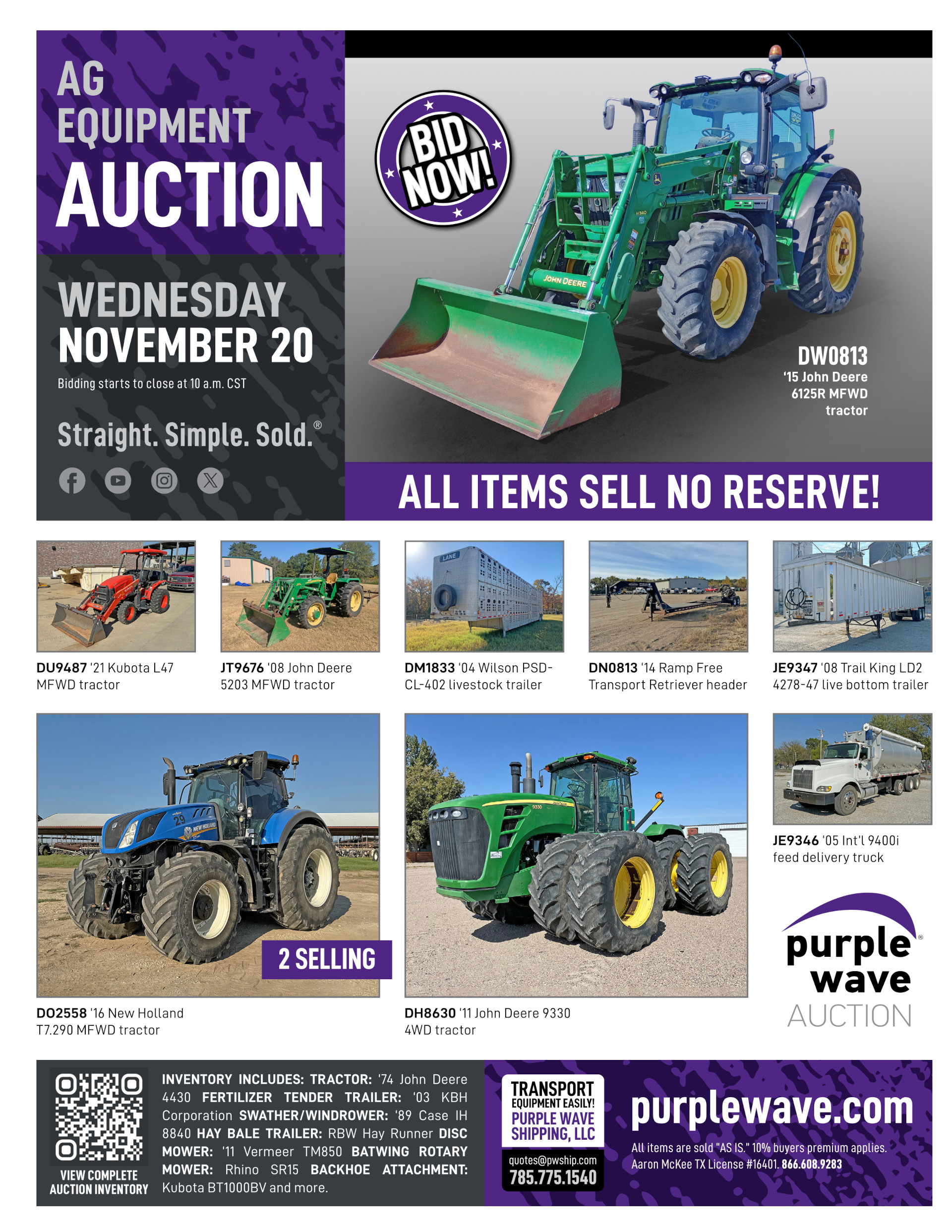 Purple Wave Shipping, LLC provides shipping and transportation services to winning bidders on ag, construction and fleet type assets. Purple Wave Shipping, LLC does not provide shipping on items weighing less than 1,000 pounds.