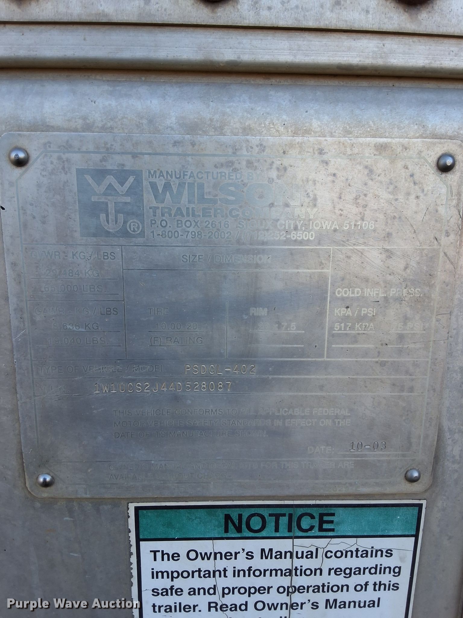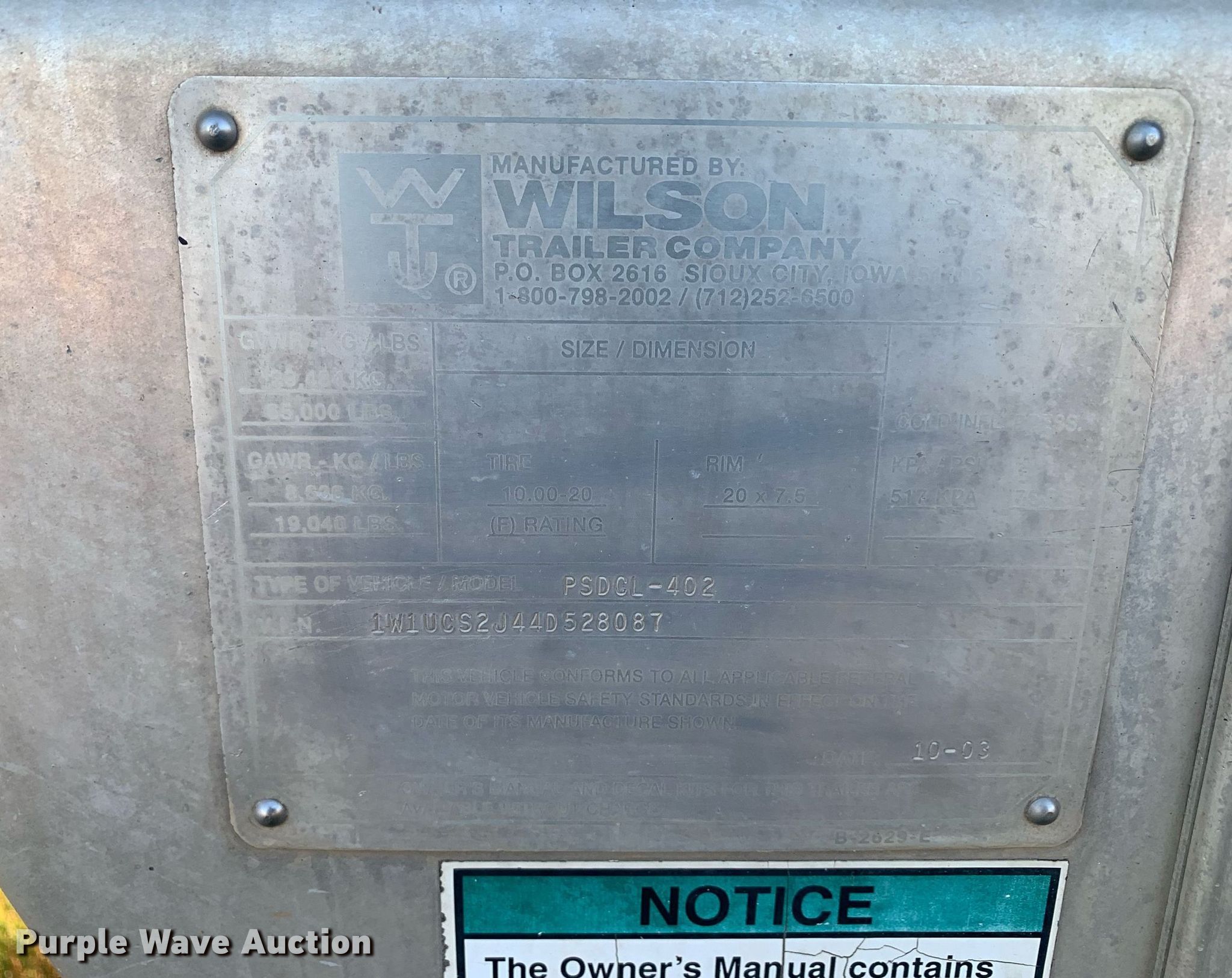 Purple Wave is selling a used Livestock Trailer in Oklahoma. This item is a 2004 Wilson PSDCL-402 livestock trailer with the following: VIN: 1W1UCS2J44D528087