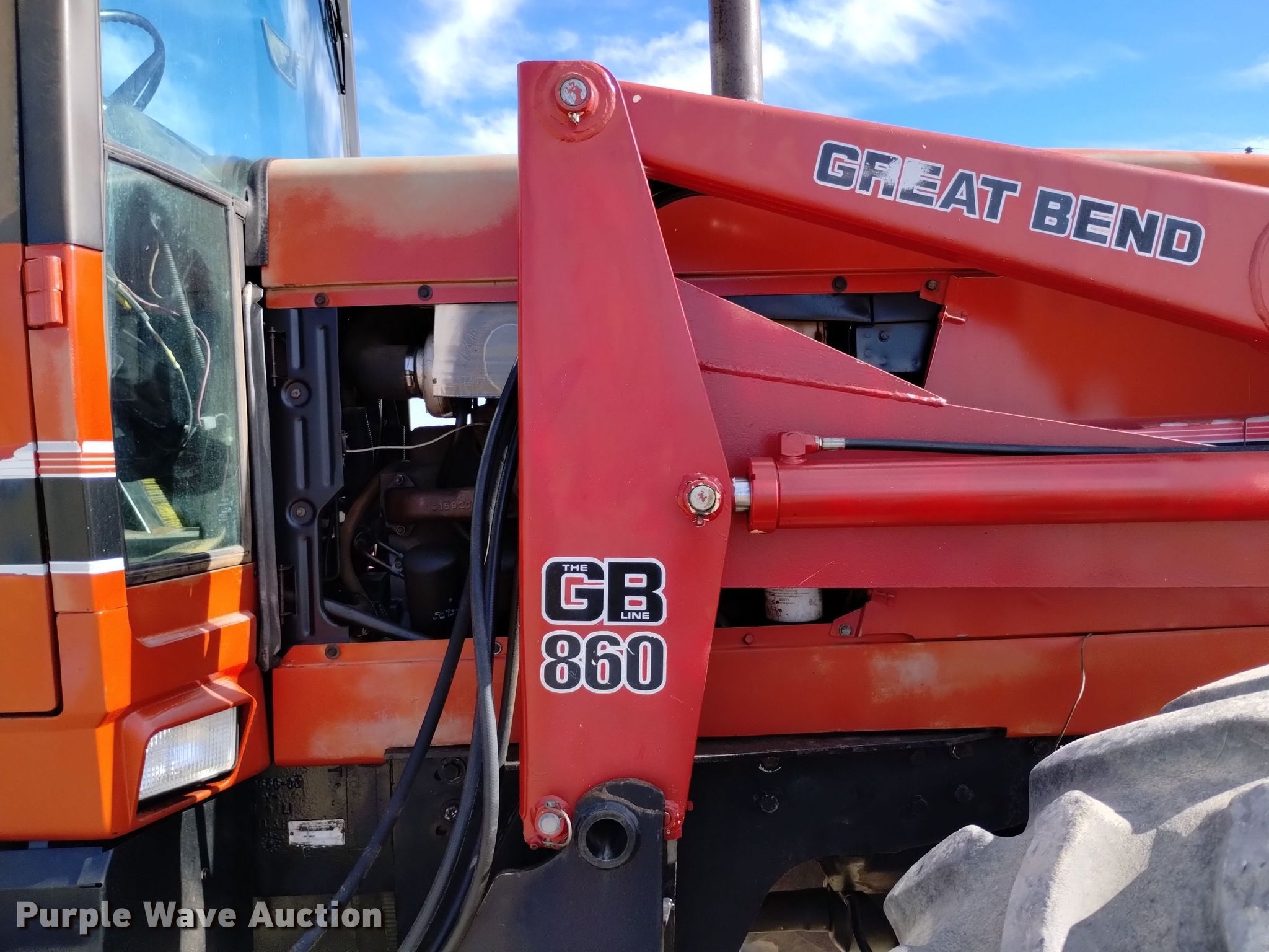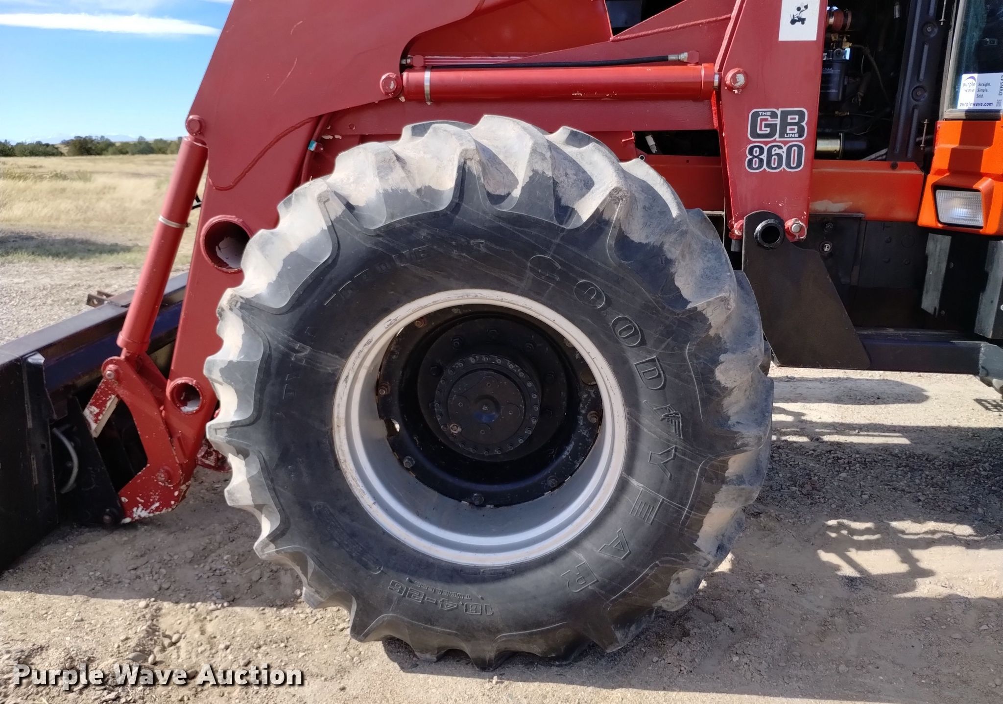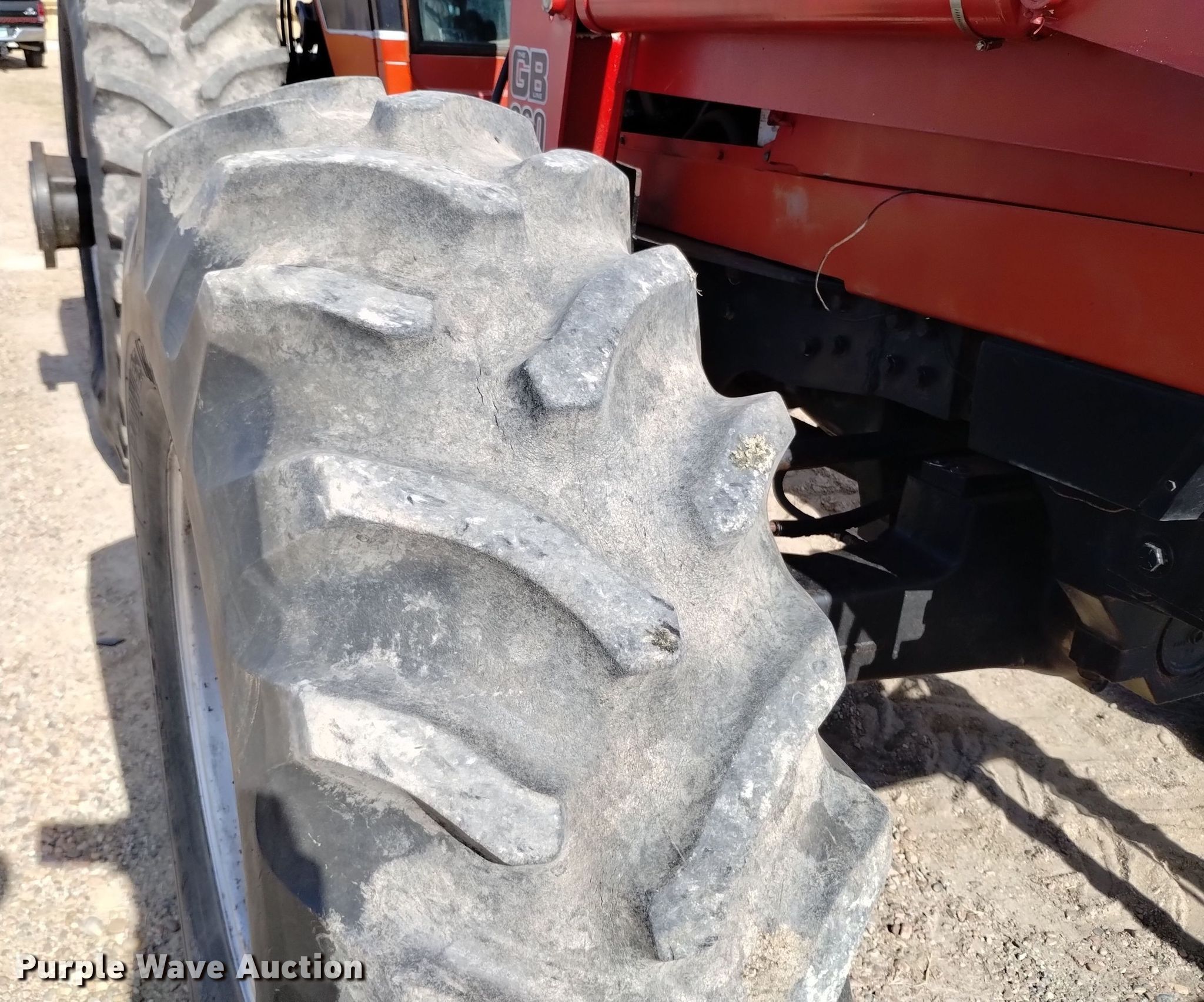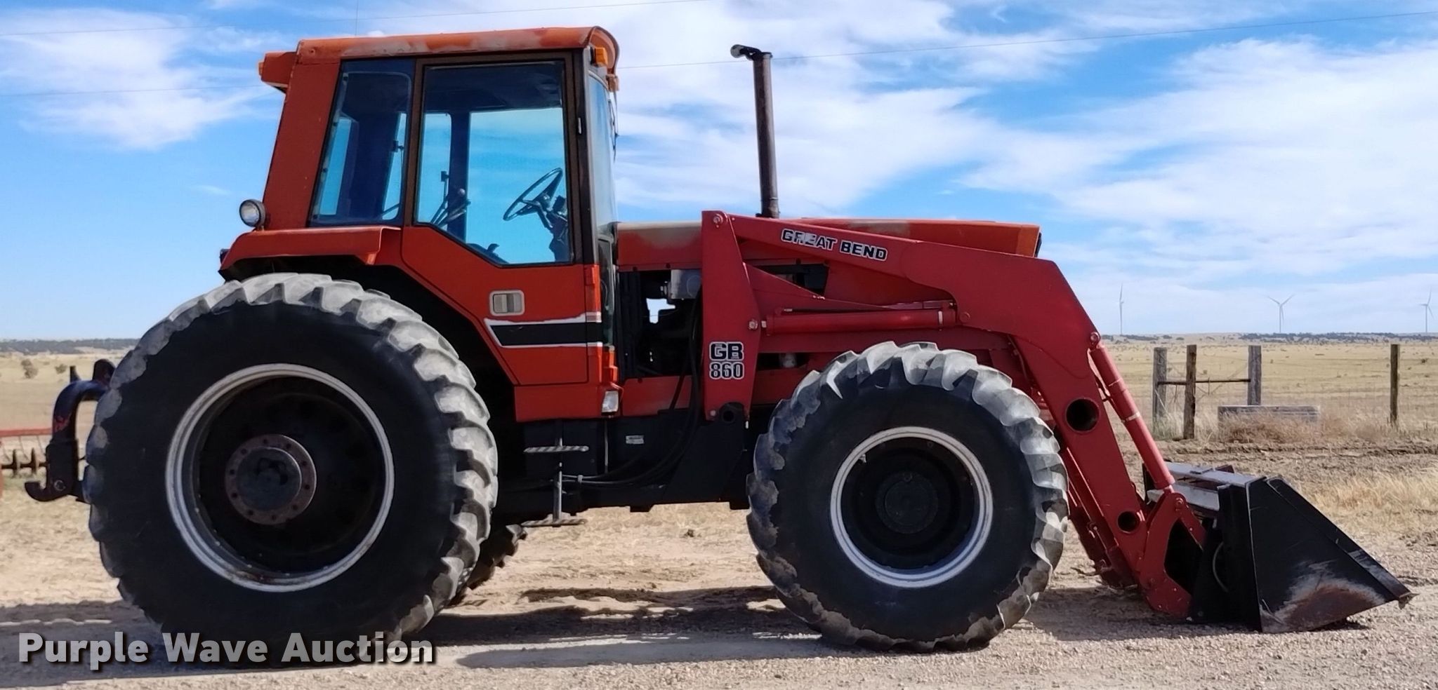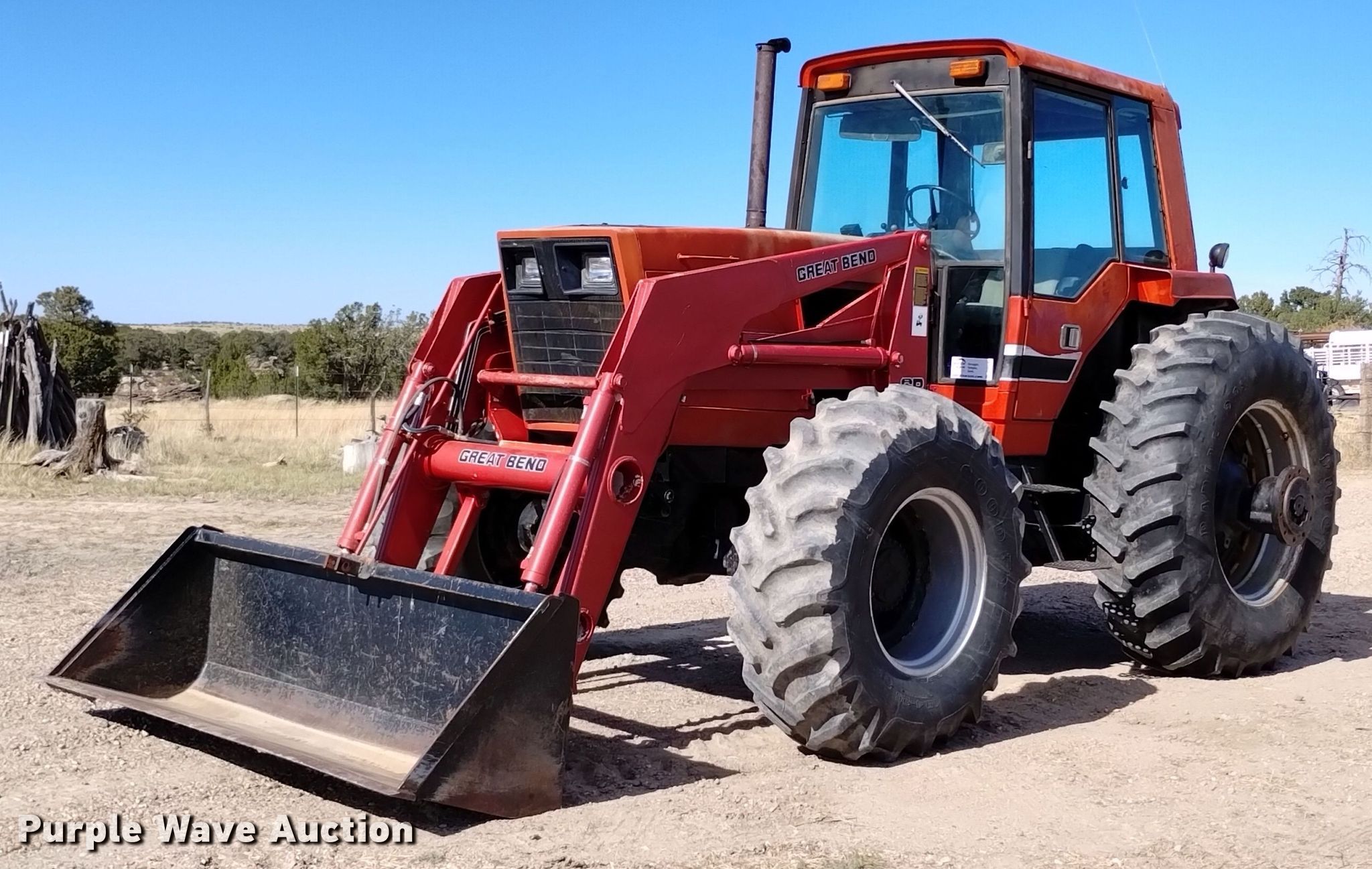 1984 International 5488 MFWD tractor. Hours: 4,827 on meter, Serial: 2590009U0003581. Engine International, Cylinders: 6, Fuel type: Diesel. Transmission Synchro, 18F - 6R. Operators station AC, Heat. Features PTO: 1000, Three point Quick attach, Hydraulic remote sets Rear: 4, Power beyond (hydraulics), Loader GB 860, Quick attach, Controls: Two-lever, Bucket Width: 85", Bale spear. Tires Front: 18.4-26, Rear: 28R38, Duals. Notes One rear tire missing, Engine panels missing. Item will be utilized during the removal process. Item will be available for load-out beginning December 4. Walsenburg , CO 81089
