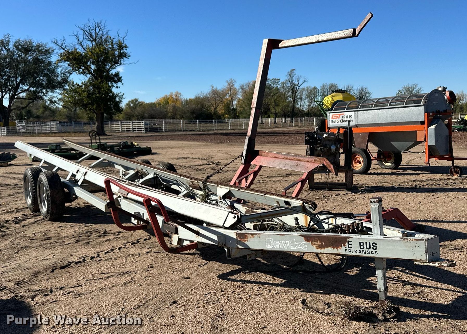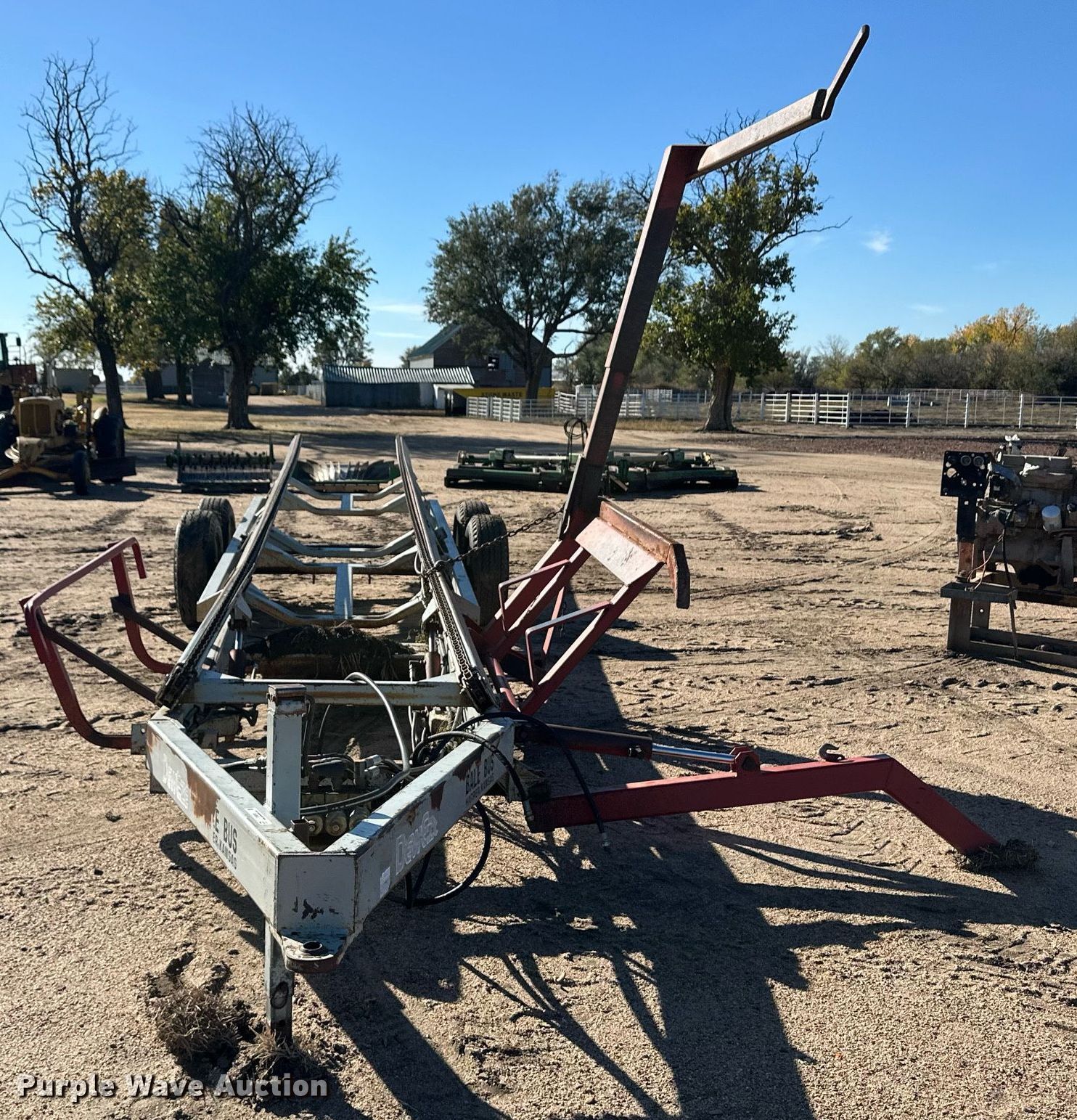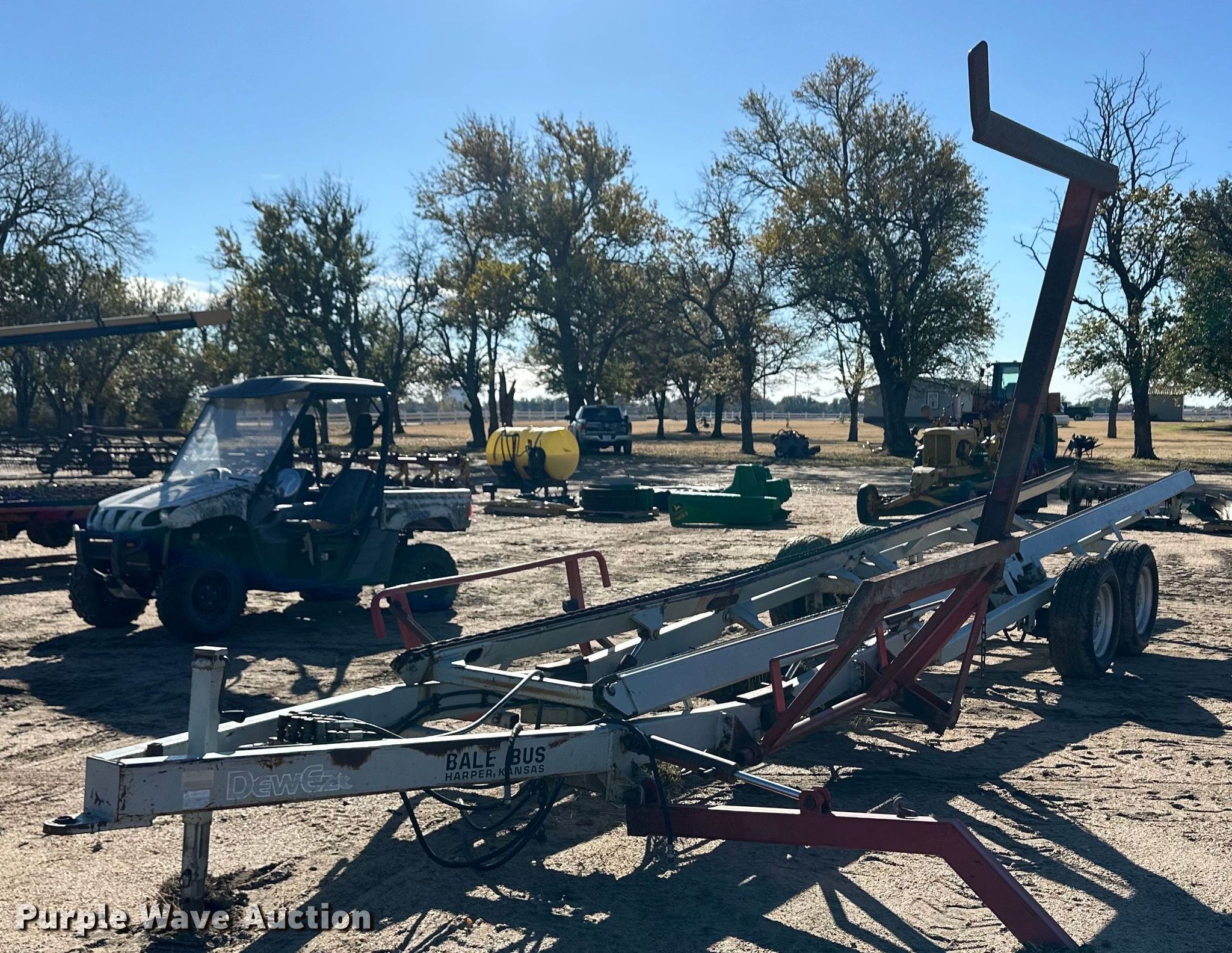 Purple Wave is selling a used Hay Handling in Kansas. This item is a DewEze Bale Bus bale stacker trailer with the following: Hydraulic bed tilt, Hydraulic chain drive, Hydraulic bale lift arm, Suspension: Spring, Axles: Tandem