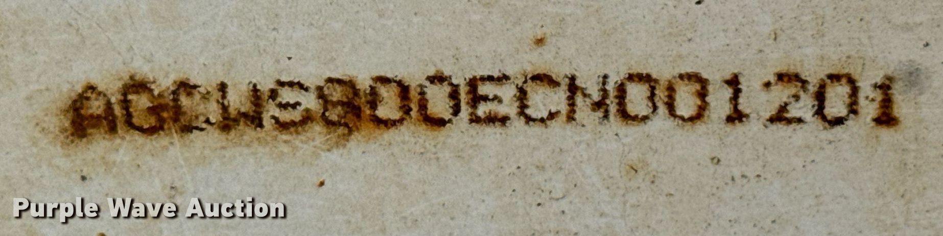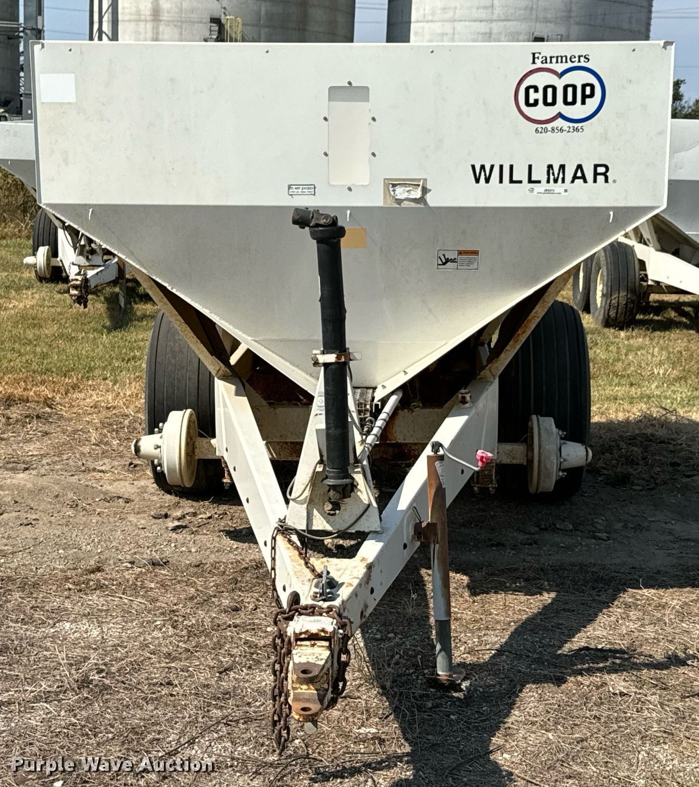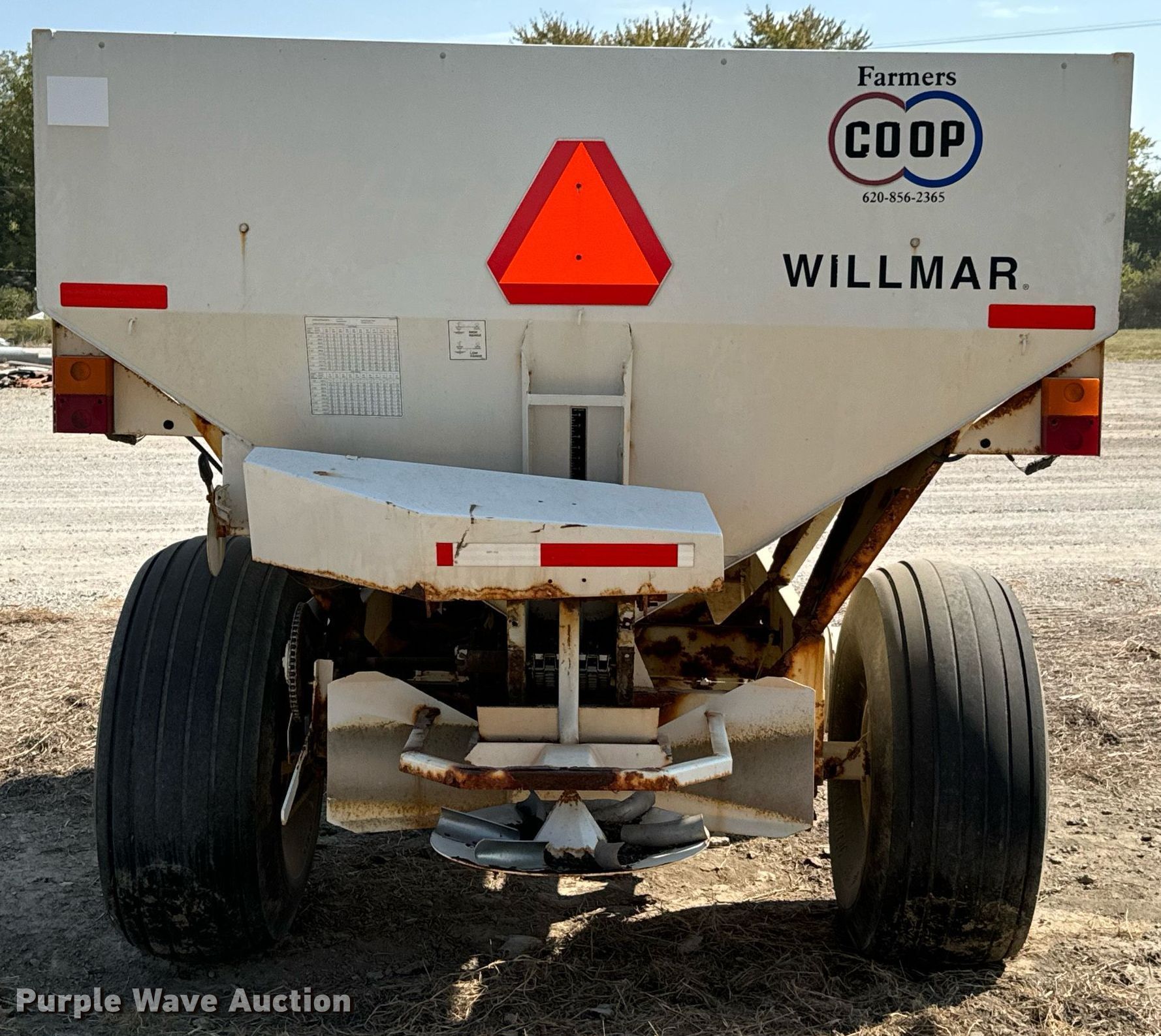 Willmar Super 800 spreader. Serial: AGCWS800ECN001201. Features PTO: 540, Dry fertilizer spreader Ground driven, Conveyor belt Width: 8".. Tires Size: 19L-16.1. Notes (2) tires and wheels missing, Non-operational unit. Farmers Cooperative Assn.. Columbus, KS 66725