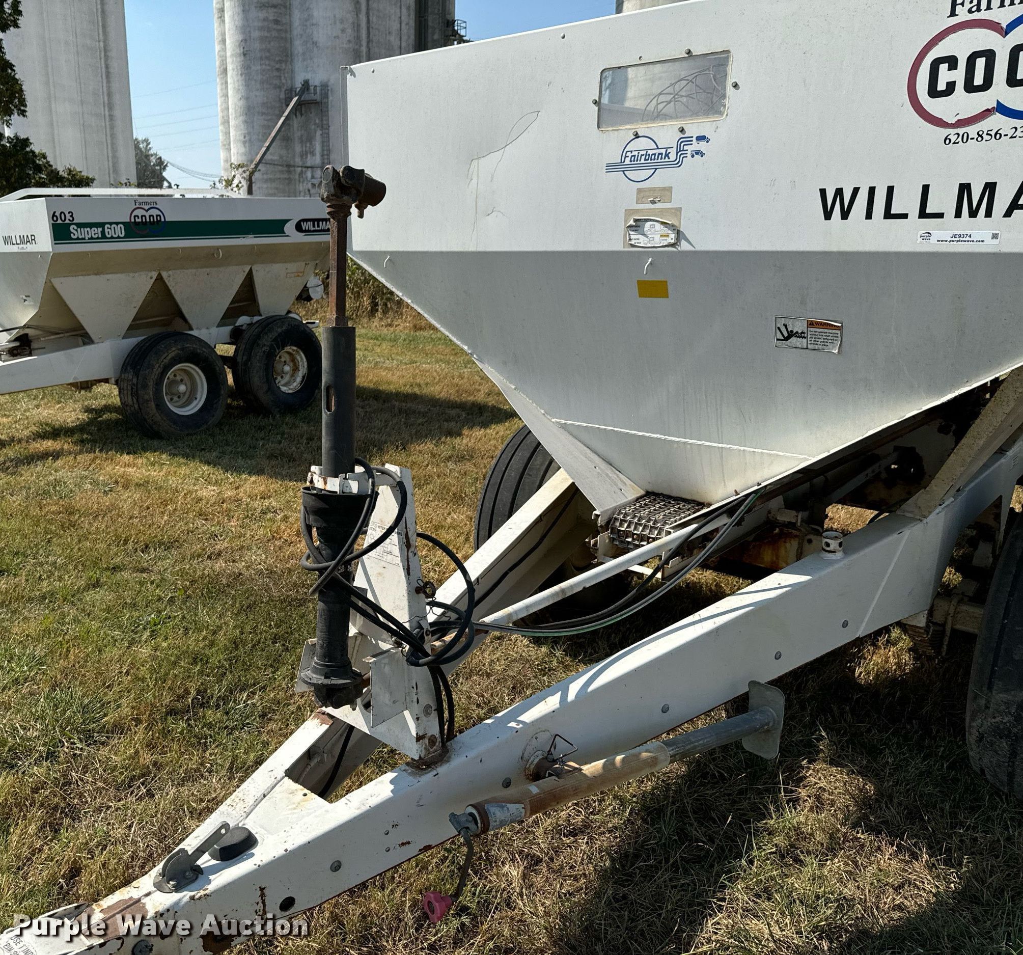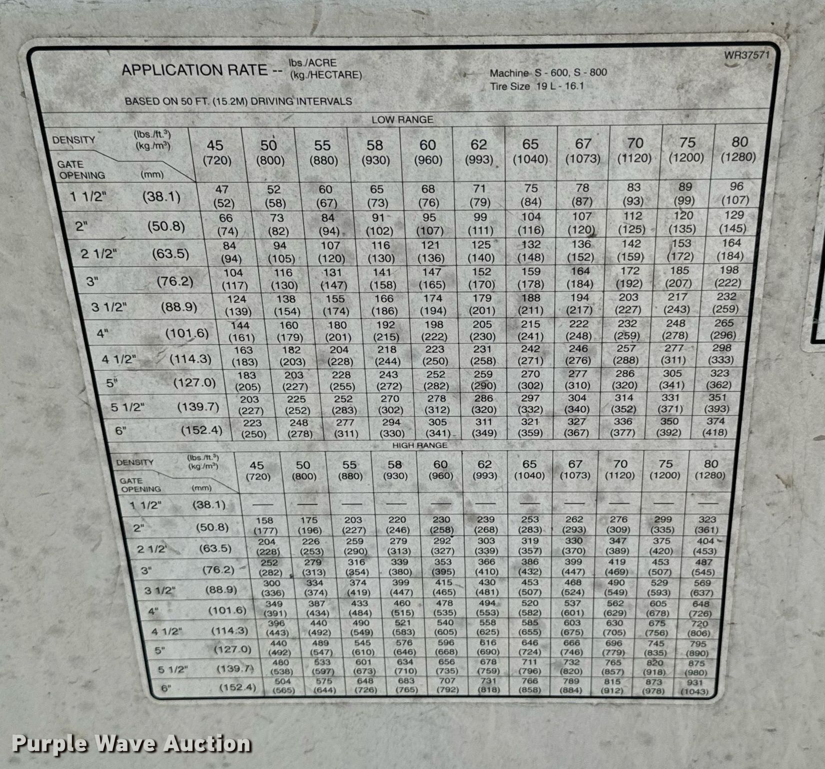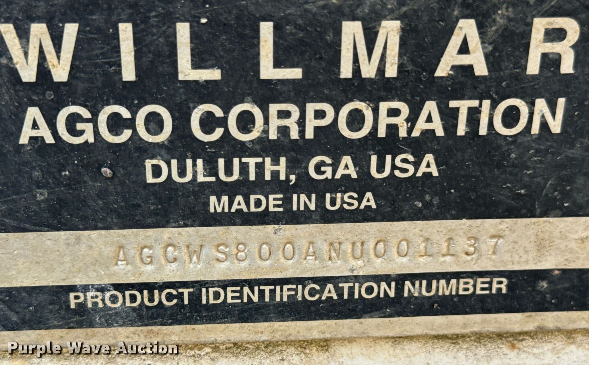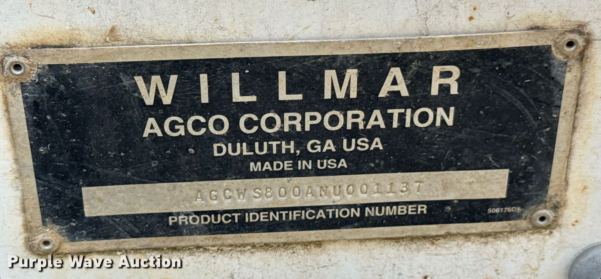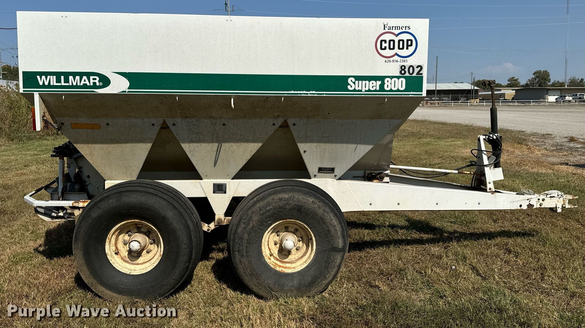 Willmar Super 800 spreader. Serial: AGCWS800ANU001137. Features PTO: 540, Dry fertilizer spreader Dual spinners, Ground driven, Conveyor belt Width: 8".. Tires Size: 16.5L-16.1. Notes Unknown operating condition. Farmers Cooperative Assn.. Columbus, KS 66725