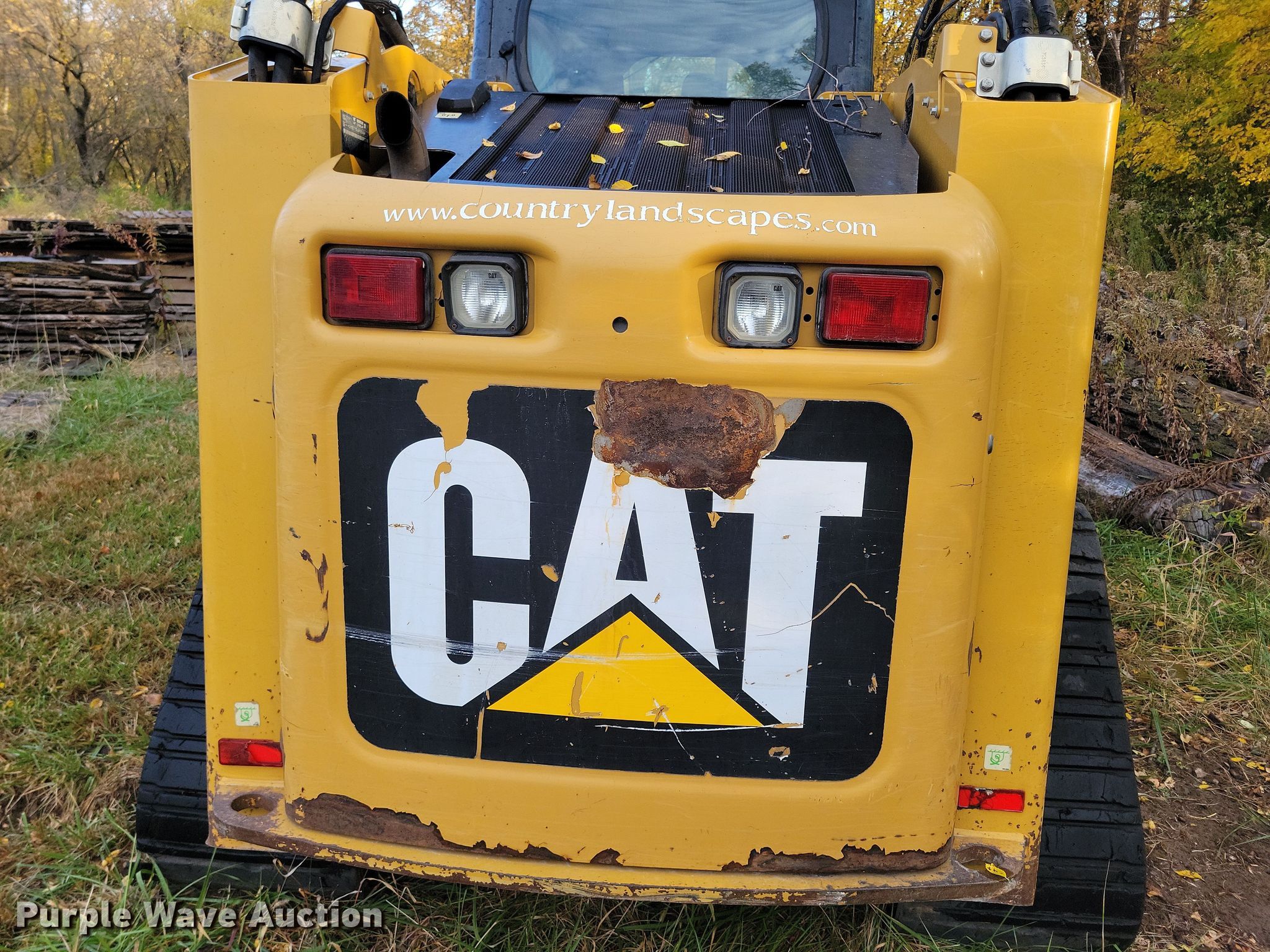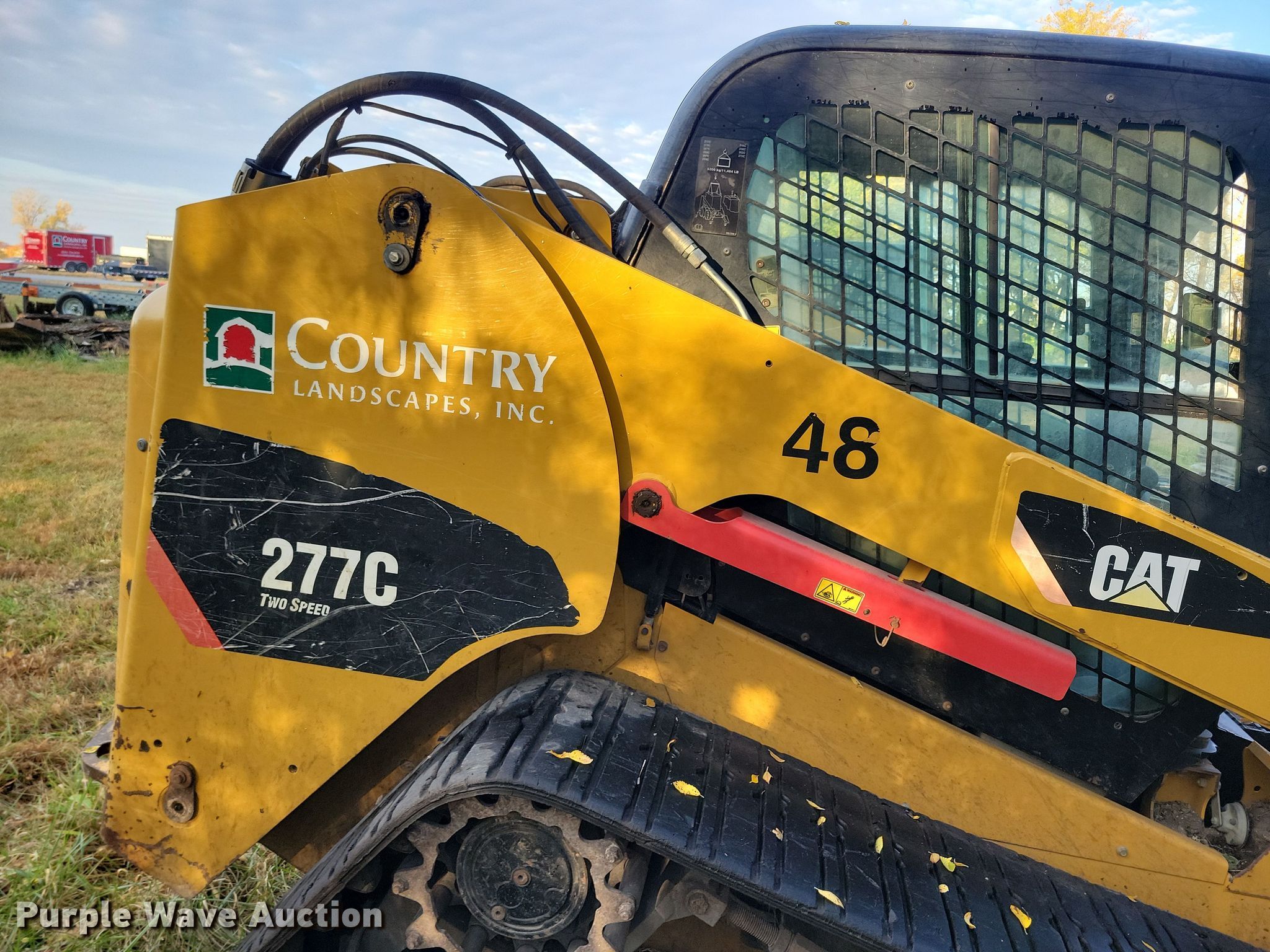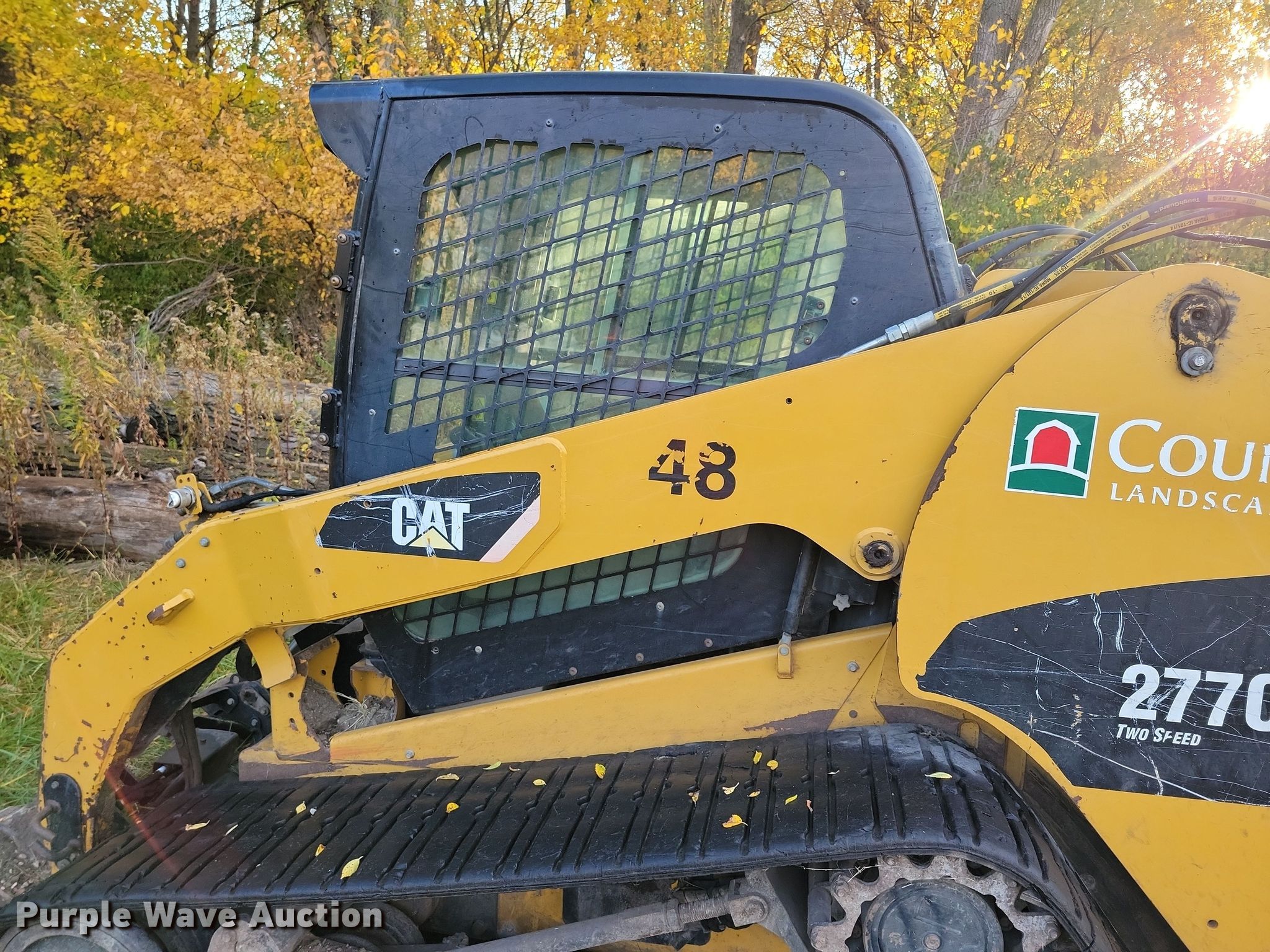 2011 Caterpillar 277C tracked skid steer loader. Hours: 3,476 on meter, Serial: CAT0277CAJWF02646, Unit #: 48. Engine Caterpillar, Cylinders: 4, Fuel type: Diesel. Transmission Hydrostatic, Two speed travel. Operators station Enclosed cab, AC, Heat, Bucket control: Hand. Features Auxiliary hydraulics, Quick coupler: Hydraulic. Tracks Width: 18". Notes Non-operational unit. Country Landscapes, Inc.. Ames, IA 50010