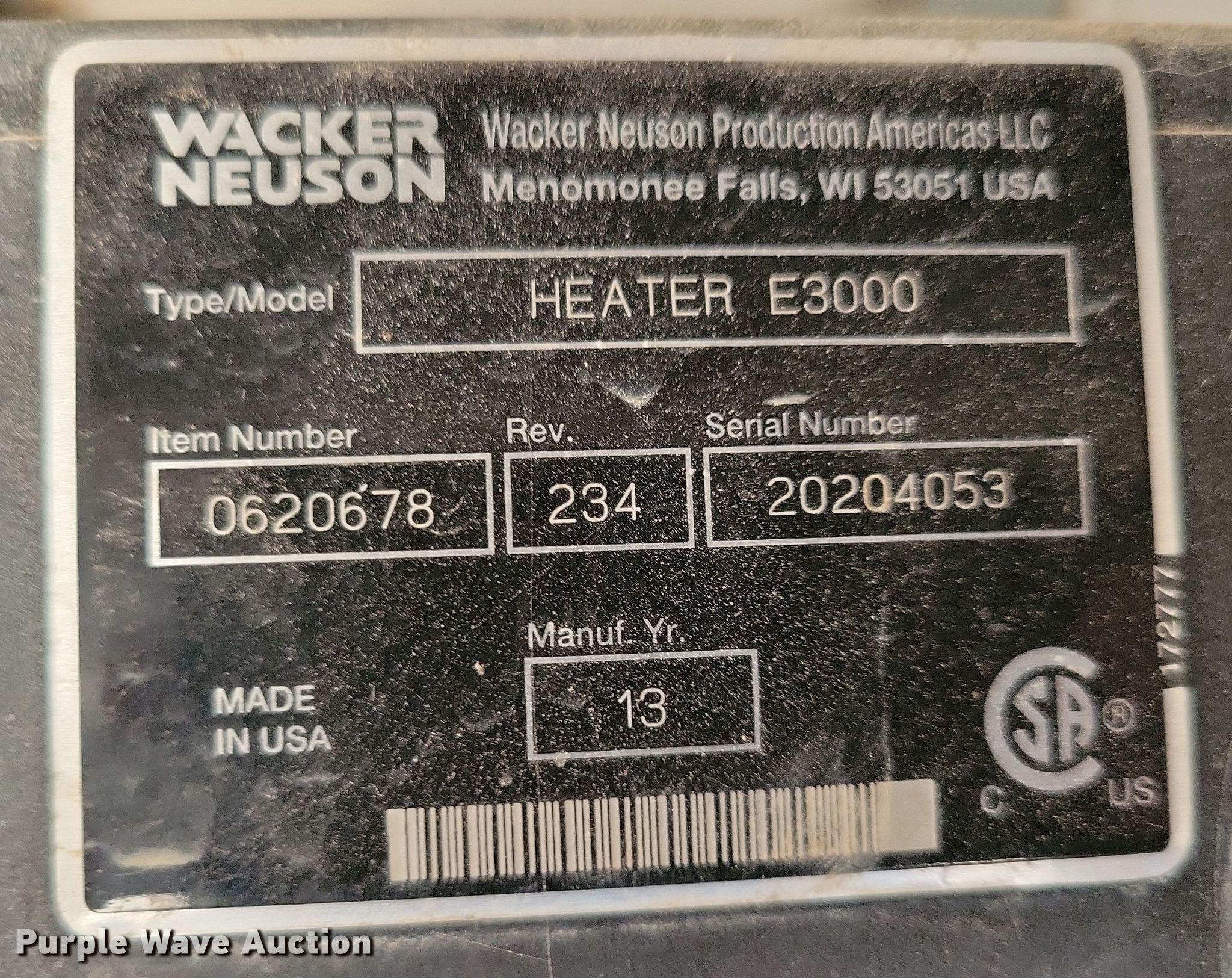 Purple Wave is selling a used Portable Heater or Fan in Iowa. This item is a 2013 Wacker Neuson E3000 ground heater with the following: Hours: 4,821 on meter, Hours: 5,073 on second meter, VIN: 5XFCS1526DN004713