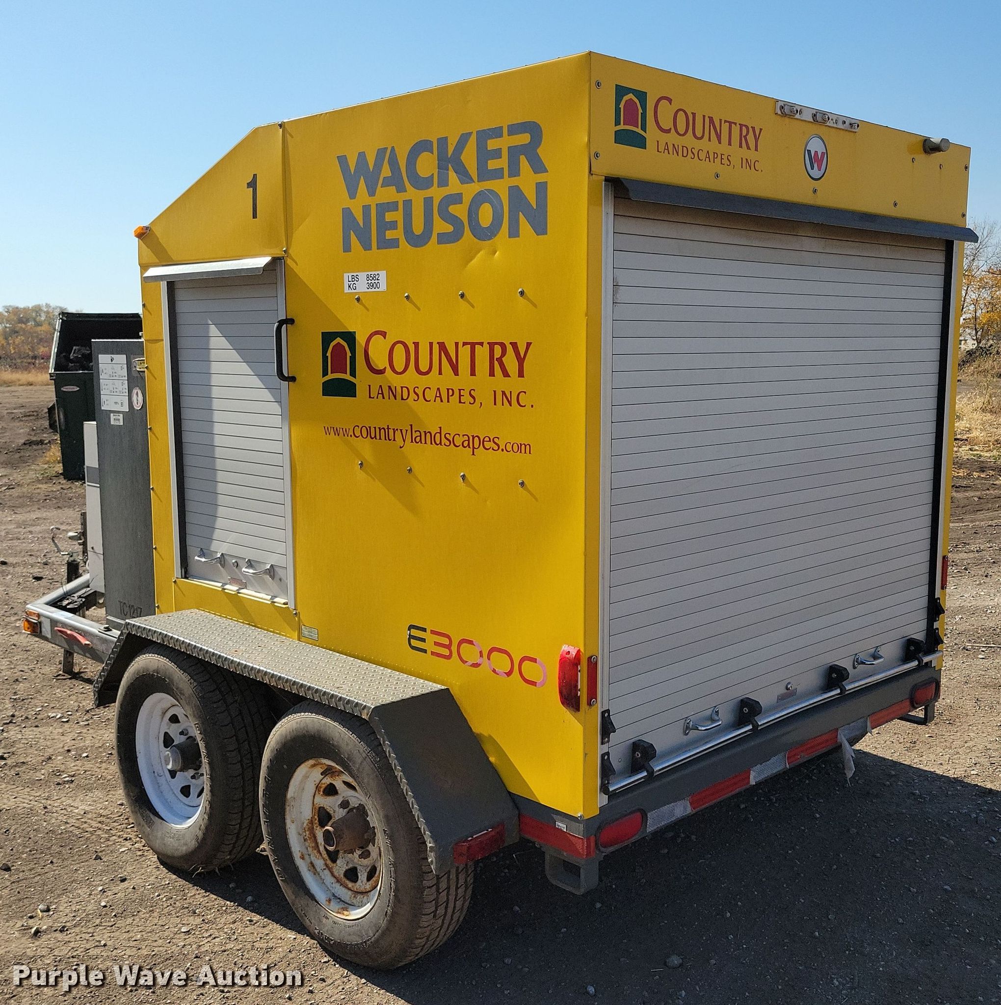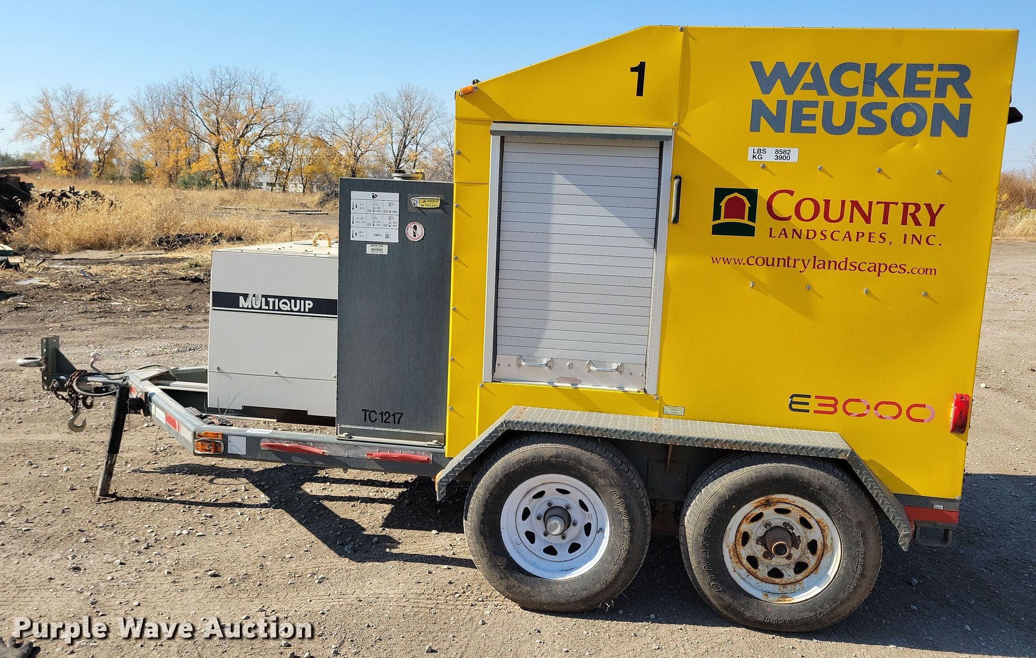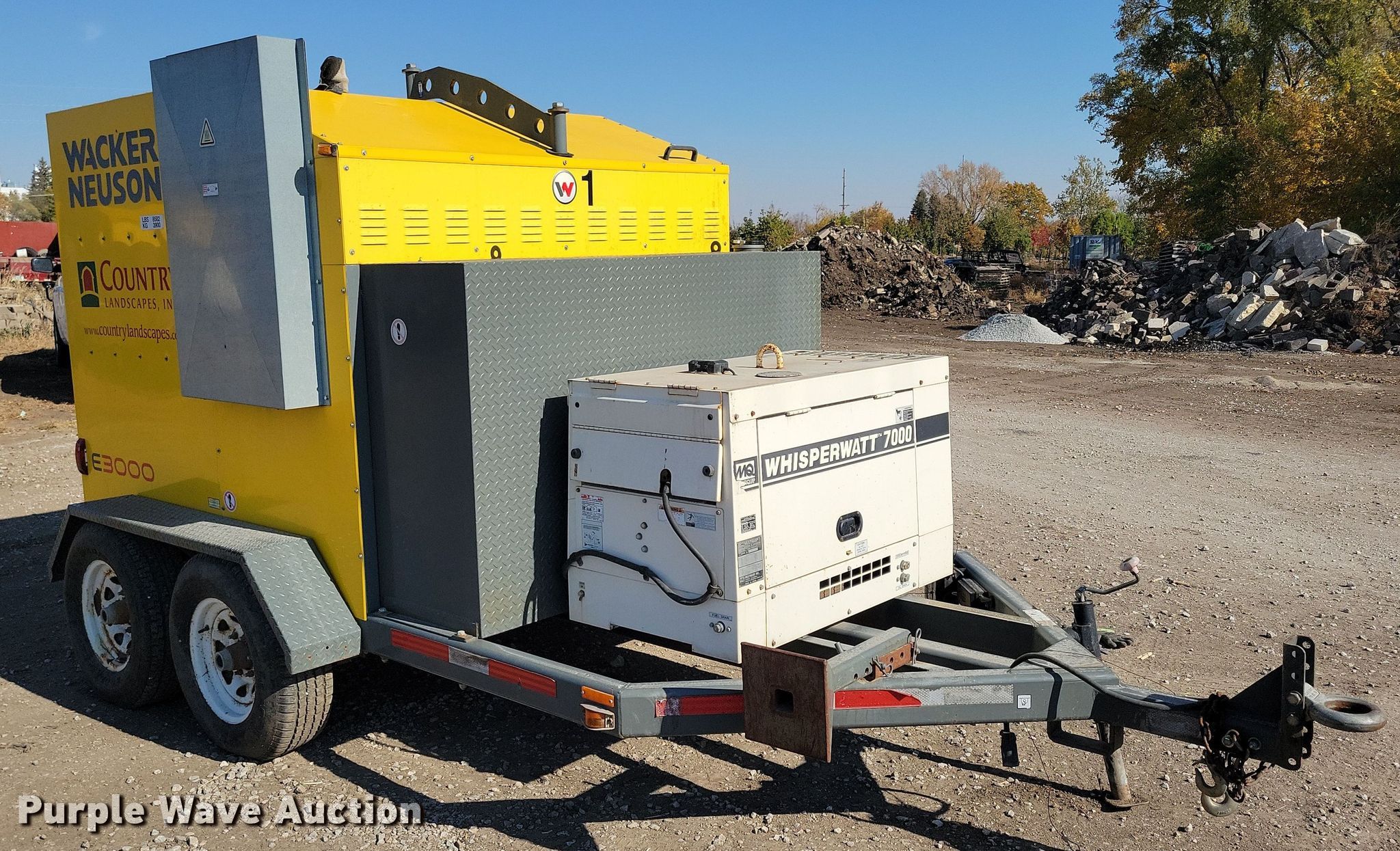 2013 Wacker Neuson E3000 ground heater. Hours: 6,942 on meter, Hours: 7,016 on second meter, VIN: 5XFCS1528DN004521. Engine Kubota Z482, Displacement:.479L, Cylinders: 2, Fuel type: Diesel, kW: 9.2. Features (2) hose reels, Generator Multiquip Whisperwatt 7000 Serial: 5702933, Watts: 7,000, Volts: 120/240, Phase: Single.. Tires Size: ST225/75R15. This is worksite support equipment and will not come with a title. Transfer of ownership documentation will be a bill of sale. Country Landscapes, Inc.. Ames, IA 50010