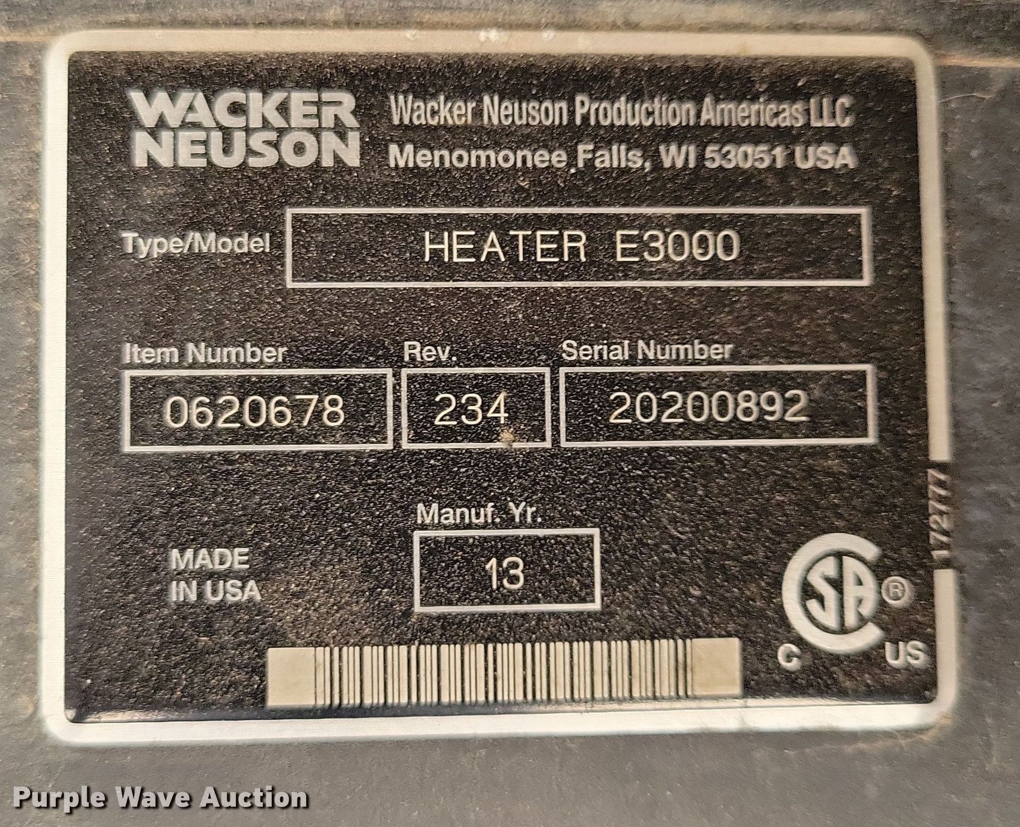 Purple Wave is selling a used Portable Heater or Fan in Iowa. This item is a 2013 Wacker Neuson E3000 ground heater with the following: Hours: 6,942 on meter, Hours: 7,016 on second meter, VIN: 5XFCS1528DN004521