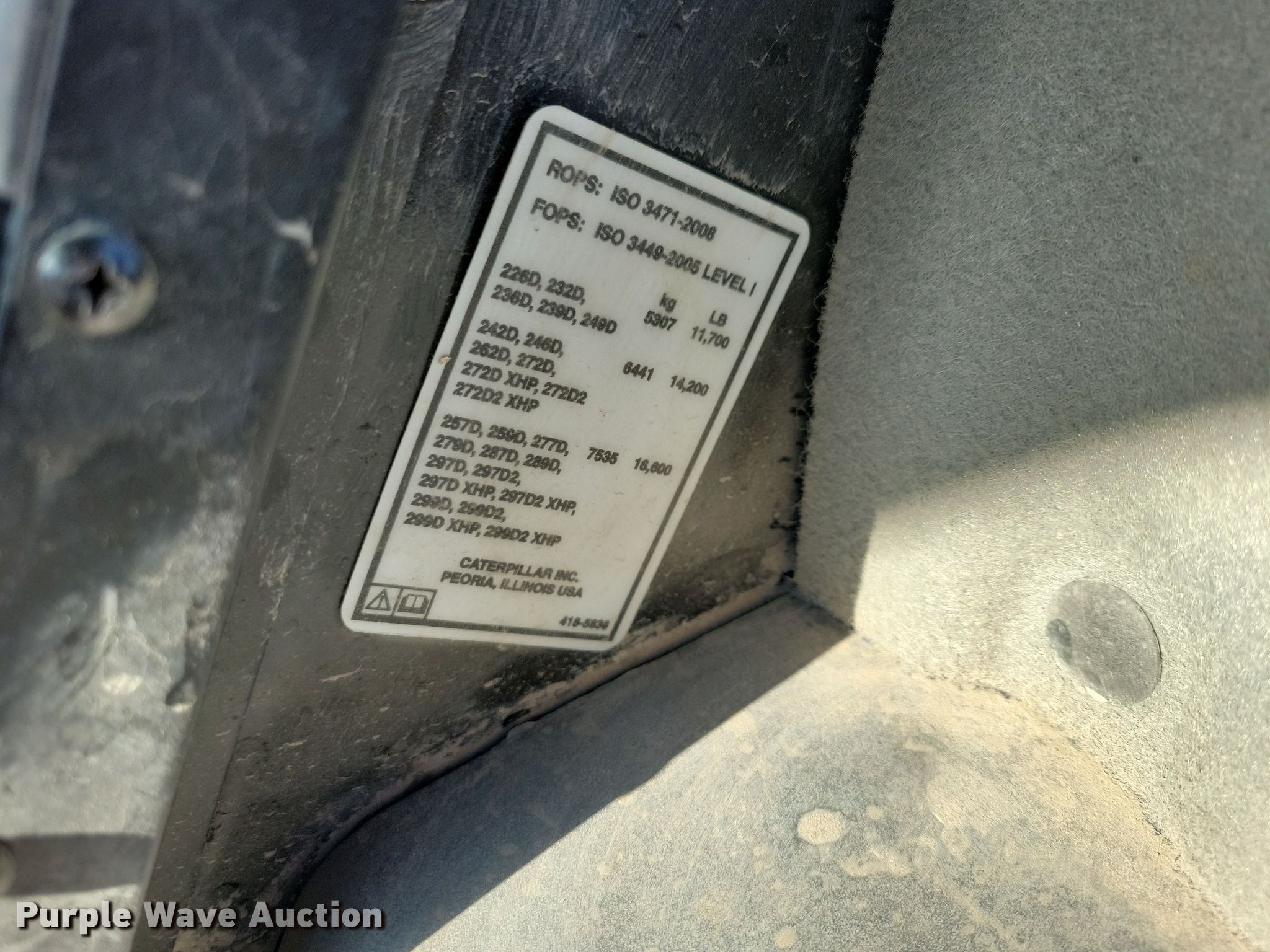 2017 Caterpillar 259D tracked skid steer loader. Serial: CAT0259DTFTL11638. Engine Caterpillar C3.3B, Serial: 8NQ7019, Displacement: 3.3L, Cylinders: 4, Fuel type: Diesel, kW: 54.6. Transmission Hydrostatic, Two speed travel. Operators station Enclosed cab, AC, Heat, Backup camera, Bucket control: Hand, Electronic Monitoring System panel. Features Auxiliary hydraulics, Auxiliary electrical outlet, Quick coupler: Hydraulic. Tracks Width: 16". Notes Service records available upon request to [email protected]. Reilly Construction. Ankeny, IA 50021