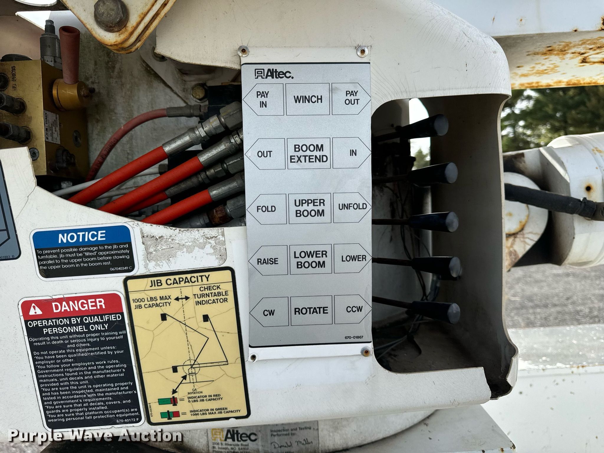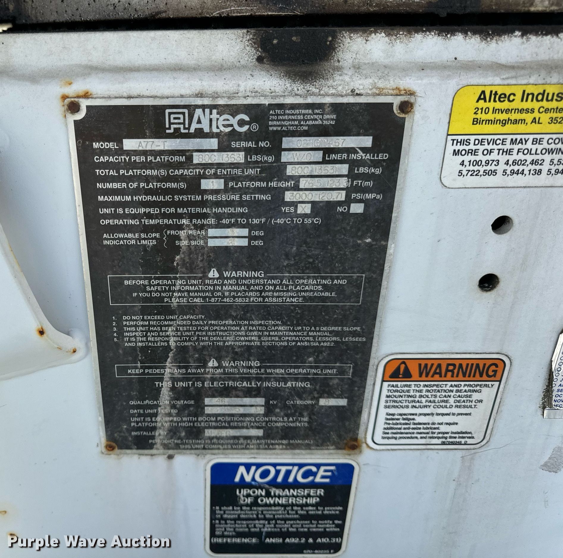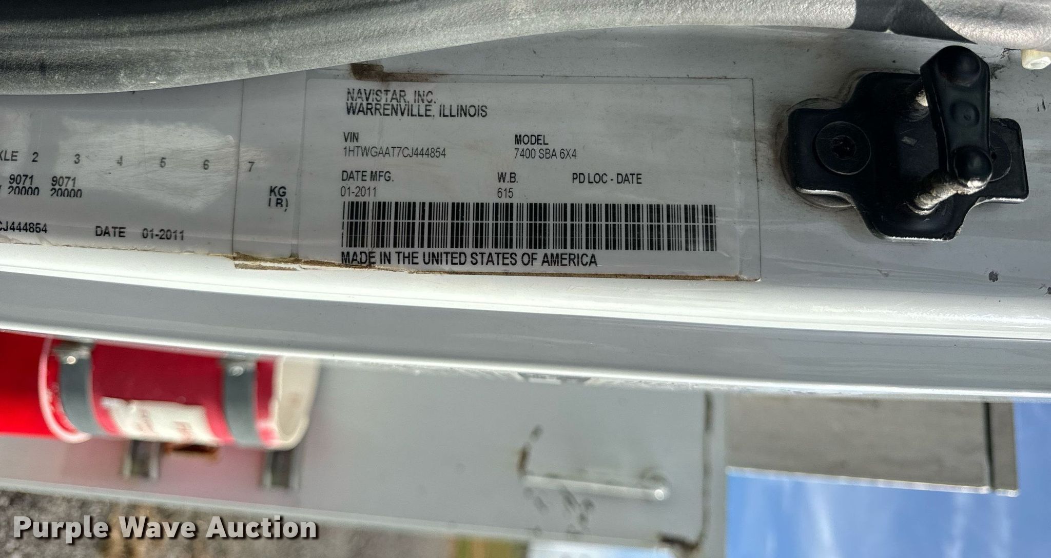 2012 International WorkStar 7400 bucket truck. Miles: 28,313 on odometer, Hours: 6,152 on meter, VIN: 1HTWGAAT7CJ444854, Unit #: 2021. Engine International Maxxforce DT, Displacement: 7.6L, Cylinders: 6, Fuel type: Diesel. Transmission Automatic. Chassis Axles: Tandem, Suspension: Spring over walking beam, Brakes: Air, PTO, GVWR: 56,000 lbs. Interior AC, Heat, Cruise control, Brake controller. Features Bed Altec, Serial: 37-18199543, 18' 8" L x 95" W, Boom Altec A77-T, Serial: 0211CT1467, Maximum lift capacity: 800 lbs, Maximum lift height: 76.5', Boom type: Articulating, Insulated, Telescopic, Man basket, Boom controls Ground, Platform/ basket, Material handler, Certification valid through: 072025. Tires Front: 315/80R22.5, Rear: 11R22.5. Indiana title. Title distribution may be delayed up to 14 days from verification of funds. Lebanon, IN 46052