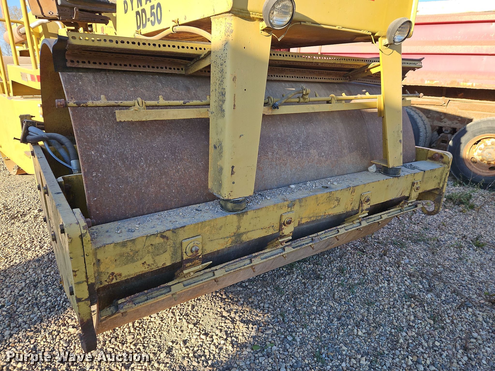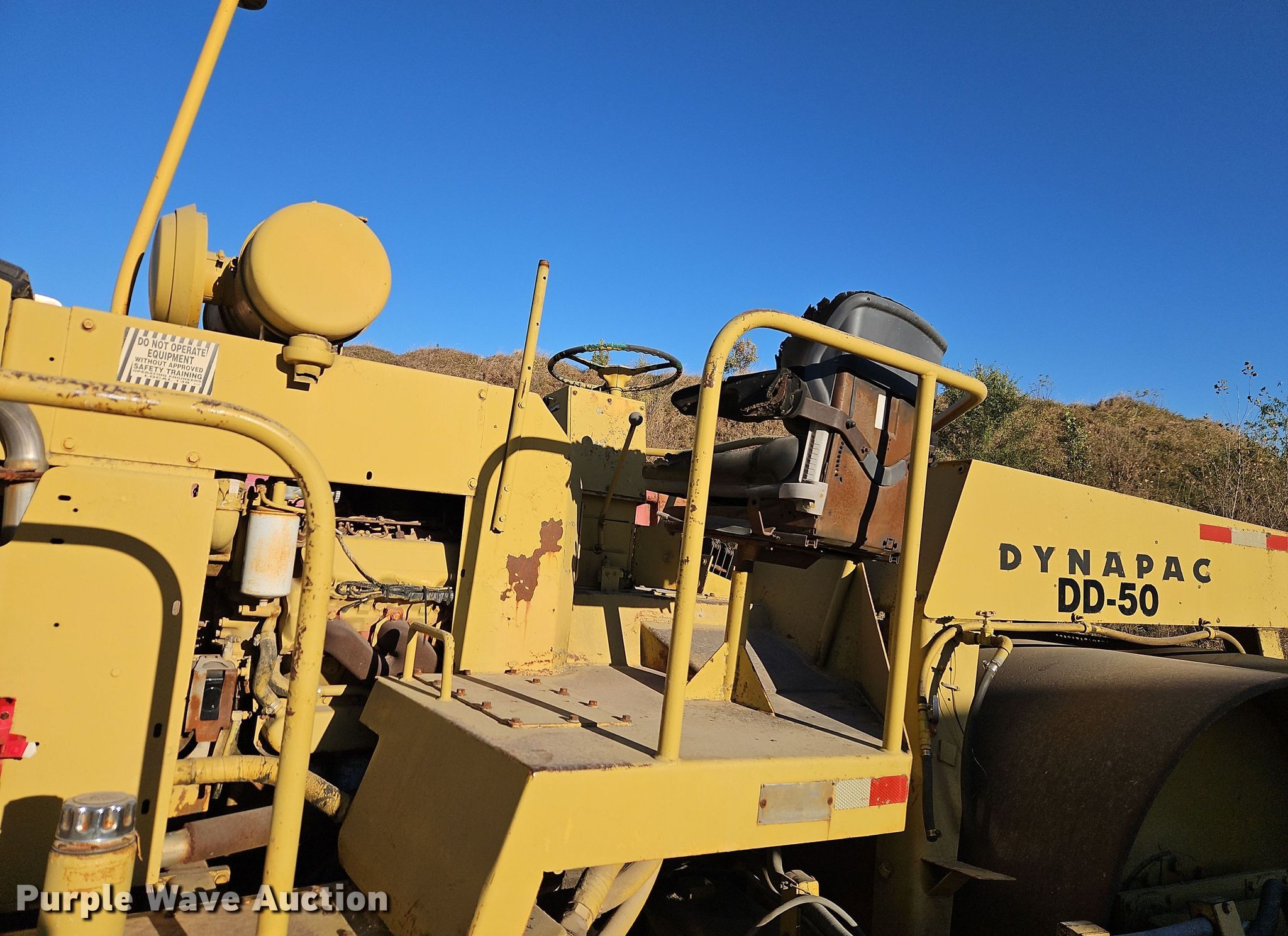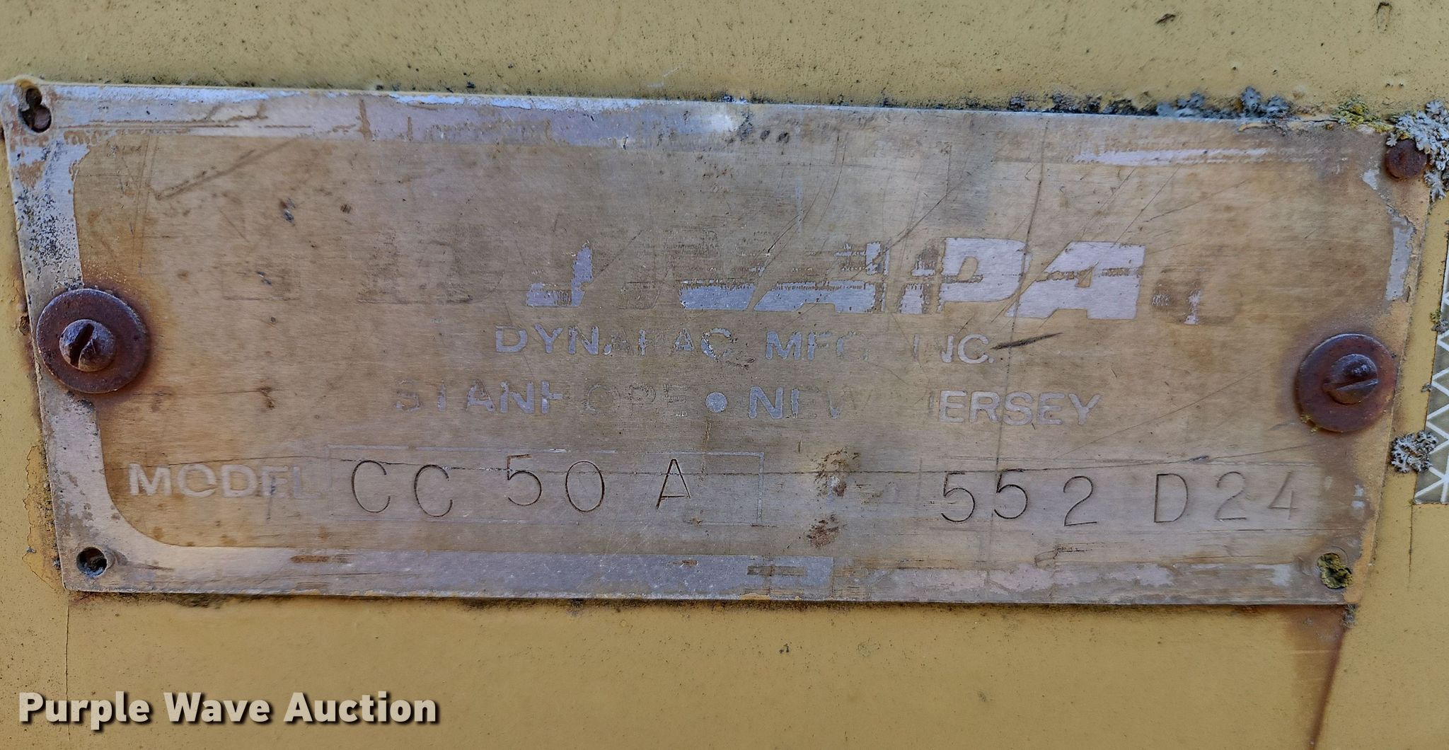 1985 Dynapac CC50A double drum vibratory roller. Hours: 3,636 on meter, Serial: 552D24. Engine Caterpillar, Cylinders: 8, Fuel type: Diesel. Transmission Hydrostatic. Features Drum: Smooth, Vibratory system: Double, Front drum Width: 84", Diameter: 60", Rear drum Width: 84", Diameter: 60", Drum scrapers: Front, Rear, Water spray applicator: Front, Rear. Notes Non-operational unit Possible hydraulic issues, hydraulic drive locked up. BMC Aggregates LC. Mason City, IA 50401