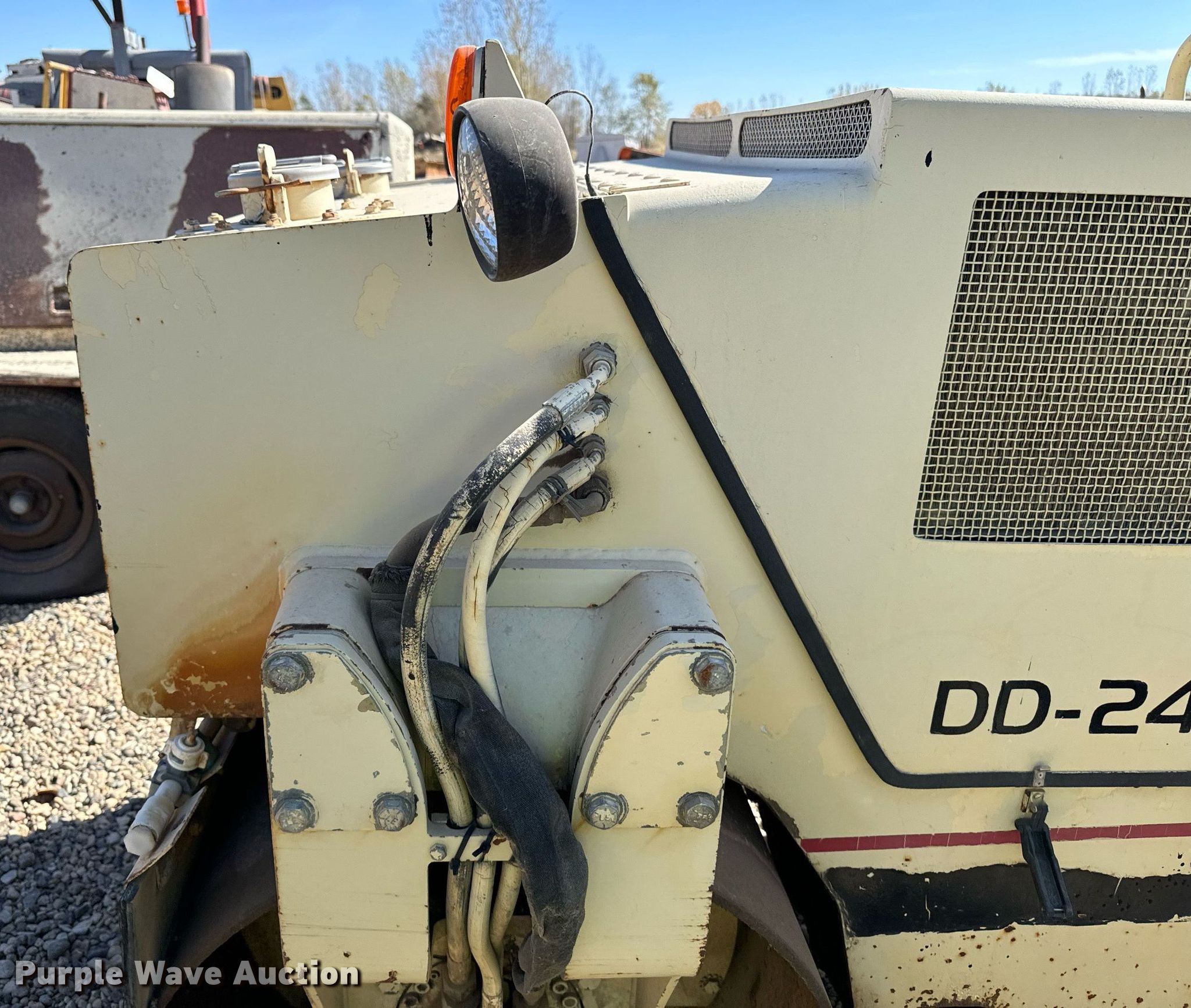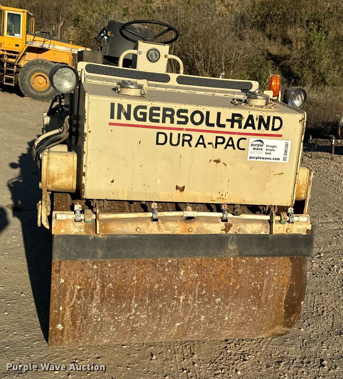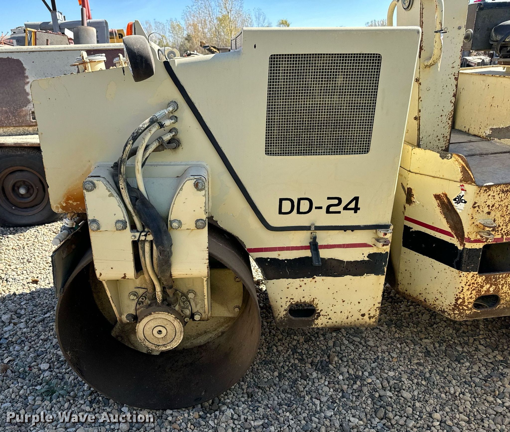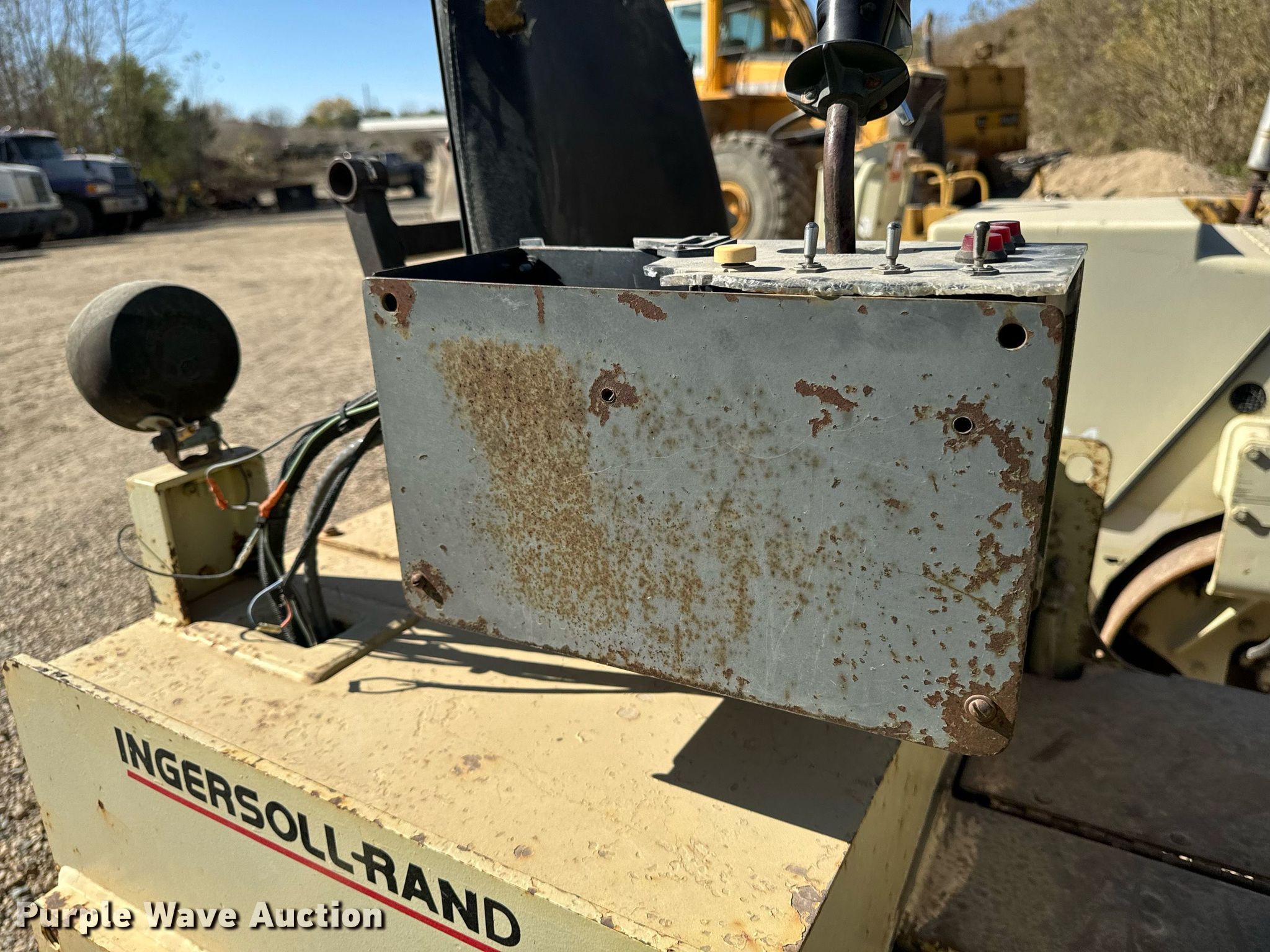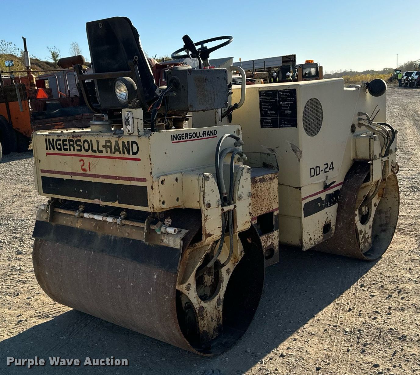 1995 Ingersoll Rand DD24 double drum vibratory roller. Hours: Unknown, Serial: 141292. Engine Deutz F3L 1011, Serial: 55033, Cylinders: 3, Fuel type: Diesel. Transmission Hydrostatic. Features Drum: Smooth, Vibratory system: Double, Front drum Width: 27", Diameter: 29", Rear drum Width: 27", Diameter: 29", Drum scrapers: Front, Rear, Water spray applicator: Front, Rear, Dual propel system. Notes Dead battery. BMC Aggregates LC. Mason City, IA 50401