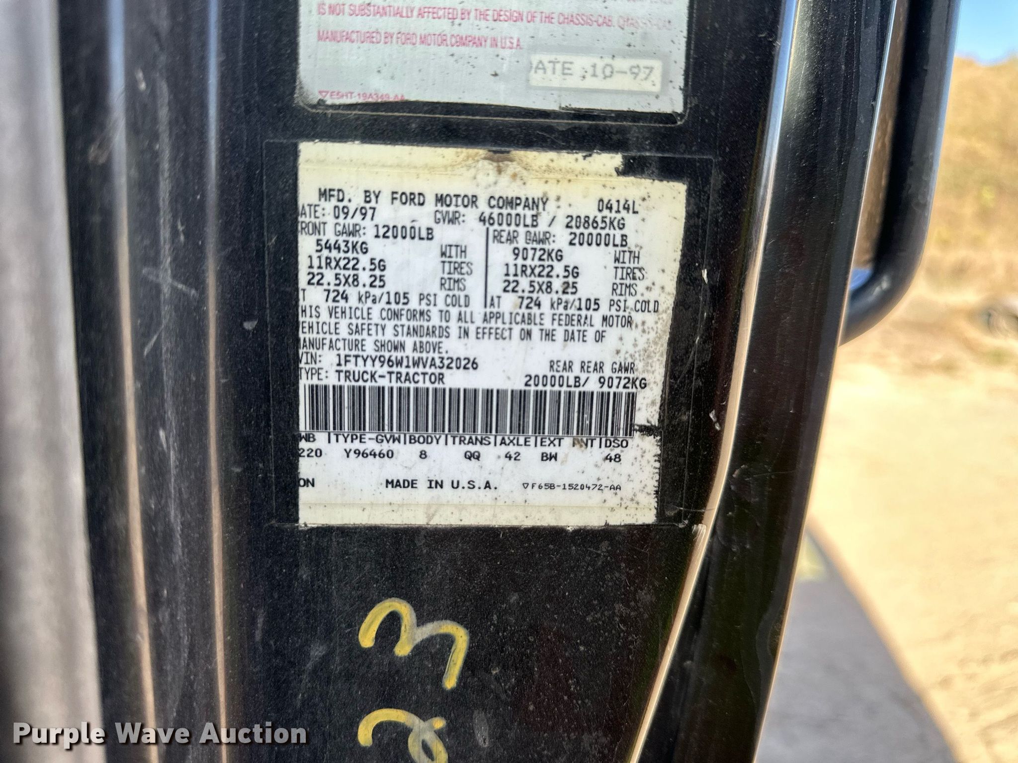 Purple Wave is selling a used Truck Tractor in Iowa. This item is a 1998 Ford AT9513 semi truck with the following: Miles: 701,113 on odometer, VIN: 1FTYY96W1WVA32026