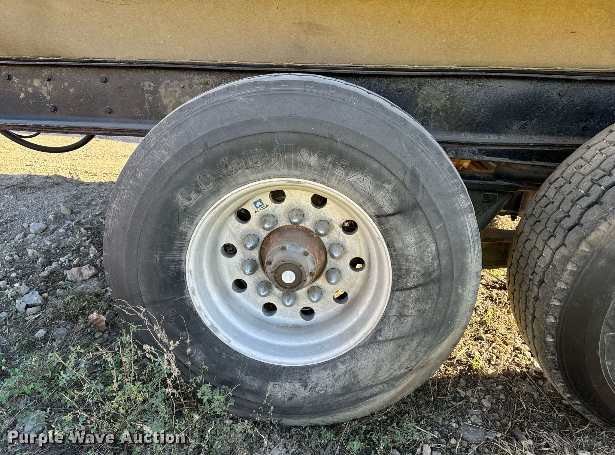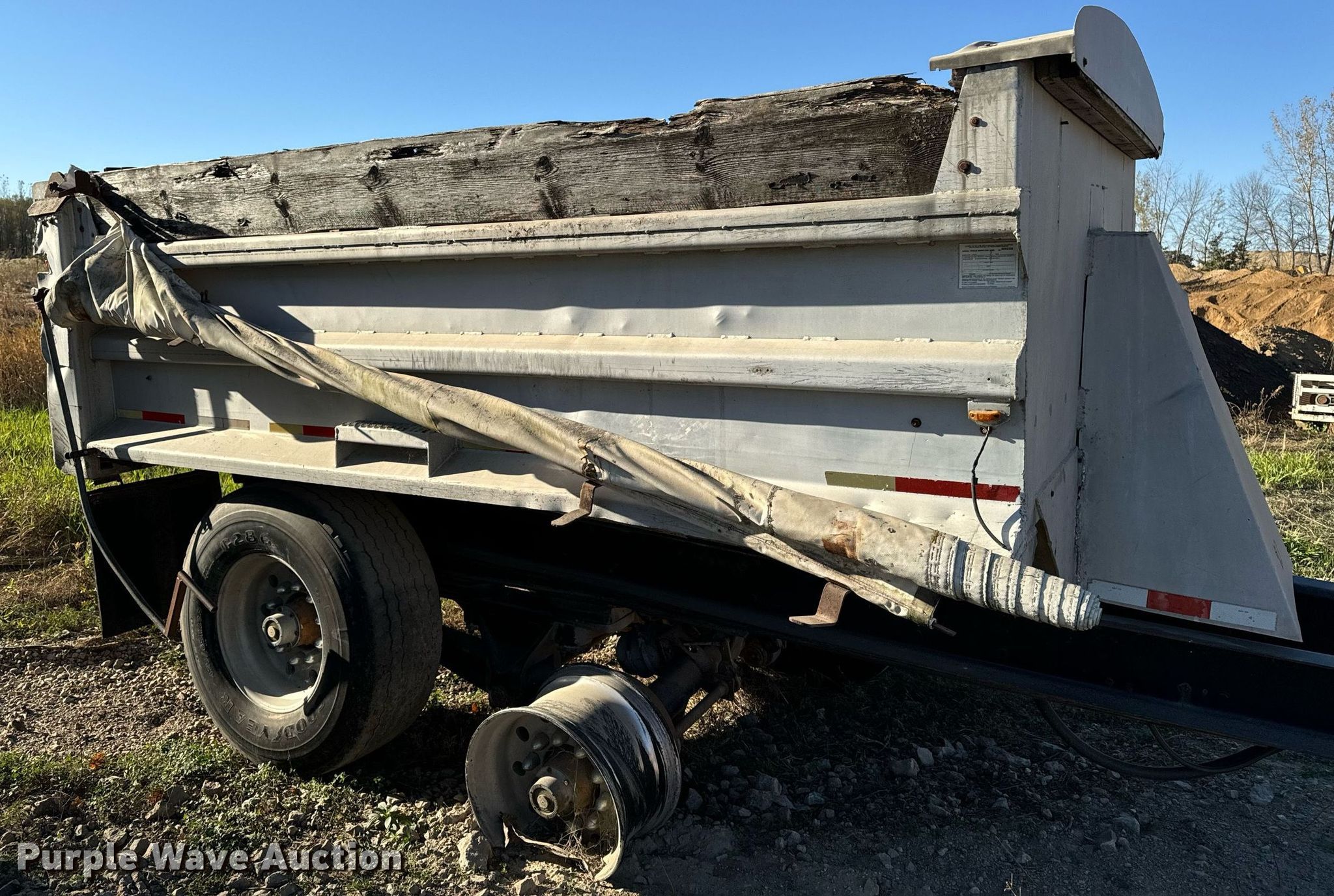 1979 Truckweld PTEVSC end dump pup trailer. VIN: TW9781728. Dimensions Overall: 30' L x 96" W, Body: 13' L x 96" W, Side height: 45", Sideboard height: 12". Features Body type: Aluminum, Ram: Single, End gate: Air operated, Roll tarp. Chassis Hitch: Pintle, Landing gear: Single, Suspension: Walking beam, Brakes: Air, Axles: Tandem. Tires Aluminum wheels, Size: 425/65R22.5. Notes Wheel and tire missing, Unknown operating condition. Iowa title. BMC Aggregates LC. Mason City, IA 50401