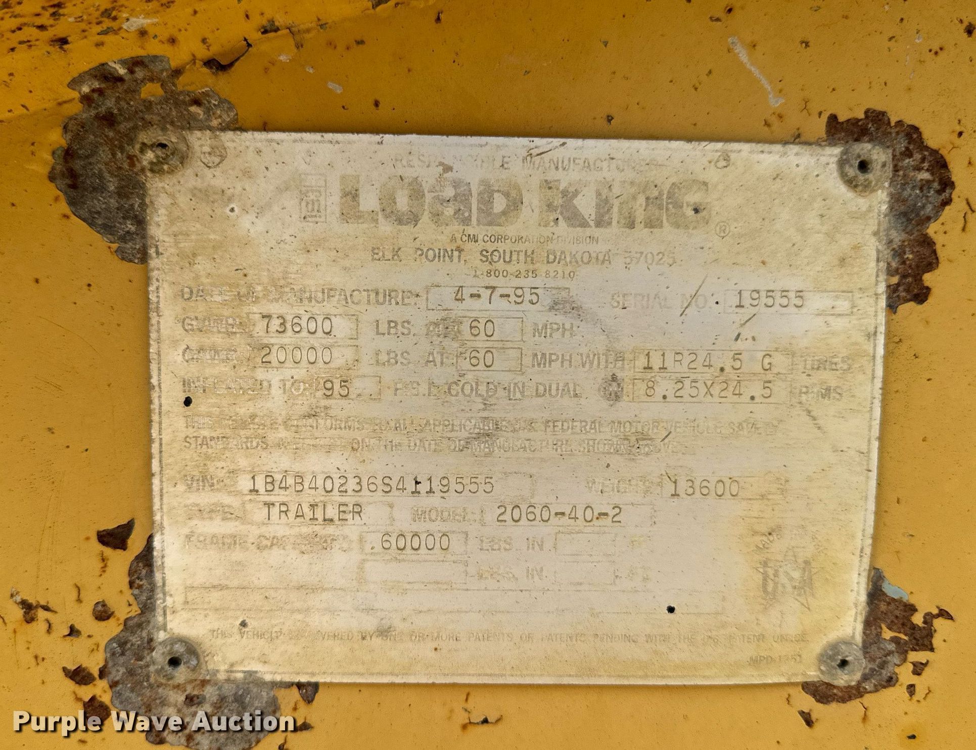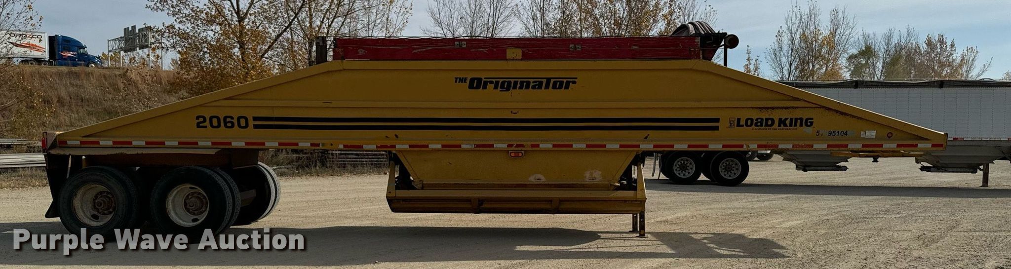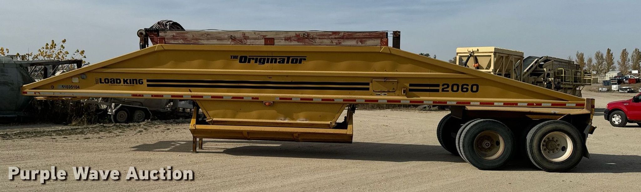 1995 Load King 2060-40-2 bottom dump trailer. VIN: 1B4B40236S4119555, Unit #: 51095104. Dimensions Overall: 40' L x 102" W, Side height: 60", Sideboard height: 12". Features Ton capacity: 30, Body type: Steel, Ram: Dual, Clamshell gate: Air operated, Rear push block, Roll tarp. Chassis Landing gear: Dual, Suspension: Walking beam, Brakes: Air, Axles: Tandem, GVWR: 73,600 lbs, GAWR: 20,000 lbs. Tires Steel wheels, Size: 11R22.5. Notes Unknown operating condition of roll tarp. Iowa title. Title distribution may be delayed up to 30 days from verification of funds. Croell Inc. New Hampton, IA 50659