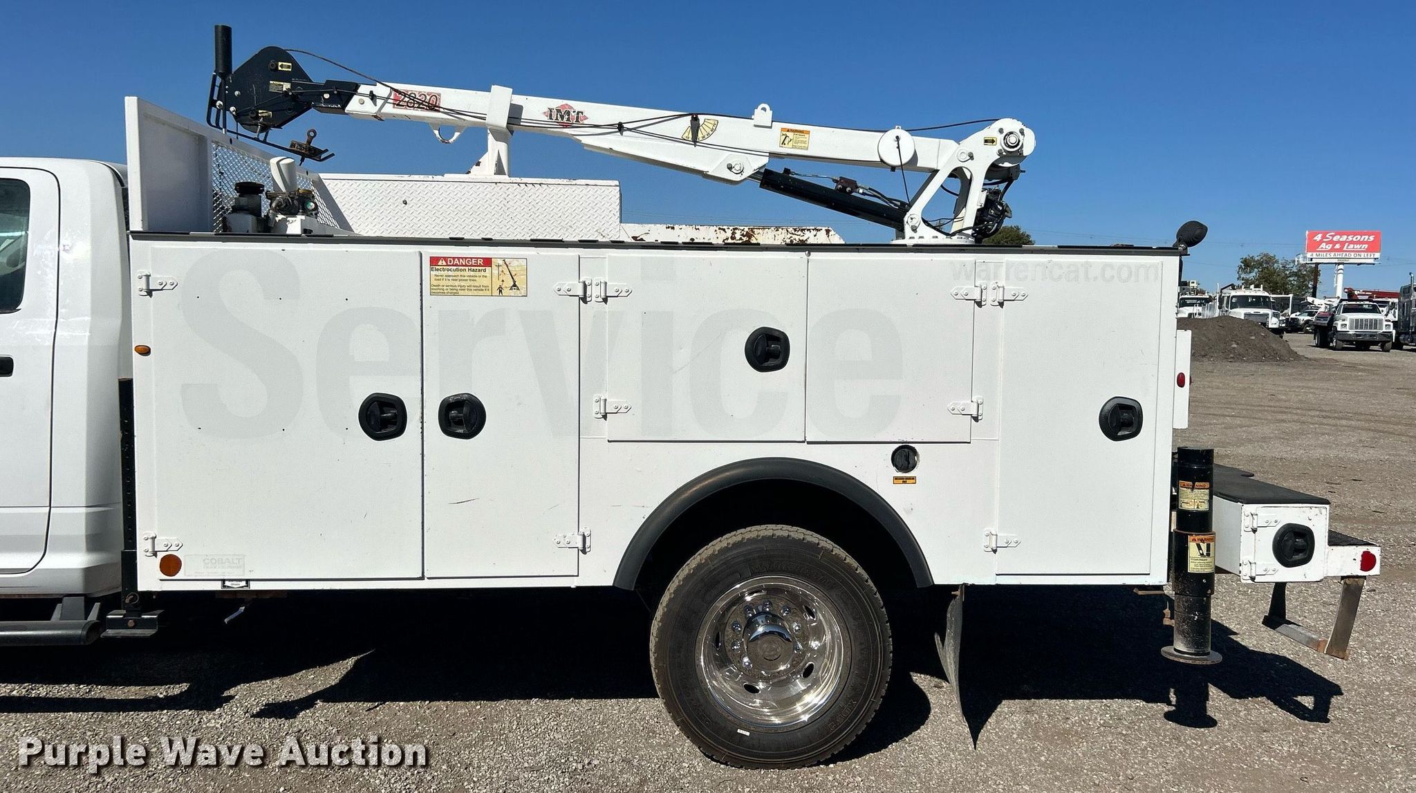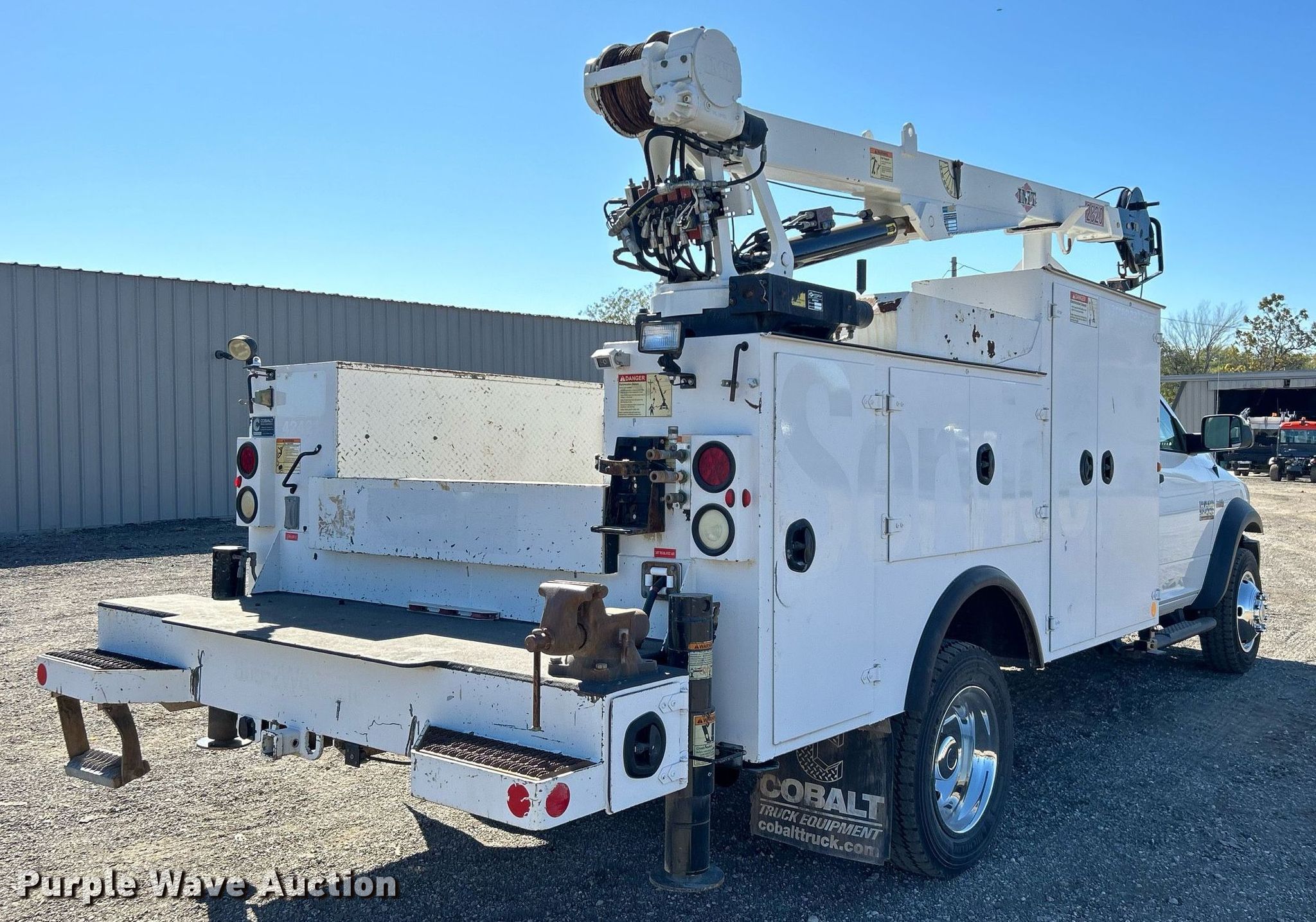 2018 Dodge Ram 5500HD utility / service truck. Miles: 155,703 on odometer, VIN: 3C7WRMBJXJG179709. Engine Displacement: 6.4L V8 OHV, Cylinders: 8, Fuel type: Gas. Transmission Automatic. Chassis Axles: Single, Suspension: Spring, Brakes: Hydraulic, GVWR: 19,500 lbs. Interior AC, Heat, Heated mirrors, Power windows, Power locks, Cruise control, Auxiliary controls, Brake controller. Features Bed Cobalt Truck Equipment, 10' 11" L x 94" W, Crane IMT 2820, Maximum boom length: 22' Maximum lift capacity: 5,000 lbs.. Tires Size: 225/70R19.5. Notes Windshield chipped or cracked, Drivers side mirror cracked, Unknown operating condition of crane. Oklahoma title. Collinsville, OK 74021