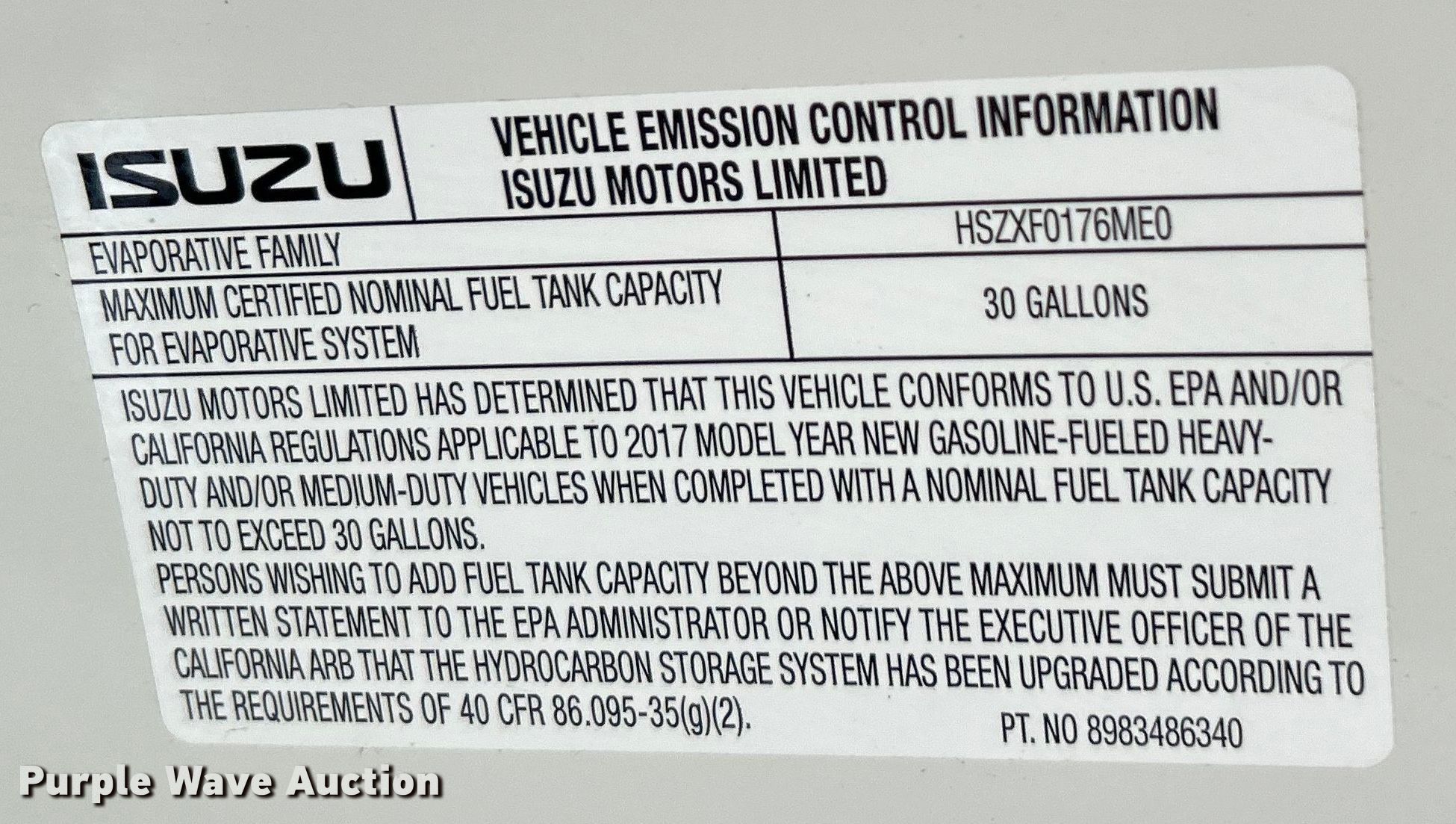 2017 Isuzu NPR HD Crew Cab utility / service truck. Miles: 87,492 on odometer, VIN: 54DC4J1B3HS808717. Engine Displacement: 6.0L, Cylinders: 8, Fuel type: Gas. Transmission Automatic. Chassis Axles: Single, Suspension: Spring, Brakes: Hydraulic, GVWR: 14,500 lbs. Interior AC, Heat, Power windows, Power locks, Cruise control. Features Bed Supreme Corp, 14' 8" L x 95" W. Tires Size: 225/70R19.5. Oklahoma title. Title distribution may be delayed up to 14 days from verification of funds. 15107 North 137th East Avenue. Collinsville, OK 74021