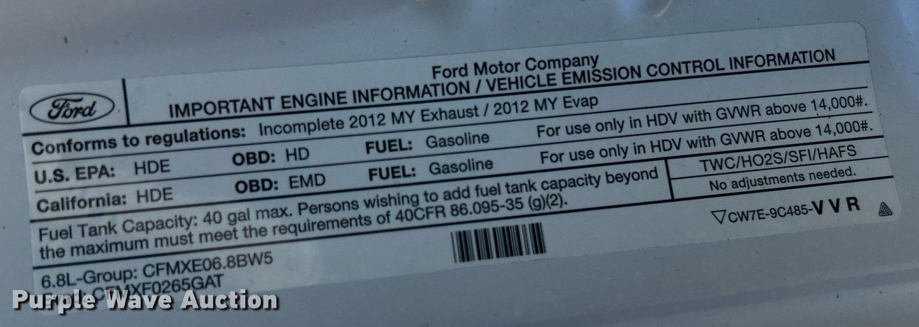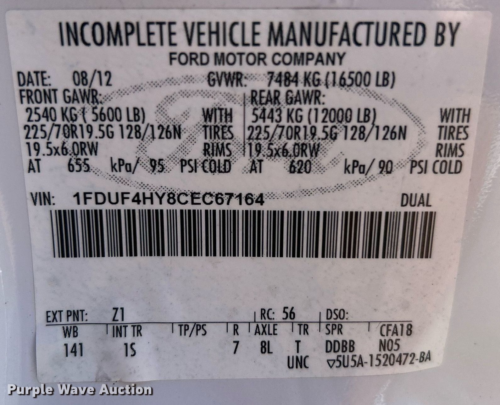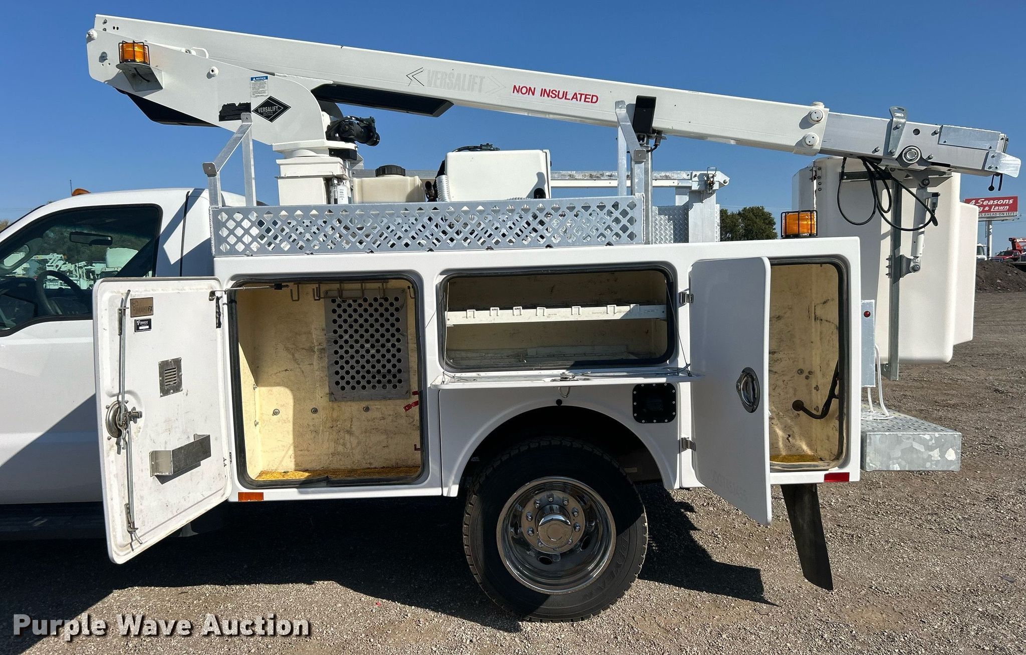 2012 Ford F450 Super Duty bucket truck. Miles: 184,028 on odometer, VIN: 1FDUF4HY8CEC67164. Engine Displacement: 6.8L V10 SOHC, Cylinders: 10, Fuel type: Gas. Transmission Automatic. Chassis Four wheel drive, Axles: Single, Suspension: Spring, Brakes: Hydraulic, GVWR: 16,500 lbs, Wheelbase: 141". Interior AC, Heat. Features Bed 9' L x 96" W, Boom Versalift, Boom type: Articulating, Telescopic, Boom controls Ground, Generator Onan 5.5HGJAD-2558E, Phase: Single, kW: 5.5, kVA: 5.5, Fuel type: Gas. Tires Size: 225/70R19.5. Notes Boom data plate missing, possible certification issue. Oklahoma title. Collinsville, OK 74021