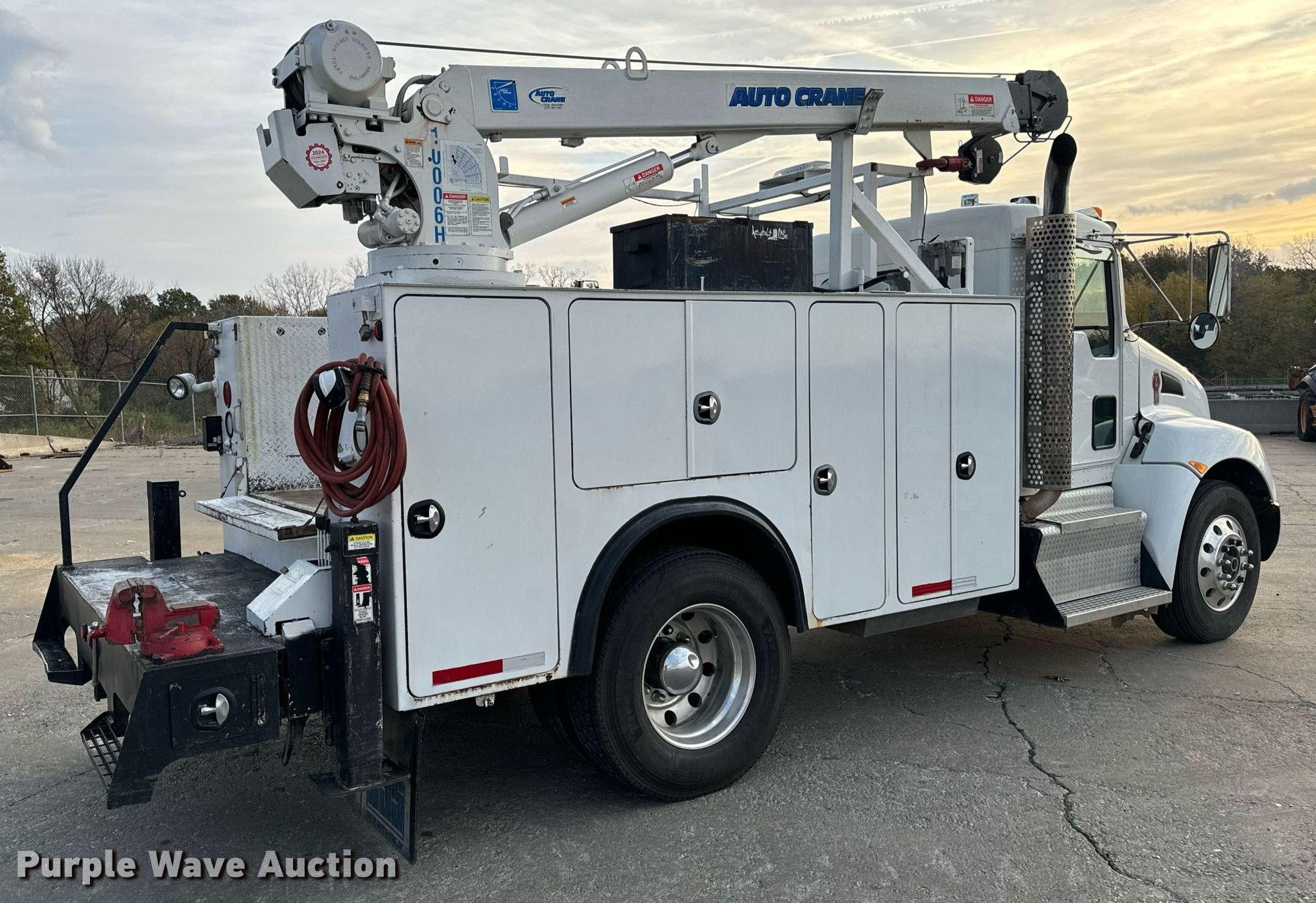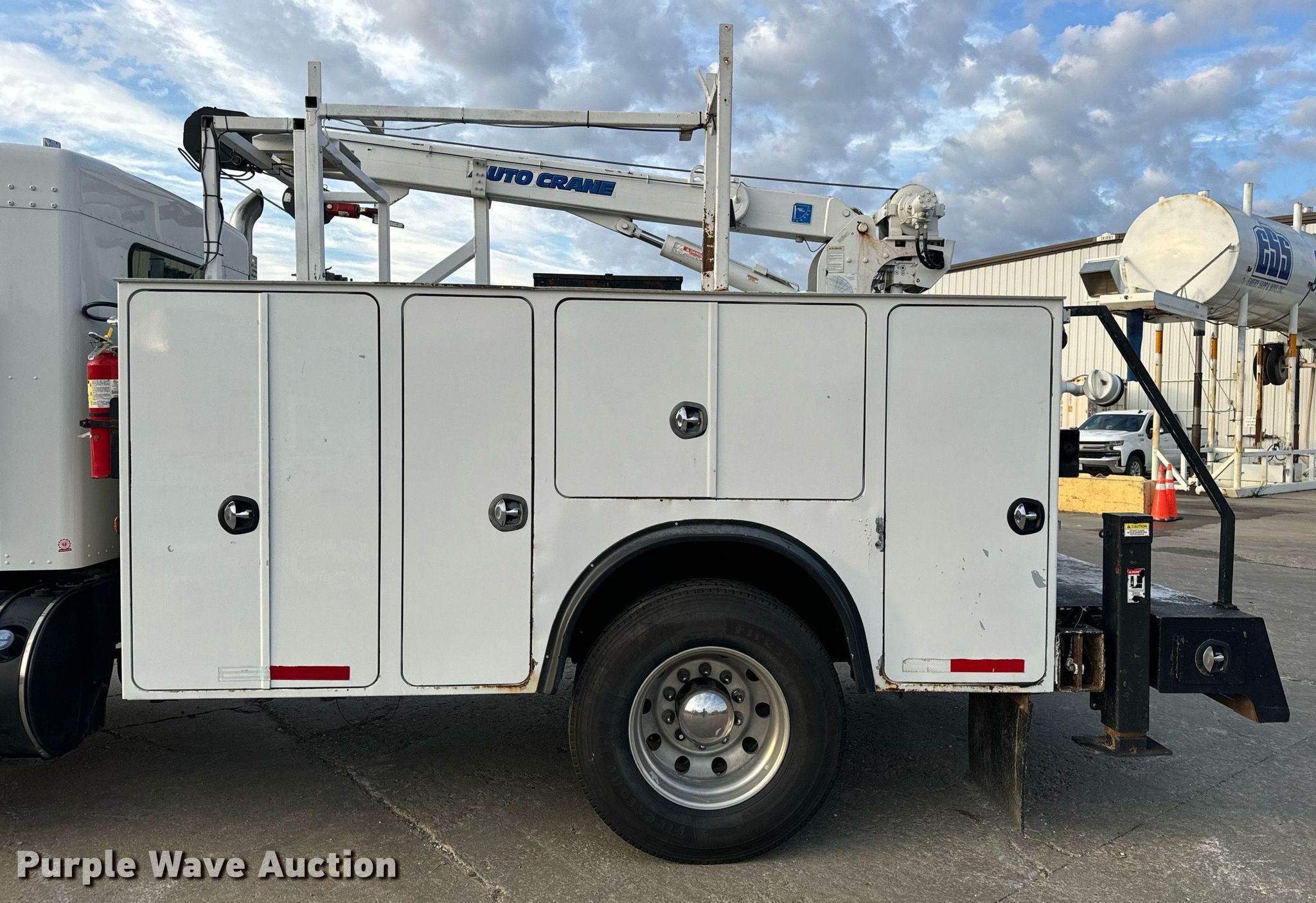 2013 Kenworth T3 Series utility / service truck. Miles: 186,370 on odometer, Hours: 13,860 on meter, VIN: 2NKHHM6X8DM356579, Unit #: 5-194. Engine Paccar PX-6 325, Serial: 73406888, Displacement: 6.7L, Cylinders: 6, Fuel type: Diesel, HP: 325. Transmission Eaton Fuller FS08406A, Manual, Speed: 6. Chassis Axles: Single, Suspension: Spring, Brakes: Air, PTO, GVWR: 26,000 lbs. Interior AC, Heat, Heated mirrors, Power windows, Power locks, Cruise control. Features Bed 11' 1" L x 96" W, Torch bottle rack, Crane Auto Crane 1006H, Maximum boom length: 24.6' Maximum lift capacity: 10,000 lbs.. Tires Size: 295/75R22.5. Notes Air hose reel issue, will not rewind, Tailgate issue, will not latch. Missouri title. Title distribution may be delayed up to 30 days from verification of funds. Emery Sapp & Sons, Inc... Columbia, MO 65202