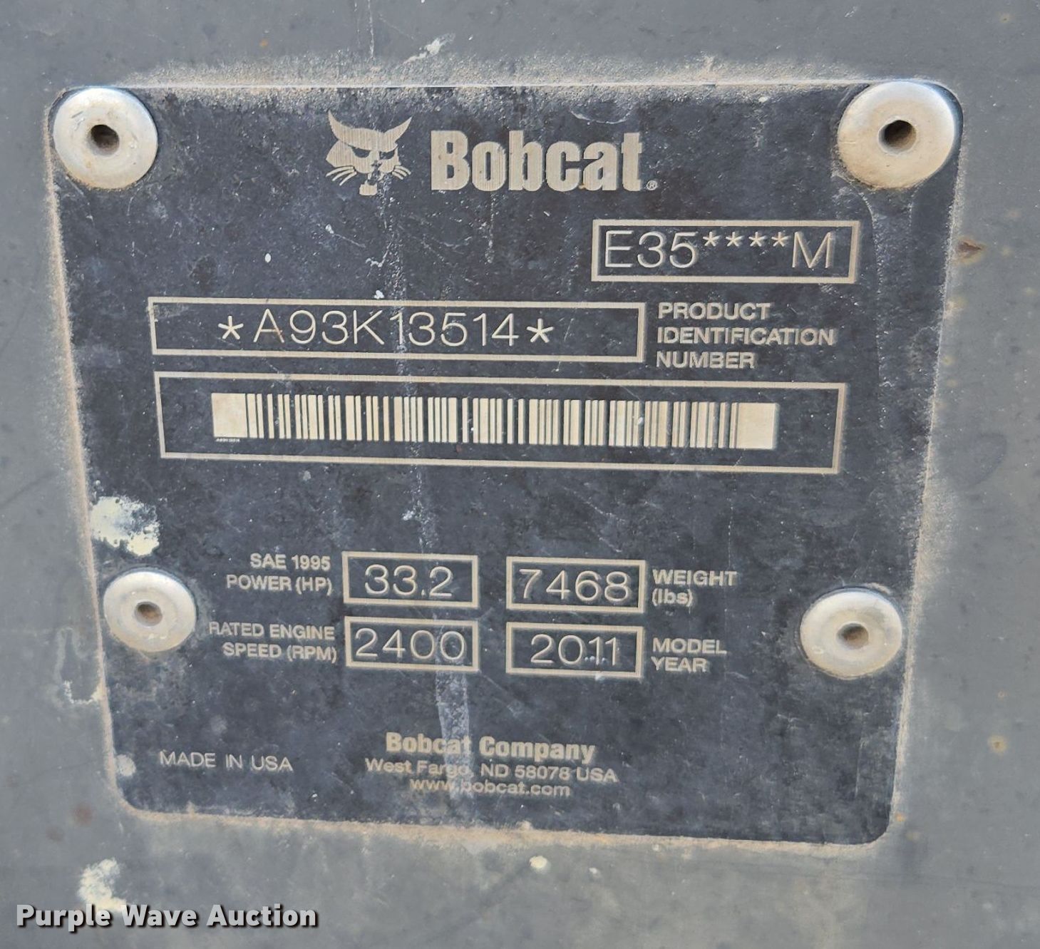 Purple Wave is selling a used Mini Excavator in Kansas. This item is a 2011 Bobcat E35 mini excavator with the following: Hours: 2,288 on meter, Serial: A93K13514
