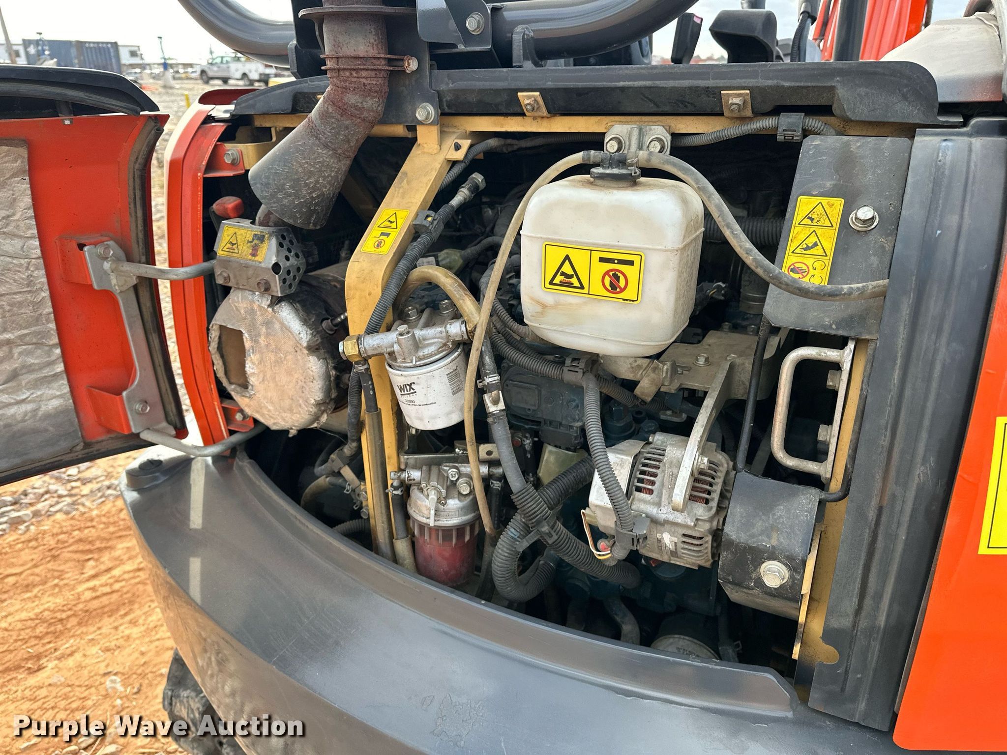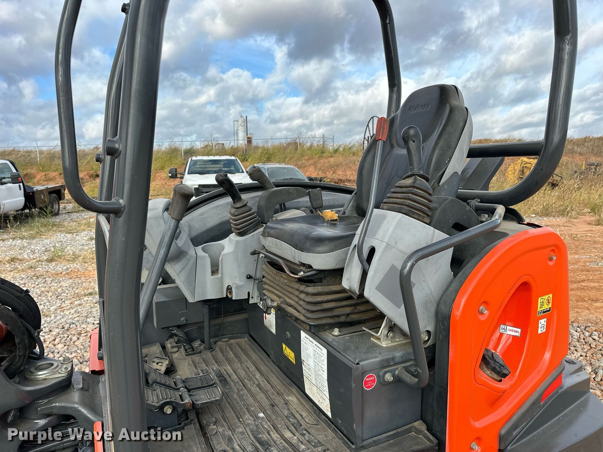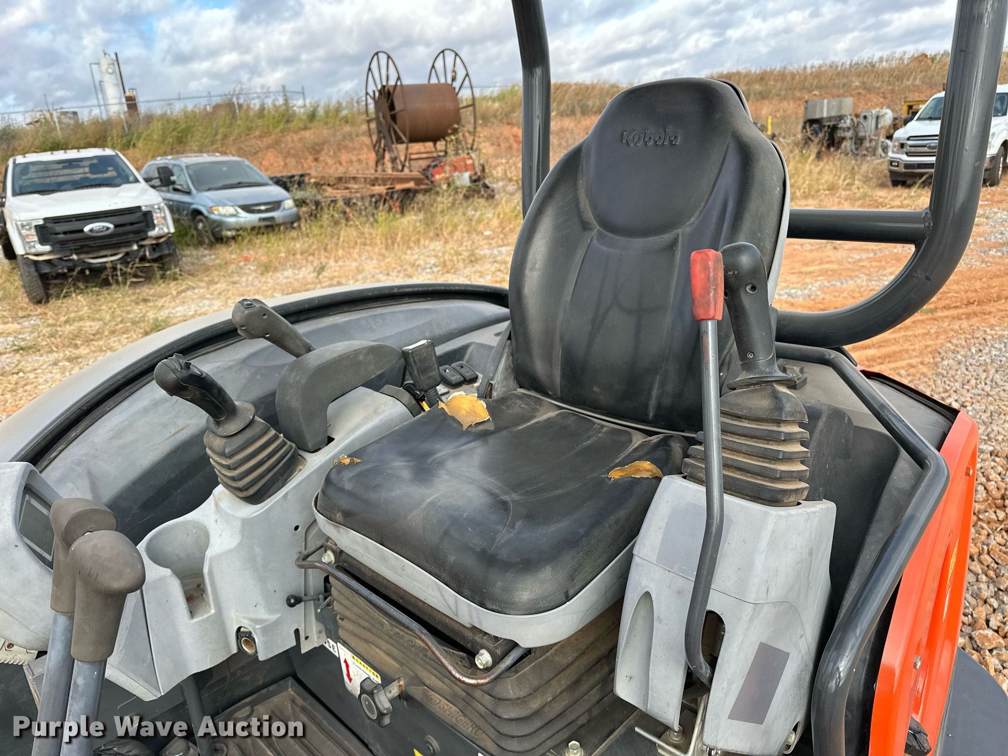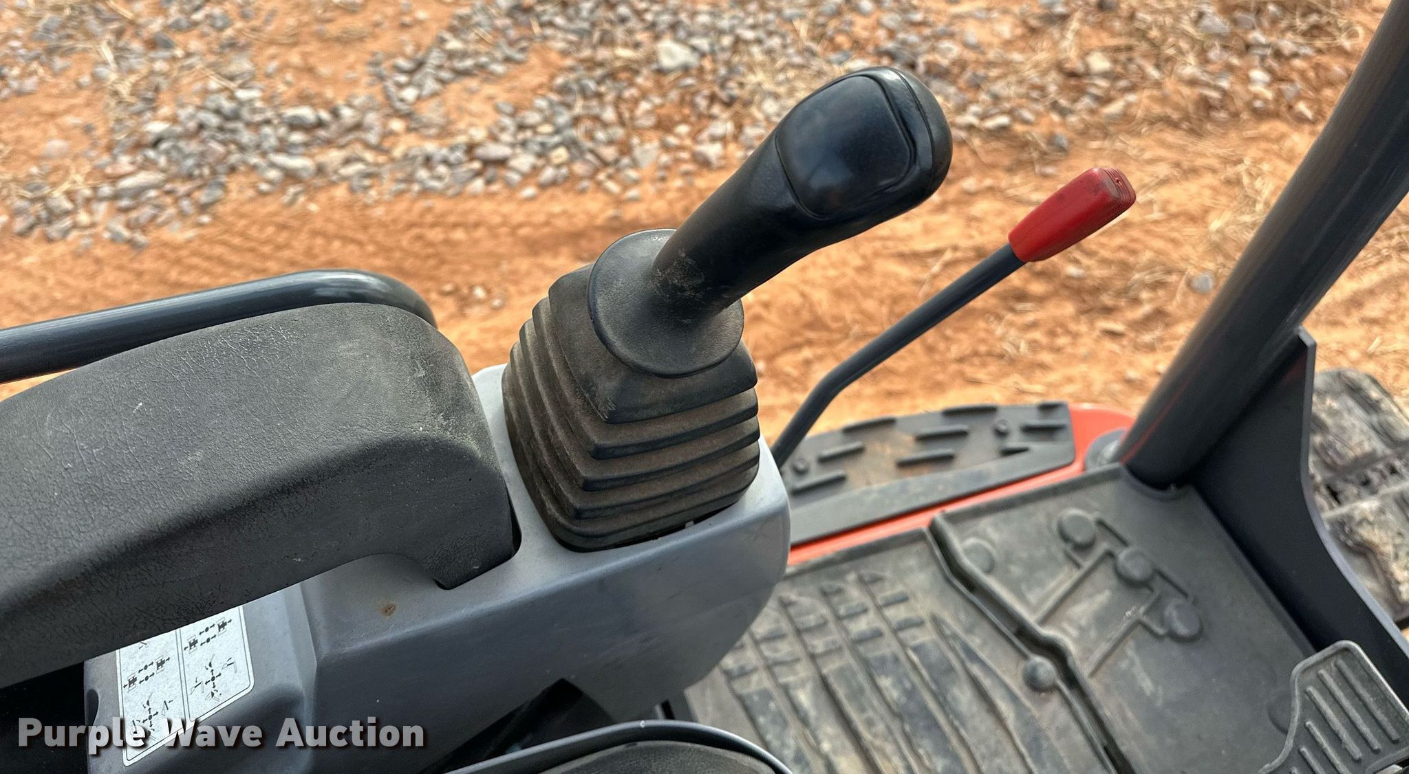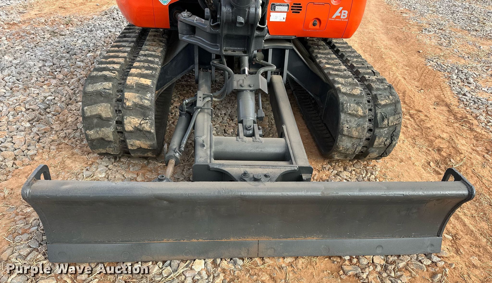 2015 Kubota KX040-4 mini excavator. Hours: 3,682 on meter, Serial: JKUK0404C01H22386. Engine Kubota D1B03, Displacement: 1.8L, Cylinders: 3, Fuel type: Diesel. Transmission Hydrostatic, Two speed travel. Operators station OROPS, Pattern changer. Features Auxiliary hydraulics Standard, Two-way, Counter weights, Backfill blade Width: 67", Boom Swing, Stick Stick length: 5' 4", Quick coupler: Mechanical, Bucket Width: 18", Cutting edge: Weld-on, Teeth: 4. Tracks Width: 14", Rubber. Norman, OK 73072