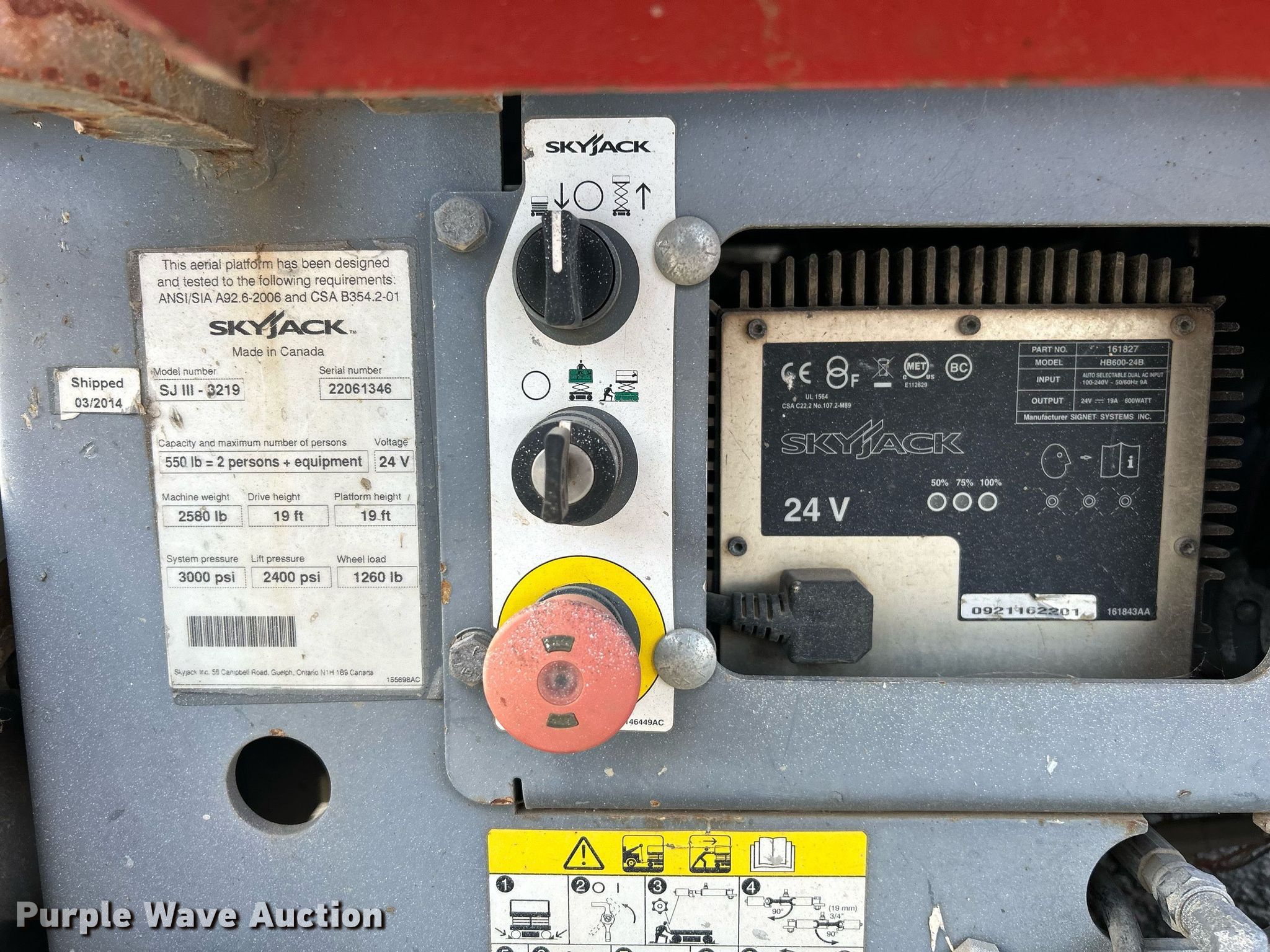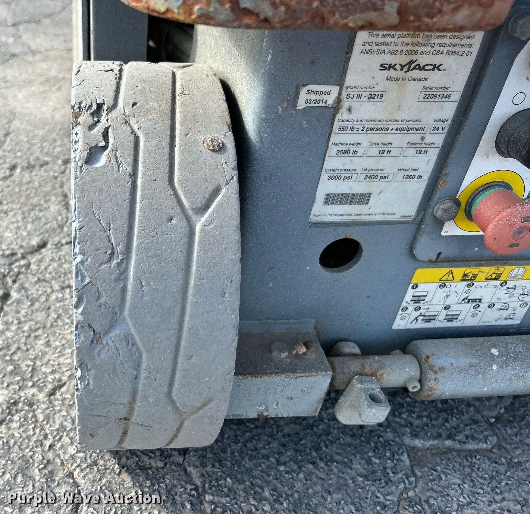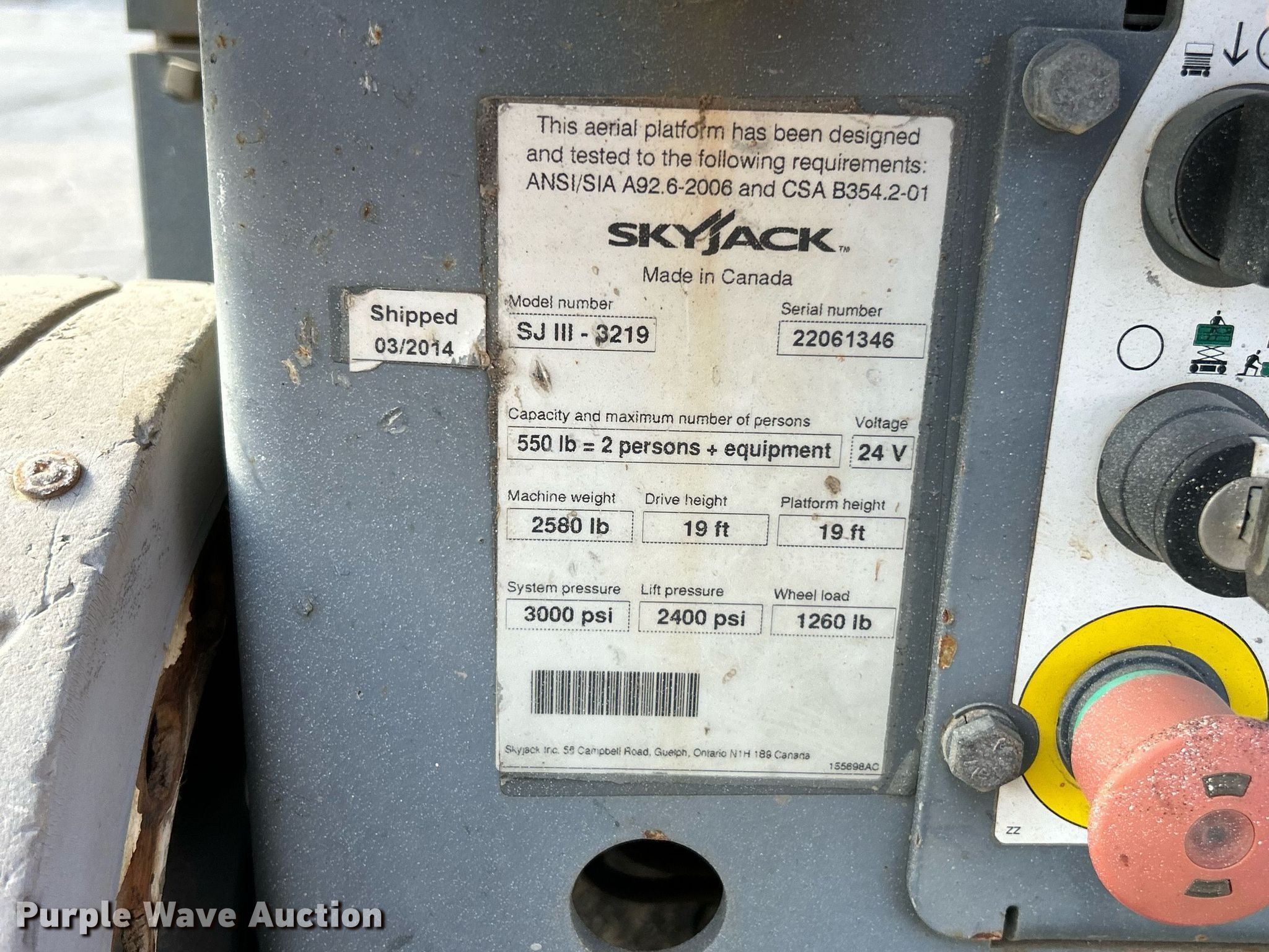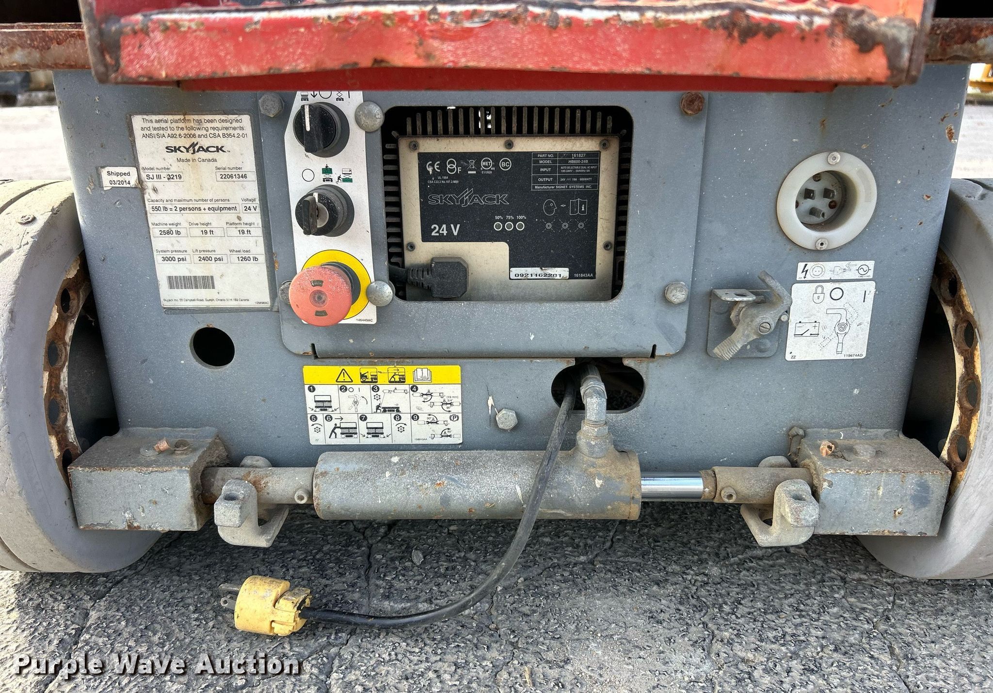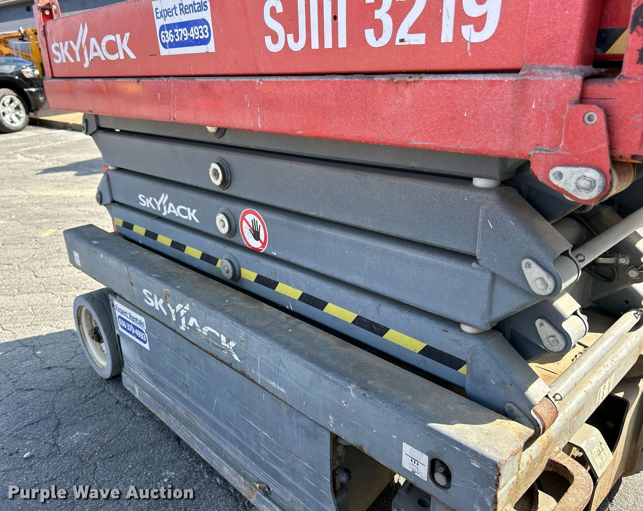 2014 Skyjack SJ III 3219 scissor lift. Hours: 174 on meter, Serial: 22061346. Electric Motor Volts: 24. Features Maximum lift capacity: 550 lbs, Maximum lift height: 19', Platform: 64" L x 29" W, AC power outlet, Controls: Platform, Ground, Platform extensions: Manual. Tires Tire size: 12x4, Solid. Expert Rentals. Saint Peters, MO 63376
