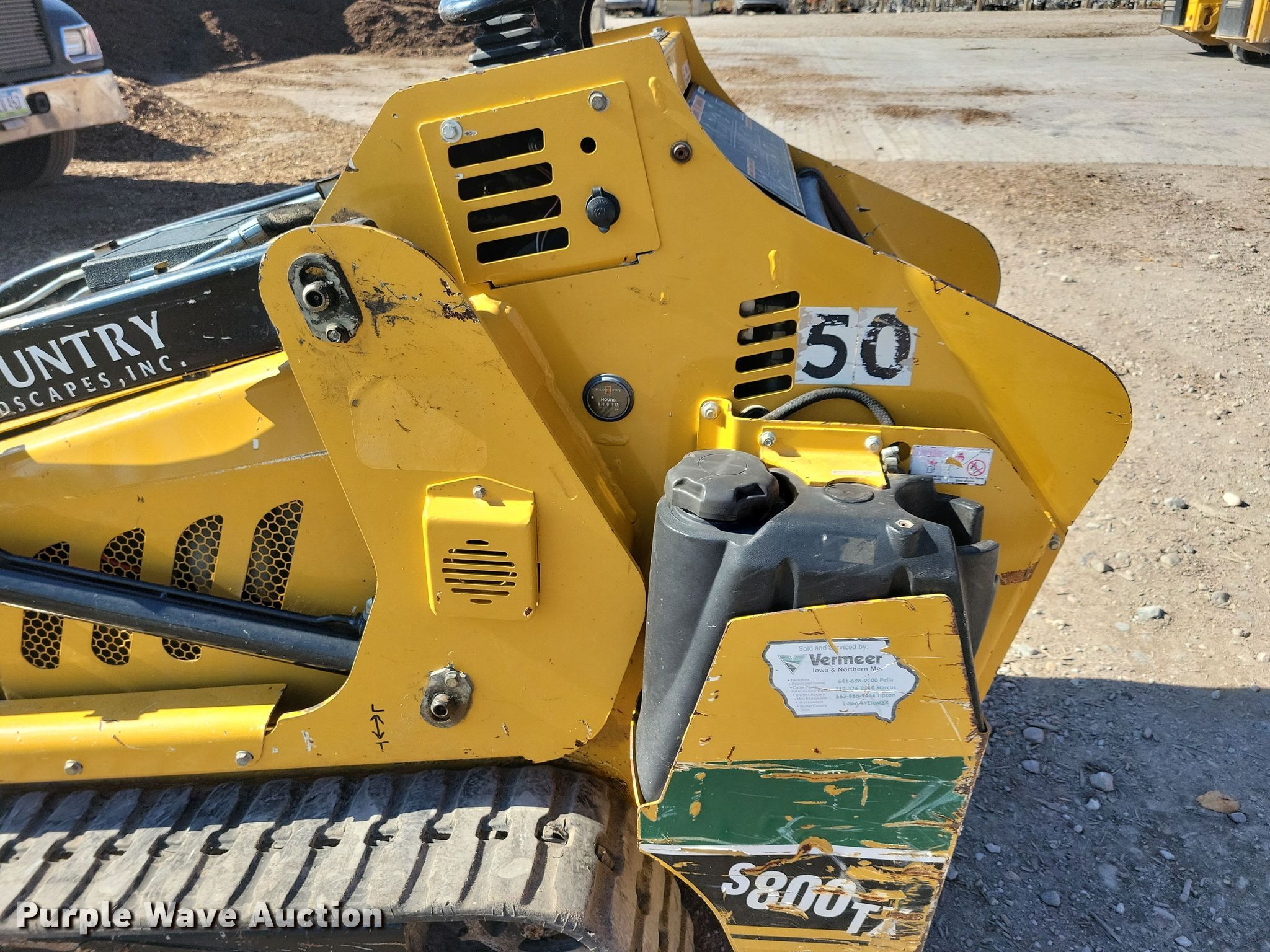 2014 Vermeer S800TX compact utility loader. Hours: 601 on meter, Serial: 1VRB070A6E1002105, Unit #: 50. Engine Kubota WG1605, Displacement: 1.5L, Cylinders: 3, Fuel type: Gas. Transmission Hydrostatic. Operators station Bucket control: Hand. Features Auxiliary hydraulics, Quick coupler: Manual, Bucket Width: 43", Low profile. Tracks Width: 9". Country Landscapes, Inc.. Ames, IA 50010