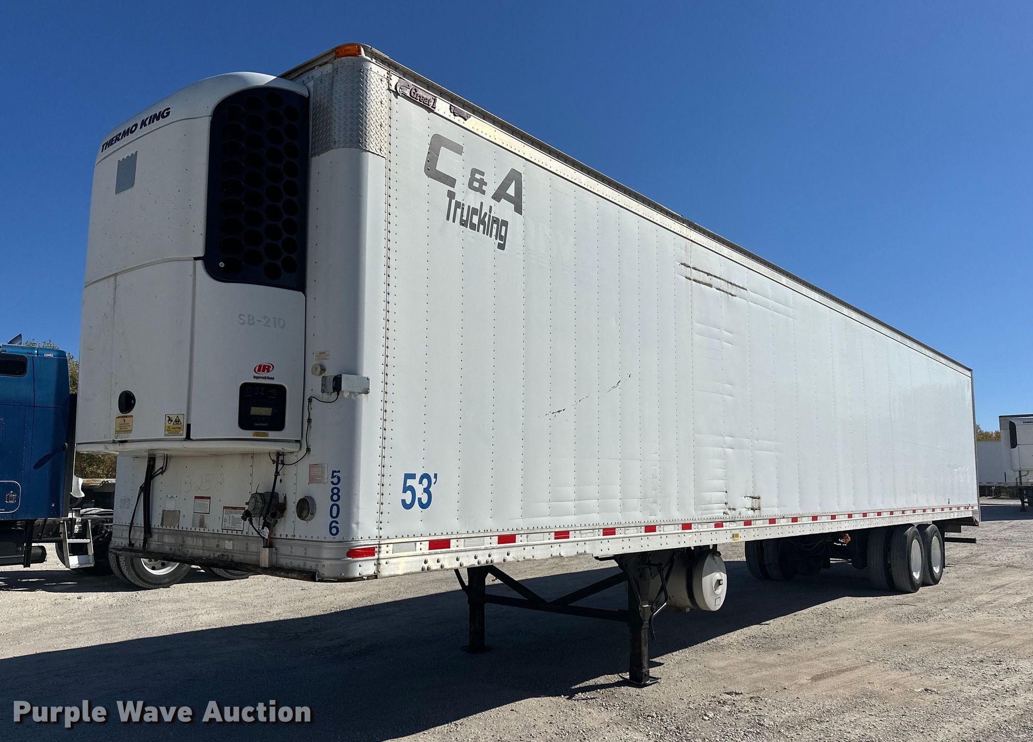 2008 Great Dane refrigerated van trailer. VIN: 1GRAA06238B706640. Dimensions Overall: 53' L x 102" W. Features Deck type: Aluminum, Refrigeration unit Thermo King SB-210, Hours: 21,373, Serial: 6001024629. Chassis Landing gear: Dual, Suspension: Air, Brakes: Air, Axles: Tandem Sliding, GVWR: 68,000 lbs, GAWR: 20,000 lbs. Tires Steel wheels, Size: 275/80R22.5. Oklahoma title. Title distribution may be delayed up to 14 days from verification of funds. C&A Trucking. Sapulpa, OK 74066