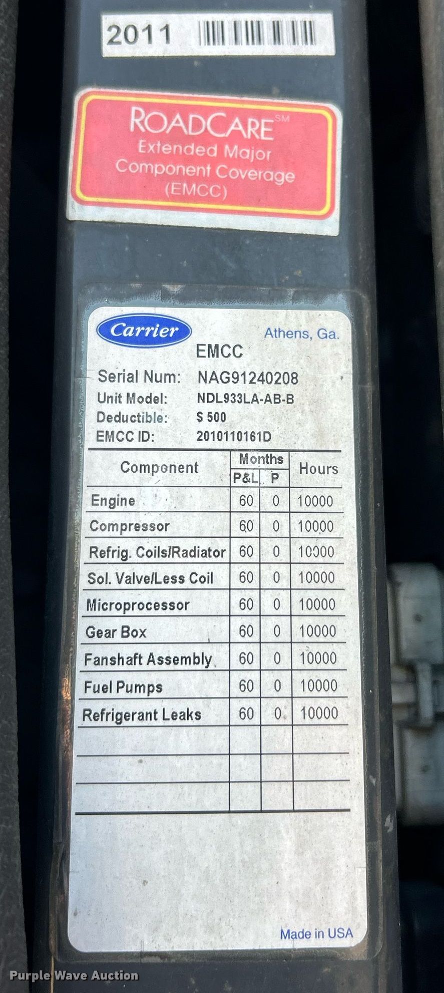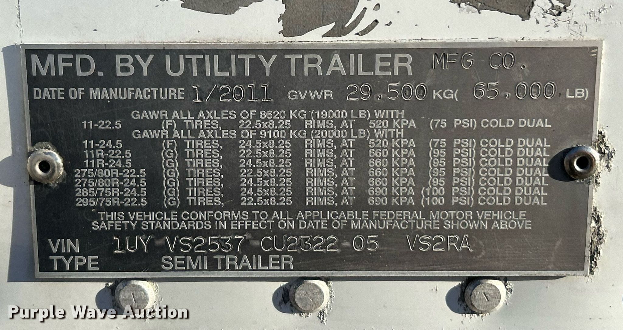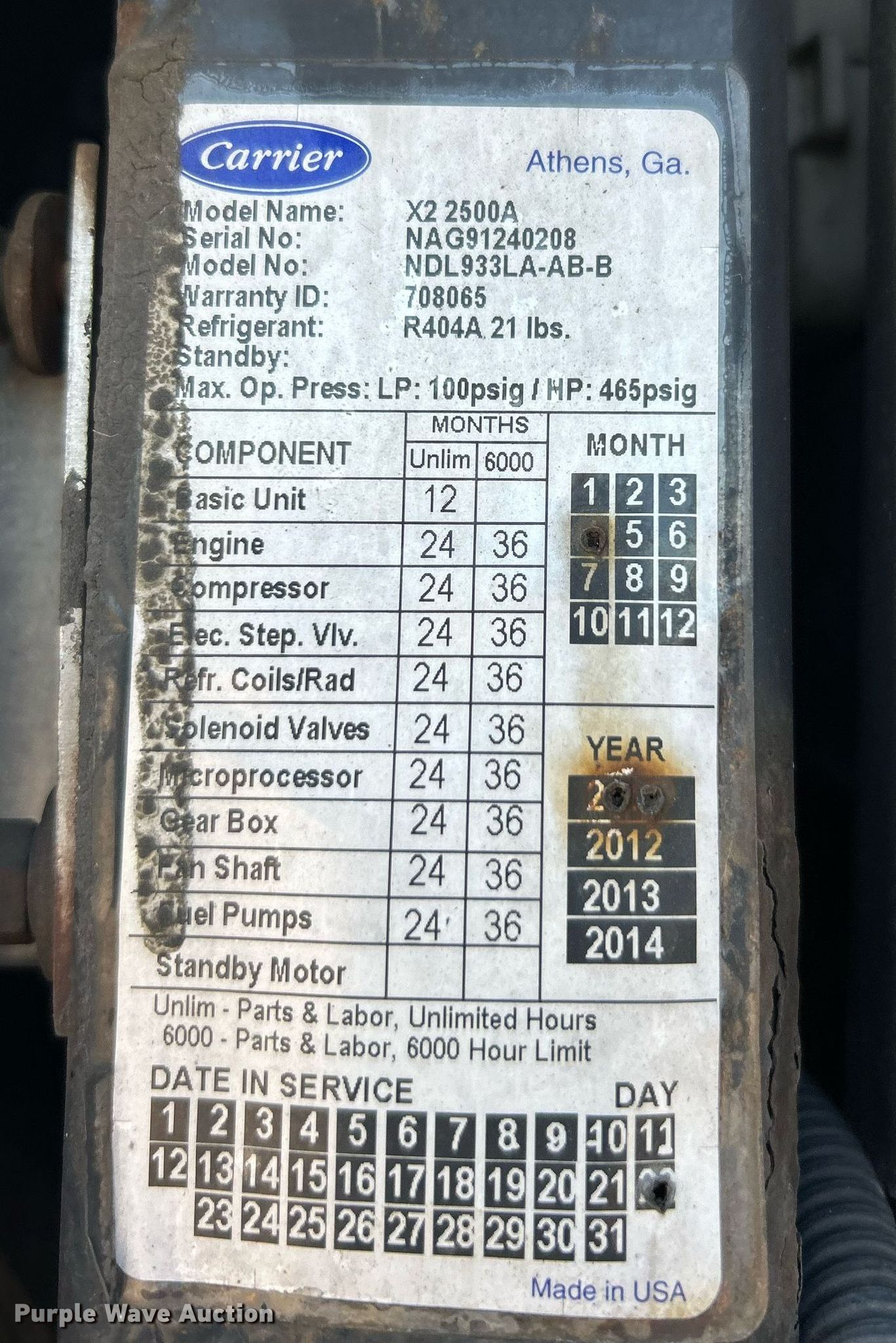 2012 Utility Trailer VS2RA refrigerated van trailer. VIN: 1UYVS2537CU232205. Dimensions Overall: 53' L x 102" W. Features Deck type: Aluminum, Refrigeration unit Carrier X2 2500A, Hours: 15,373, Serial: NAG91240208. Chassis Landing gear: Dual, Suspension: Air, Brakes: Air, Axles: Tandem Sliding, GVWR: 65,000 lbs, GAWR: 20,000 lbs. Tires Aluminum wheels, Steel wheels, Aluminum wheels, Size: 295/75R22.5. Nebraska title. JBH Transports. St. Louis, MO 63147