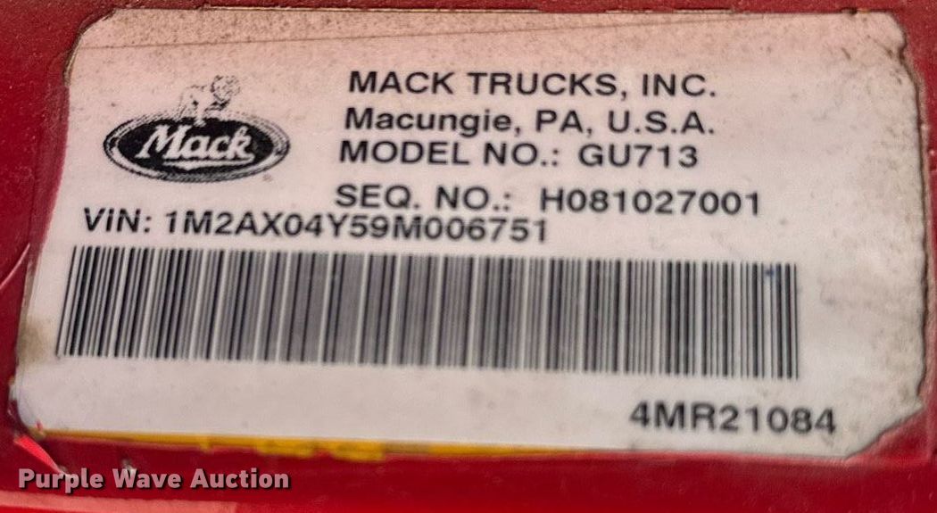 Purple Wave is selling a used Truck Tractor in Michigan. This item is a 2009 Mack GU713 semi truck with the following: Miles: 295,850 on odometer, Hours: 13,815 on meter, VIN: 1M2AX04Y59M006751