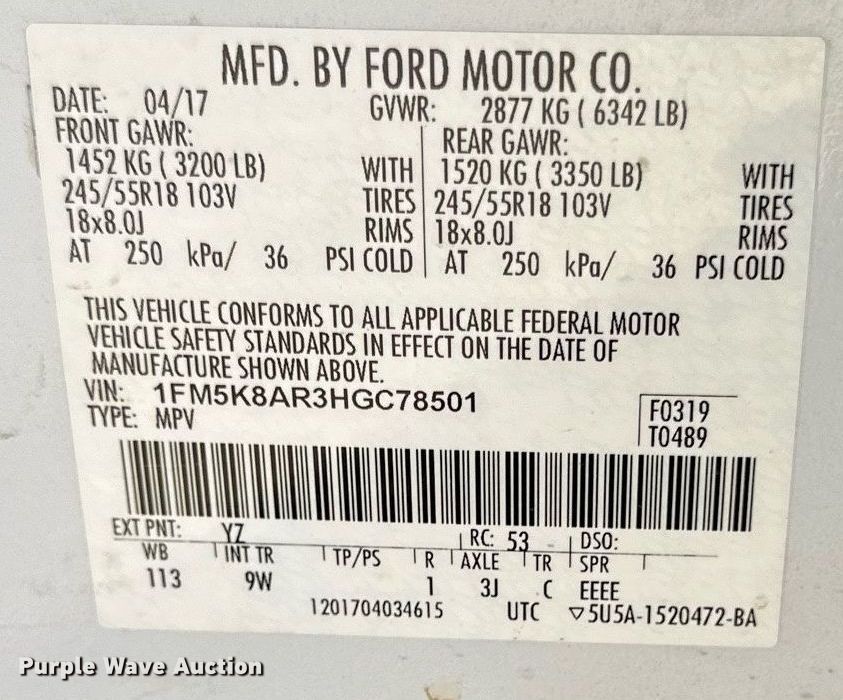 2017 Ford Explorer Police Interceptor SUV. Miles: 108,475 on odometer, VIN: 1FM5K8AR3HGC78501. Engine Displacement: 3.7L V6 DOHC, Cylinders: 6, Fuel type: Gas. Transmission Automatic, All wheel drive. Interior AC, Heat, Seat: Power driver, Power windows, Power locks, Cruise control. Tires Size: 245/55R18. Notes Dash warning indicator: TPMS, Center console missing. Kansas title. Seller is a government entity who will be assigning and distributing the title. Please contact the seller for distribution questions. Title distribution may be delayed up to 14 days from verification of funds. City of Lawrence. Lawrence, KS 66044
