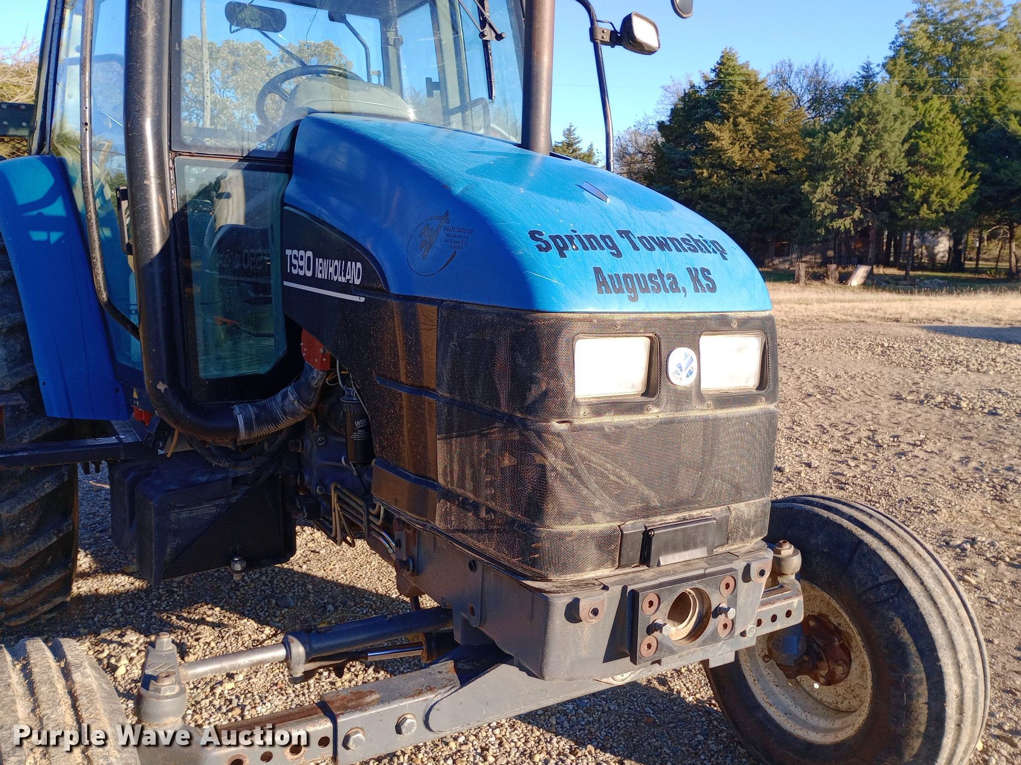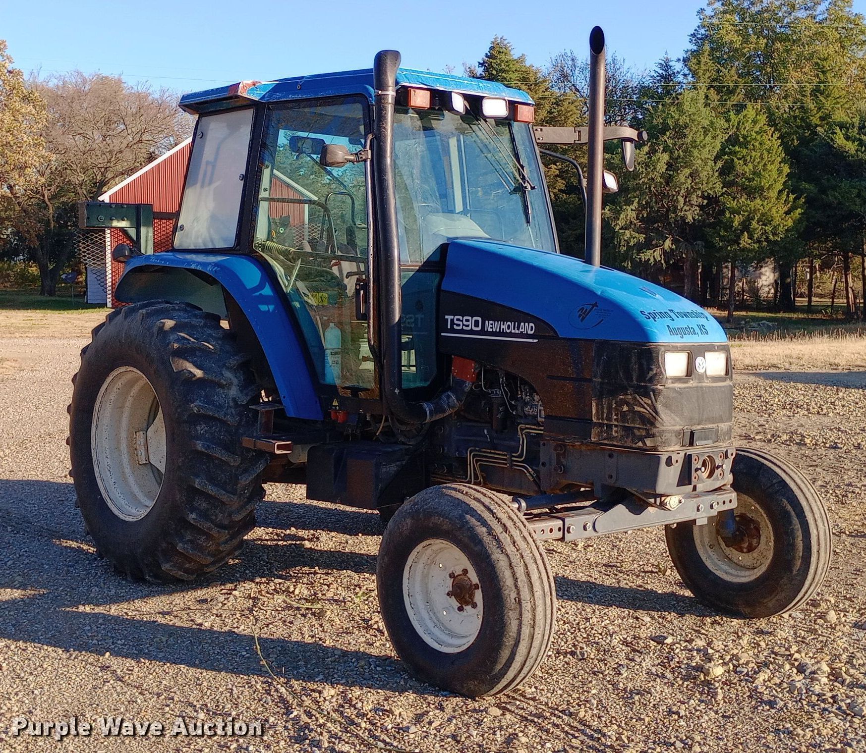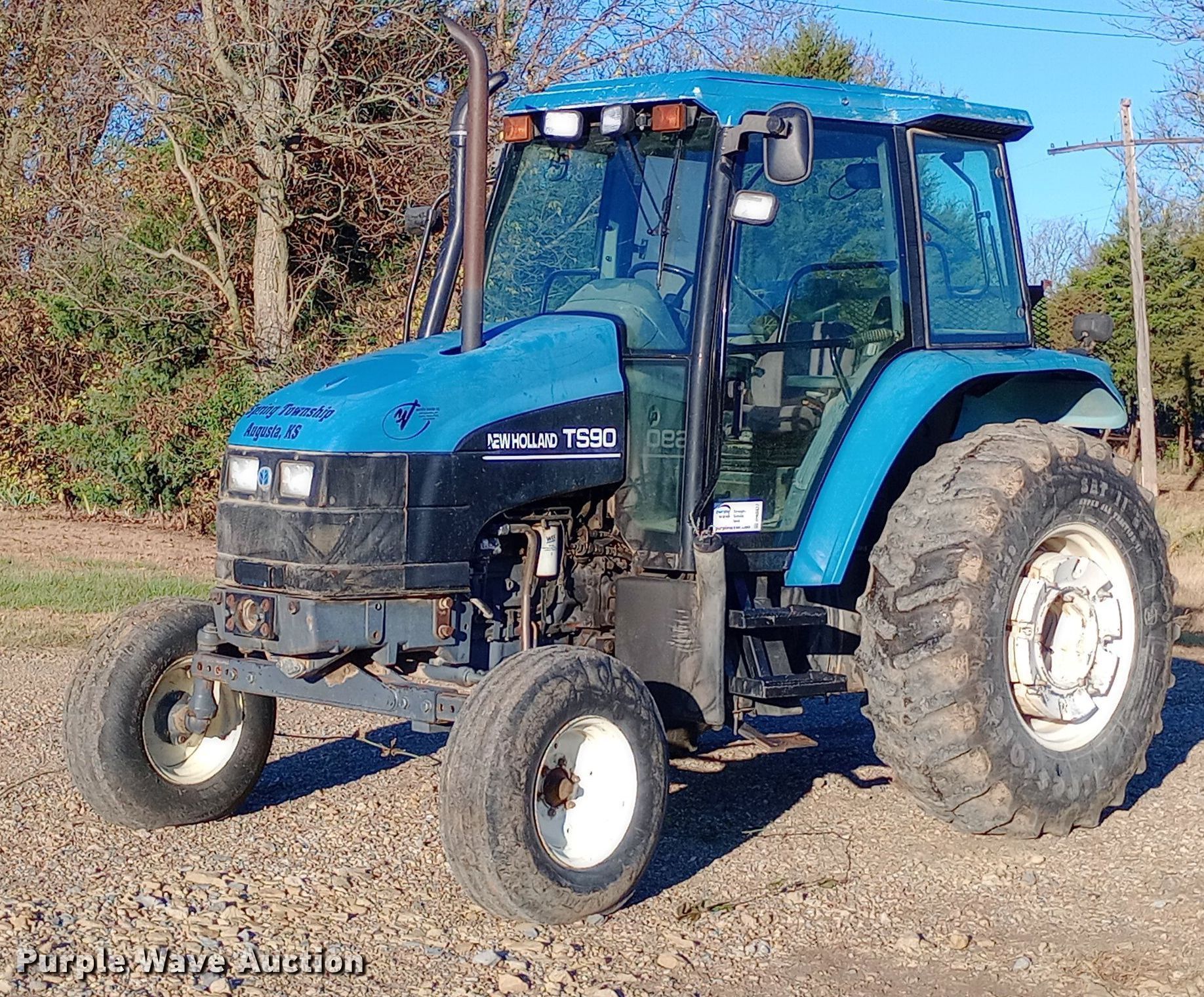 New Holland TS90 tractor. Hours: 4,835 on meter. Engine Cylinders: 4, Fuel type: Diesel. Transmission Synchro, 12F - 12R. Operators station AC, Heat. Features PTO: 540, Seven pin outlet, Hydraulic remote sets Rear: 2. Tires Front: 10.00-16, Rear: 18.4-30, Wheel weights: 4. Notes Non-operational clutch, Non-operational master cylinder, Starter needs replaced. Spring Township Trustee. Augusta, KS 67010
