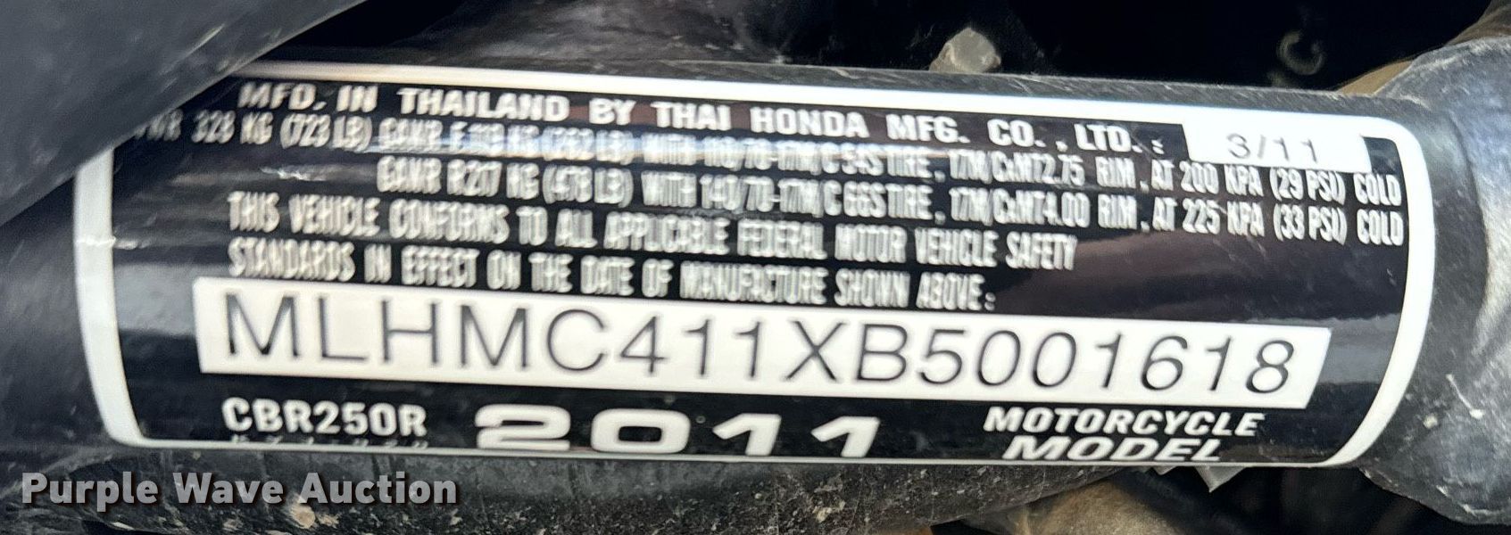 Purple Wave is selling a used Motorcycle in Kansas. This item is a 2011 Honda CBR250R motorcycle with the following: Miles: 6,074 on odometer, VIN: MLHMC411XB5001618