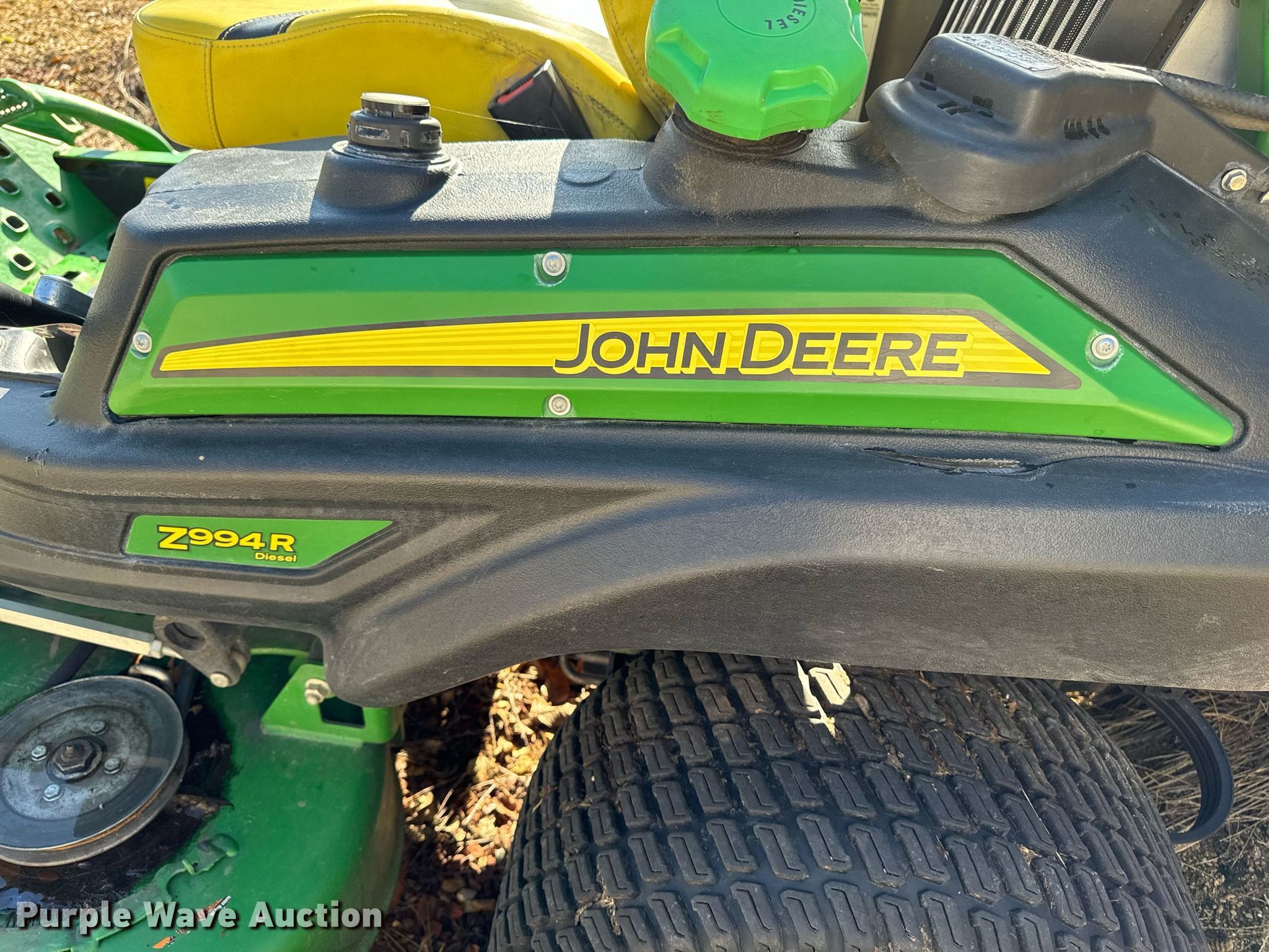 John Deere Z994R ZTR lawn mower. Hours: 1,682 on meter, Cutting width: 60", Serial: 1TC994RHKJT010056. Engine Yanmar 4WNCCXAJ, Displacement: 1.267L, Cylinders: 3, Fuel type: Diesel. Transmission Hydrostatic. Operators station OROPS. Tires Front: 13x6.5-6, Rear: 24x12-12. Notes Right angle drive motor issues, Partially disassembled, Parts may be missing, Non-operational unit. Scott County Conservation. Eldridge, IA 52748