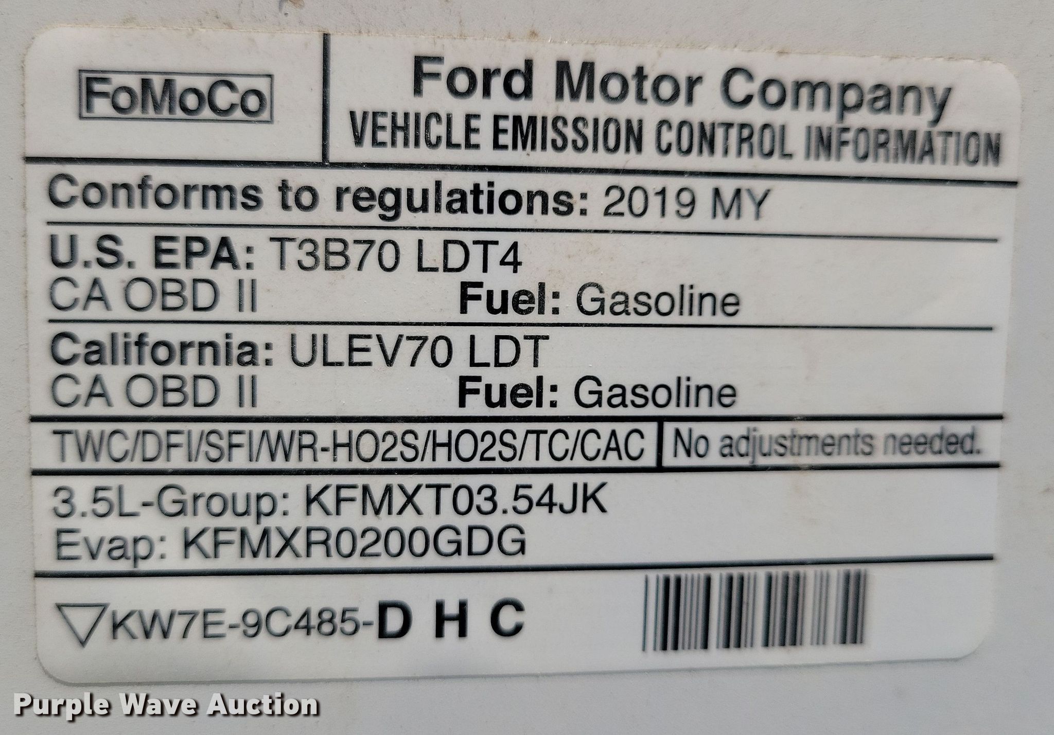 2019 Ford F150 XL SuperCrew pickup truck. Miles: 128,583 on odometer, Hours: 4,890 on meter, VIN: 1FTEW1E42KKD17114, Unit #: CG228. Engine Displacement: 3.5L V6, Cylinders: 6, Fuel type: Gas. Transmission Automatic, Four wheel drive. Interior AC, Heat, Seat: Power driver, Power windows, Power locks, Cruise control, Backup camera. Tires Size: 265/70R17. Notes Dash warning indicator: Check engine, Airbag, No center console, Engine issues, may need replaced Rough idle, Low compression. South Dakota title. Title distribution may be delayed up to 14 days from verification of funds. State of South Dakota. Pierre, SD 57501
