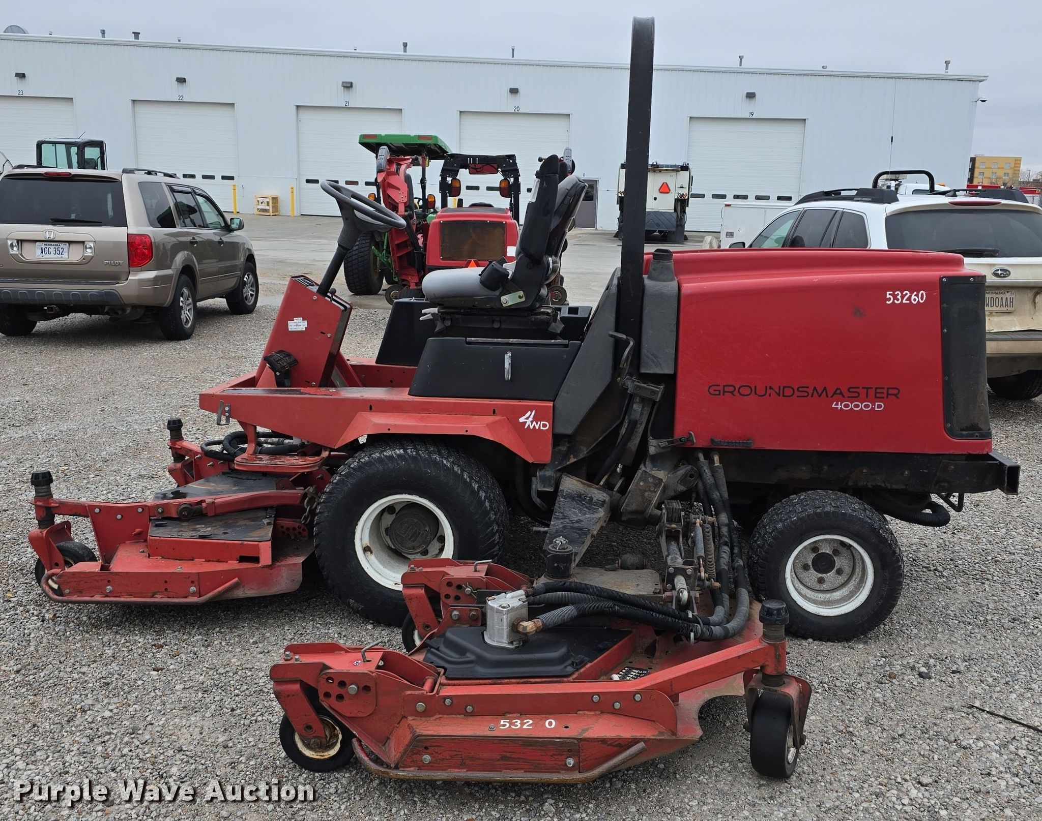 Purple Wave is selling a used Commercial Turf Mower in Nebraska. This item is a Toro Groundsmaster 4000-D lawn mower with the following: Hours: 2,947 on meter, Cutting width: 132", Serial: 290000335, Unit #: 53260