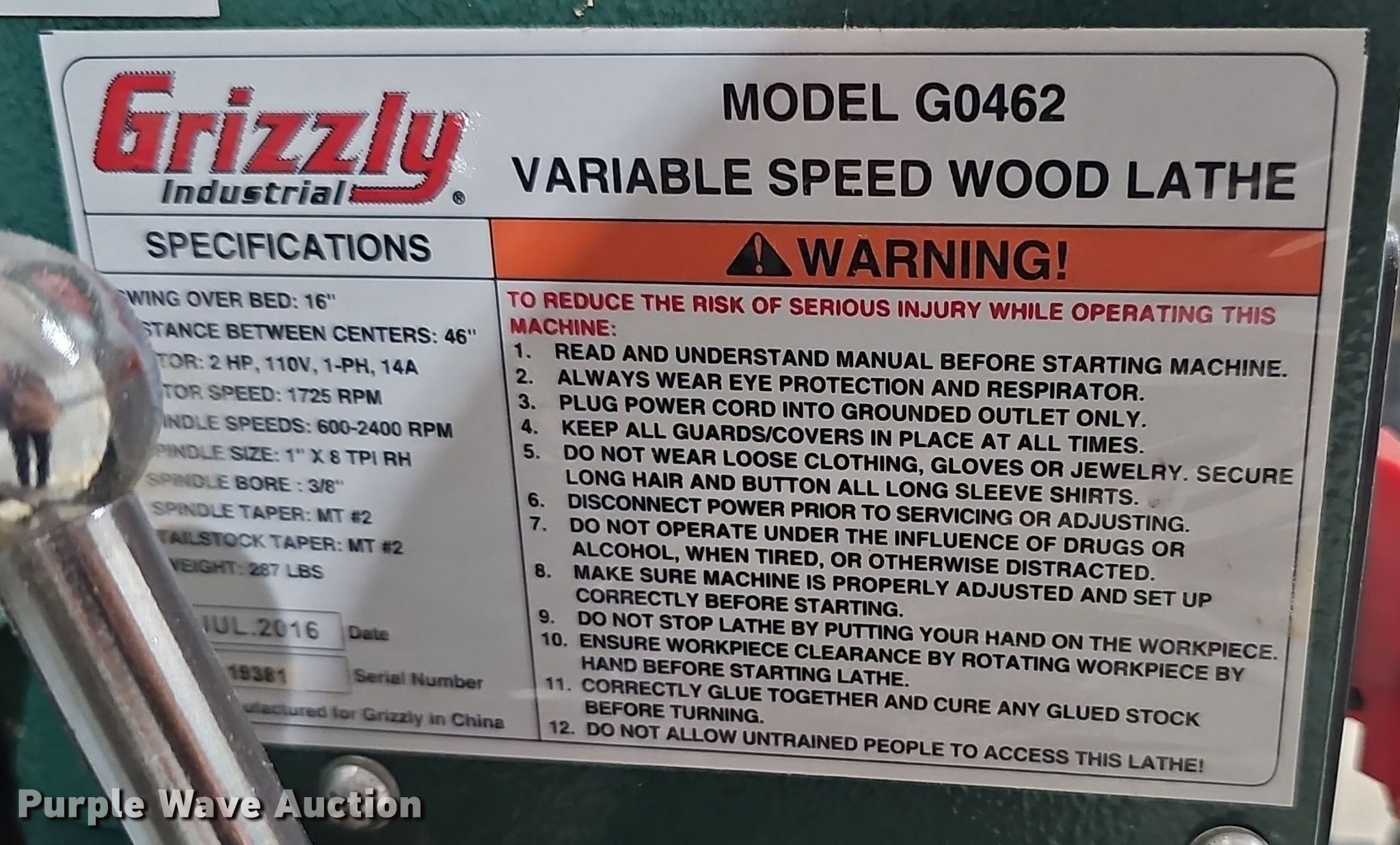 Purple Wave is selling a used Lathes, Manual in Missouri. This item is a Grizzly G0462 wood lathe with the following: Serial: 19381