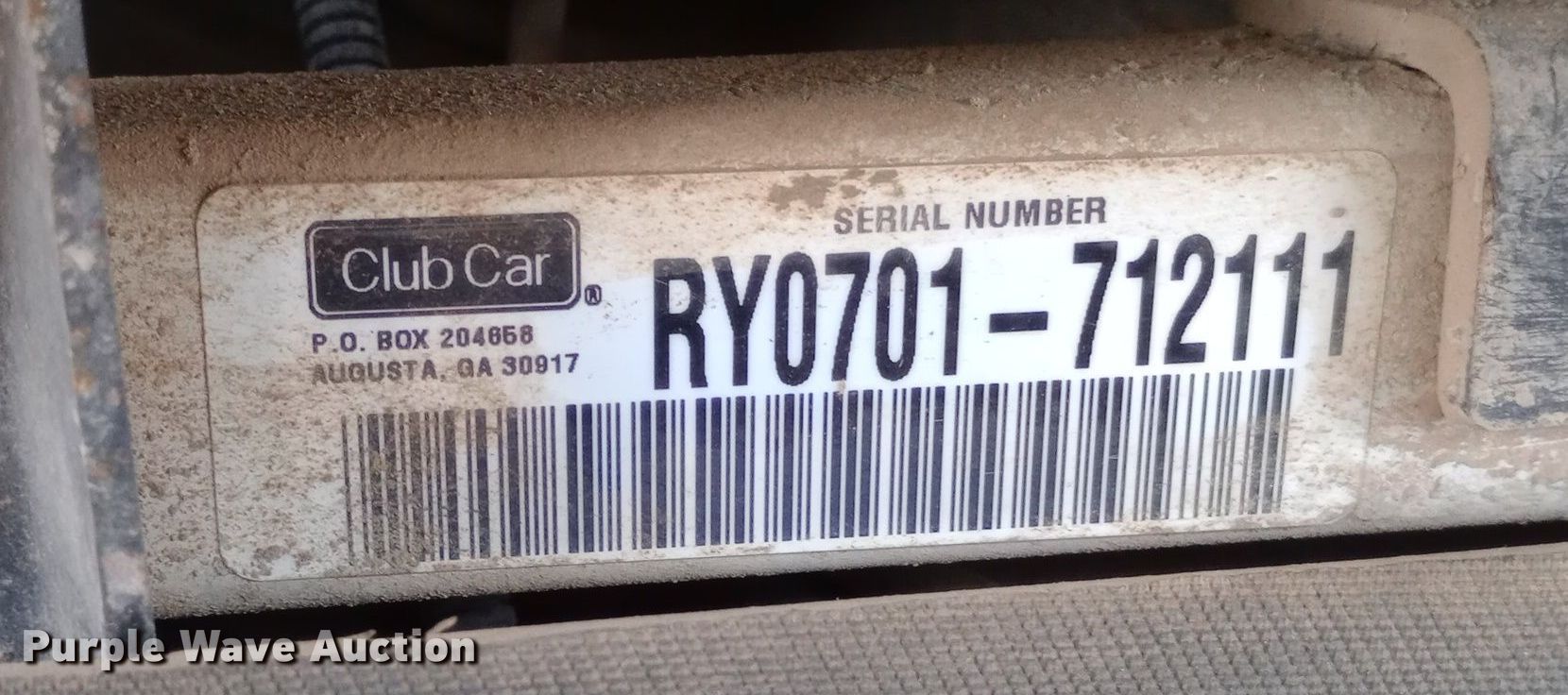 2007 Club Car XRT1550 utility vehicle. Hours: 940 on meter, Serial: RY0701-712111, Unit #: 13.14. Engine Kubota D722, Cylinders: 3, Fuel type: Diesel, Electric start. Transmission Automatic. Chassis Four wheel drive/ All wheel drive. Operators station OROPS. Features Dump bed 46" L x 50" W, Dump bed type: Manual. Tires Size: 280/60-12. Transfer of ownership documentation will be a bill of sale. Sherwood Construction Company. Wichita, KS 67277