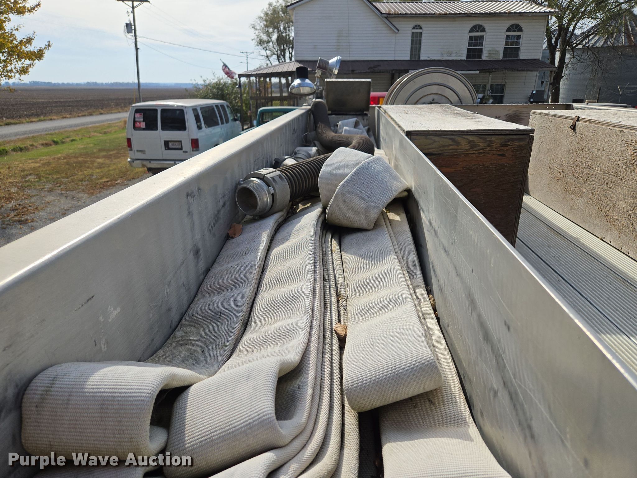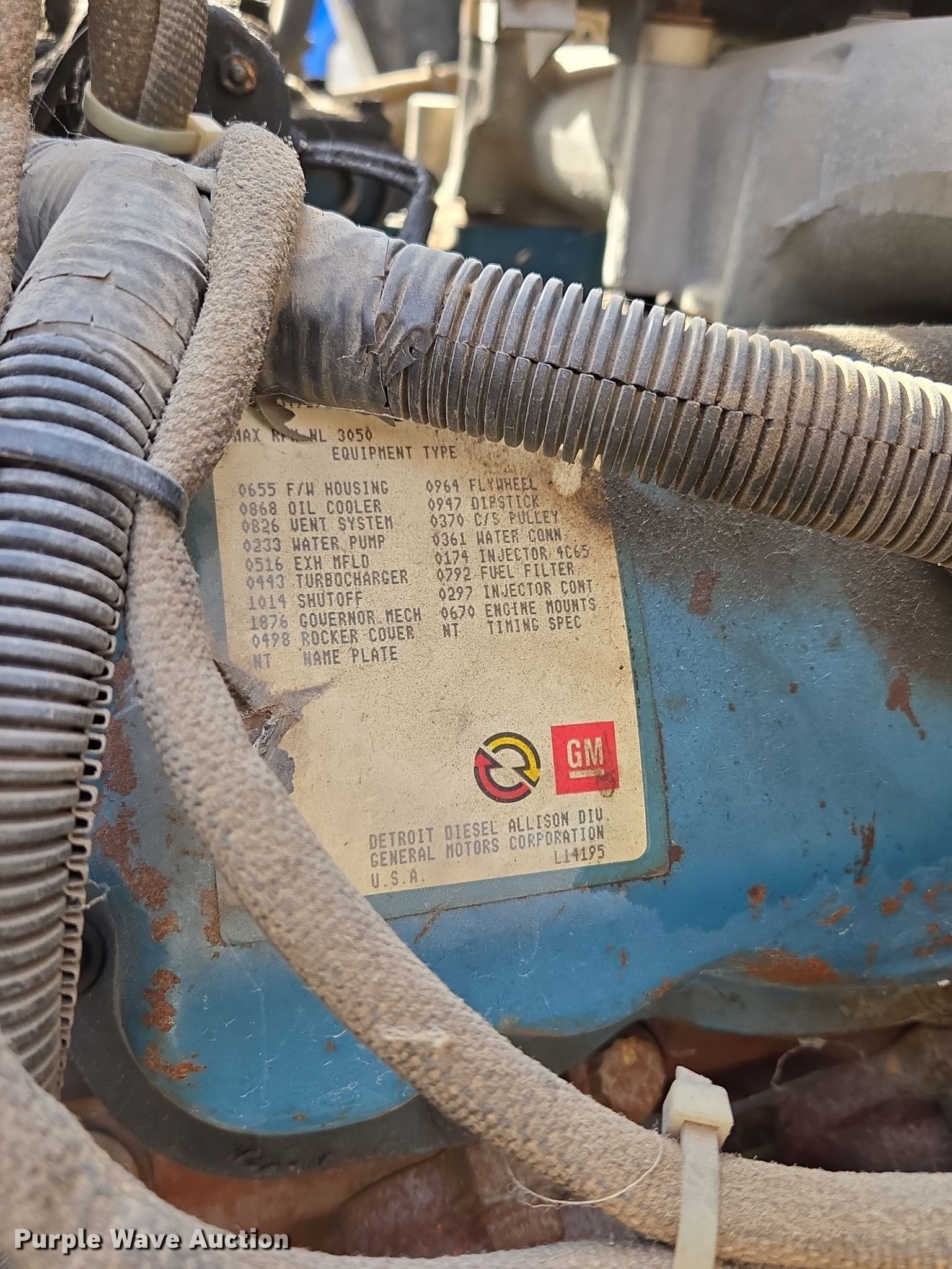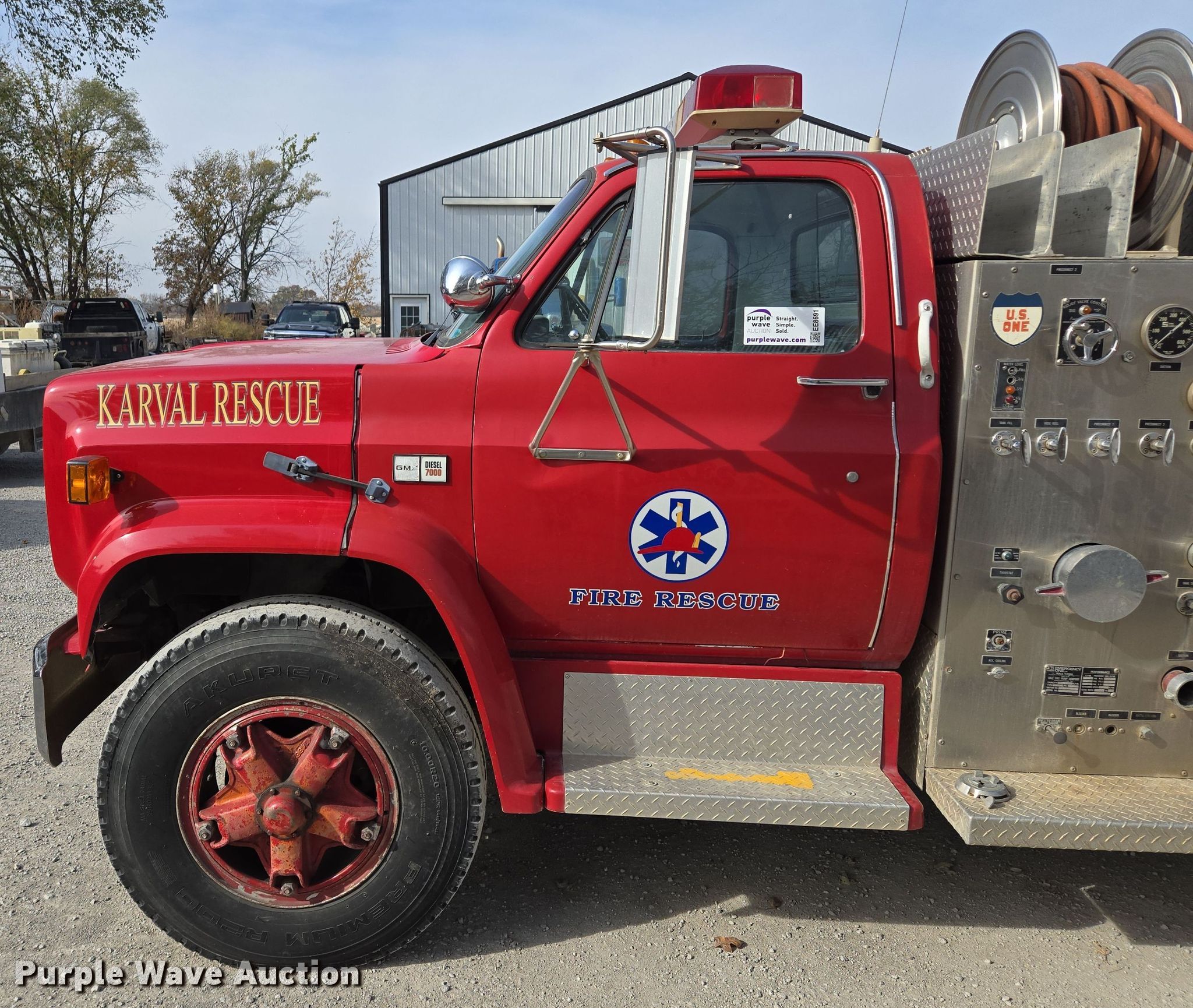 1985 GMC 7000 pumper fire truck. Miles: 51,336 on odometer, VIN: 1GDL7D1G4FV501542. Engine Detroit Diesel, Displacement: 8.2L, Cylinders: 8, Fuel type: Diesel. Transmission Manual. Chassis Axles: Single, Suspension: Spring, Brakes: Hydraulic, GVWR: 28,000 lbs. Interior Heat. Features Fire truck body Pump 1,000 GPM, Ground ladder. Tires Front: 10R20.00, Rear: 10.00R20. Notes Dead battery. Missouri title. Them Perkins Boys Hauling. Lock Springs, MO 64654