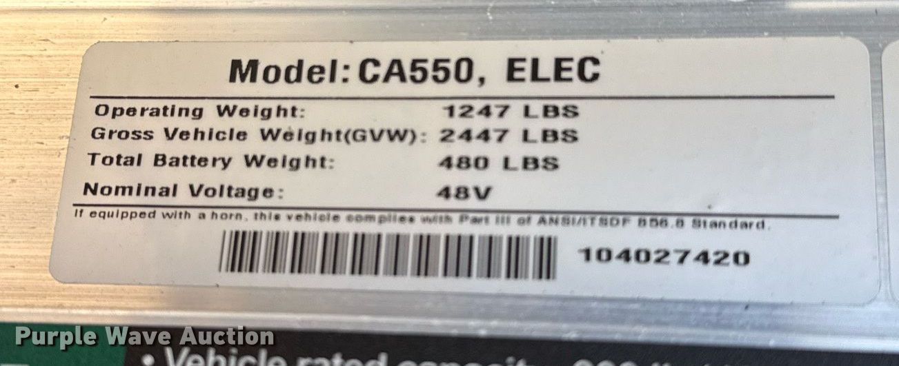 2019 Club Car CA550 golf cart. Hours: 1,067 on meter, VIN: A5CUBB2AVKA950915, Serial: MM1908-950915. Electric Motor Volts: 48, Phase: Single, Charger: Single phase. Transmission Automatic. Operators station Canopy. Features Dump bed 46" L x 49" W, Dump bed type: Manual. Tires Size: 22x11-10. Collinsville, OK 74021