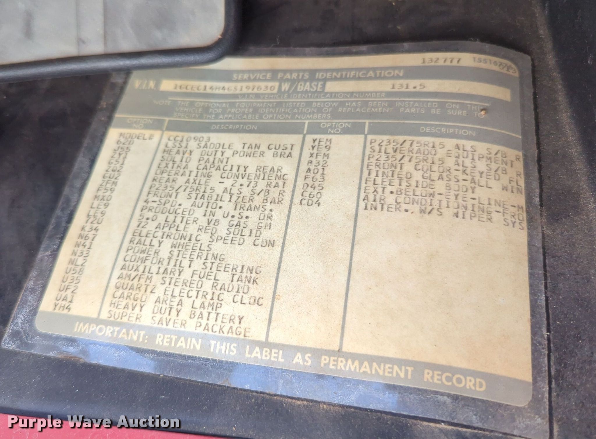 1986 Chevrolet C10 pickup truck. Miles: 89,056 on odometer, VIN: 1GCEC14H4GS197630. Engine Displacement: 5.0L V8 OHV, Cylinders: 8, Fuel type: Gas. Transmission Automatic. Interior AC, Heat, Power windows, Power locks. Tires Size: 205/75R15. Notes Radiator missing, Flat tires, Windshield chipped or cracked, Unknown operating condition. Oklahoma title. Mileage has not been verified. Exempt will be written in the odometer disclosure on the title. Seller is an Oklahoma licensed motor vehicle dealer. Title will be assigned and distributed by the dealer. Please contact the seller for distribution questions. Title distribution may be delayed up to 14 days from verification of funds. Steve's Wholesale Tools. Oklahoma City, OK 73139