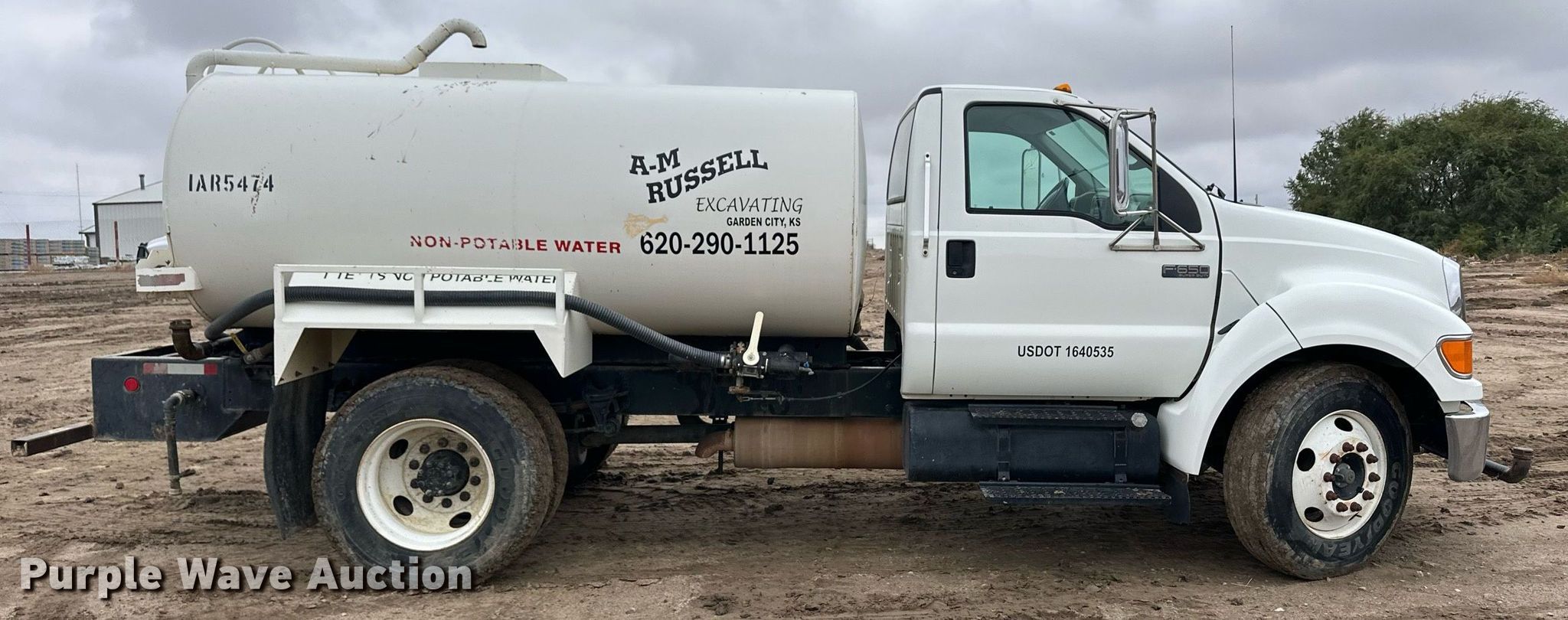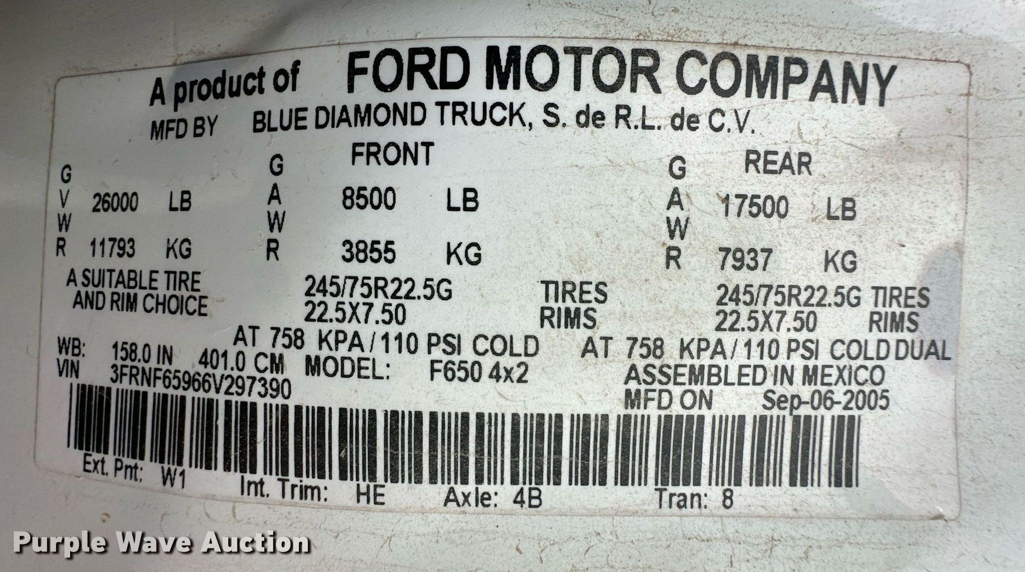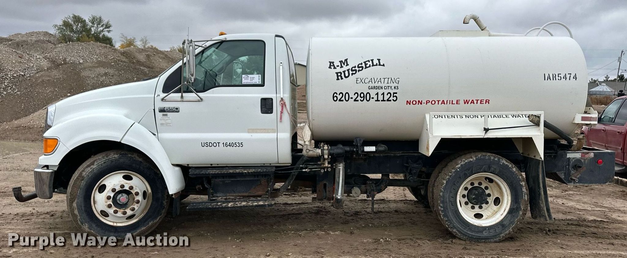 2006 Ford F650 Super Duty water truck. Miles: 15,681 on odometer, VIN: 3FRNF65966V297390. Engine Caterpillar C7 Acert, Displacement: 7.2L, Cylinders: 6, Fuel type: Diesel, HP: 190. Transmission Manual, Speed: 6. Chassis Axles: Single, Suspension: Spring, Brakes: Hydraulic. Interior AC, Heat, Cruise control. Features Bed / tank Capacity: 2,000 gallons, 10' L x 84" W, Spray bar: Front, Rear, Side discharge, Hose reel, Top fill. Tires Size: 10R22.5. Kansas title. Title distribution may be delayed up to 30 days from verification of funds. A-M Russell Excavating. Garden City, KS 67846
