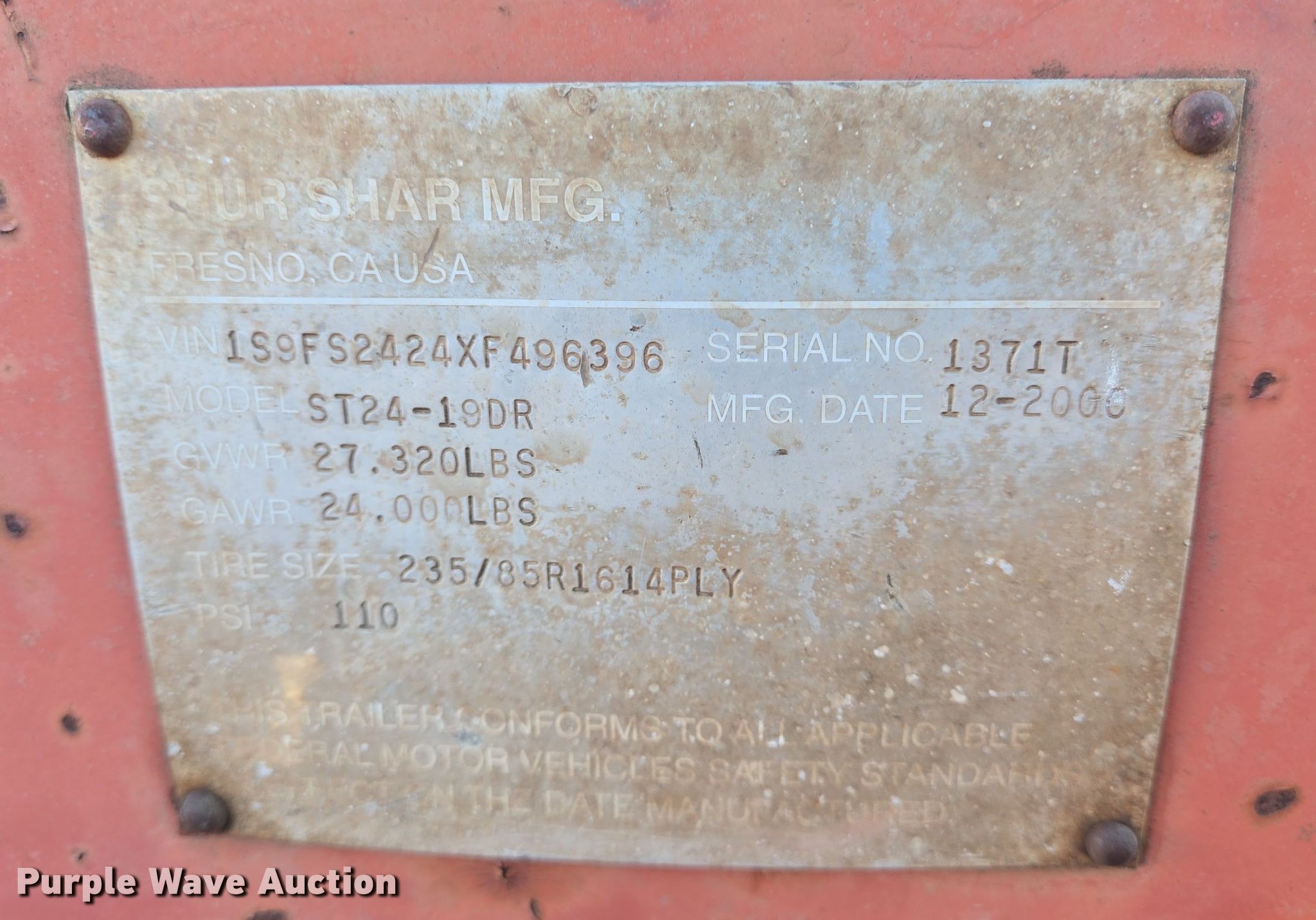 2001 Shur Shar ST-24-19DR equipment trailer. VIN: 1S9FS2424XF496396. Dimensions Overall: 24' L x 96" W, Deck: 19' L x 96" W, Deck height: 32", Tail length: 5', Ramps: Manual Length: 6'. Features Deck type: Wood, Board size: 6.5". Chassis Hitch: Pintle, Landing gear: Single, Suspension: Spring, Brakes: Air, Axles: Tandem, GVWR: 27,320 lbs, GAWR: 24,000 lbs. Tires Steel wheels, Size: 235/85R16LT. Titles will be distributed after confirmation of payment and removal. California title. Title distribution may be delayed up to 30 days from verification of funds. The Pape Group. Corona, CA 92879
