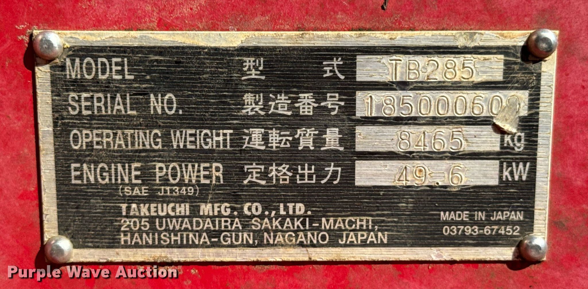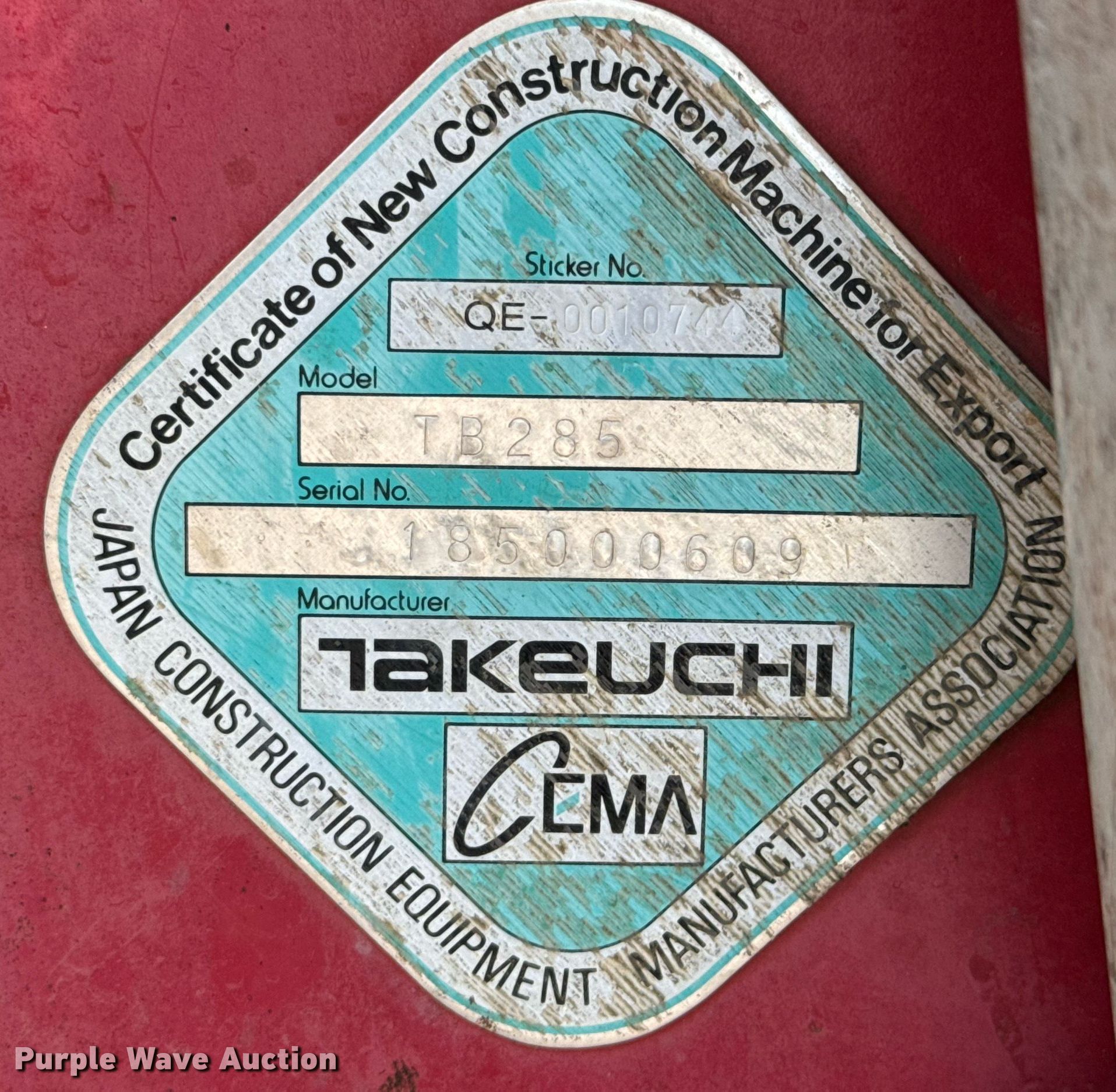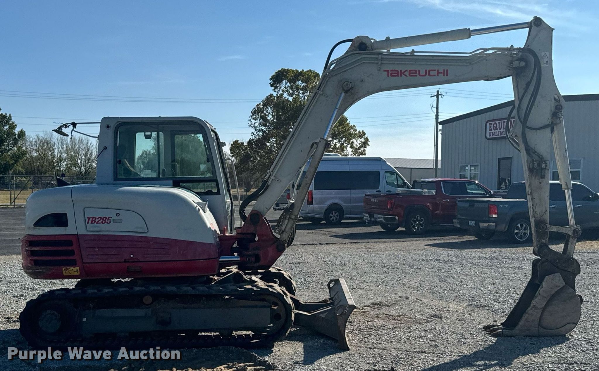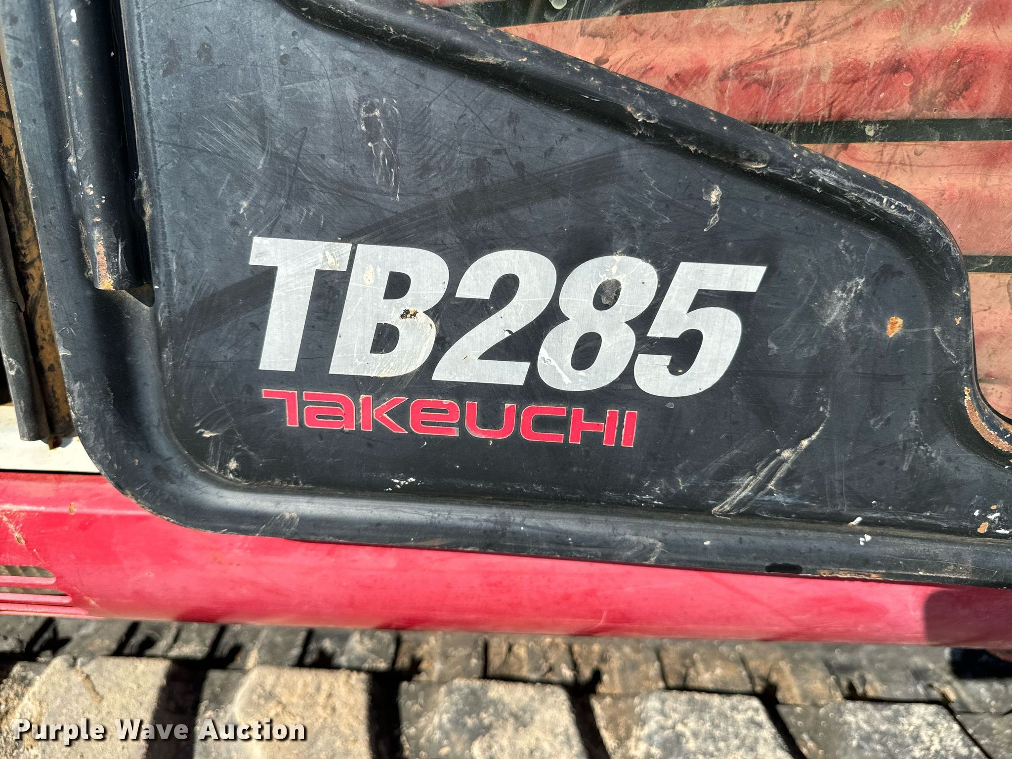 Purple Wave is selling a used Mini Excavator in Oklahoma. This item is a 2013 Takeuchi TB285 mini excavator with the following: Hours: 519 on meter, Actual hours unknown, Serial: 185000609