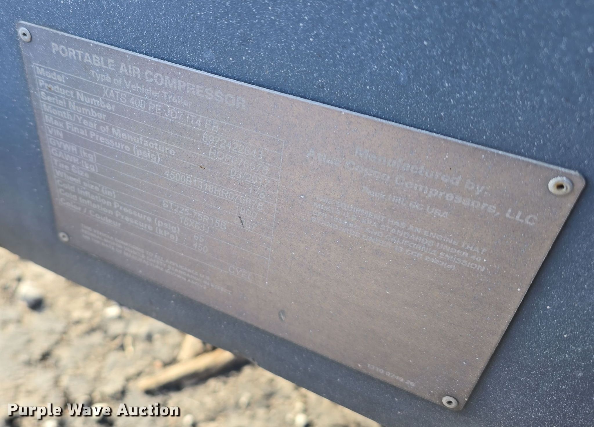 2017 Atlas Copco XATS 400 PE JD7 IT4 EB air compressor. Hours: 2,661 on meter, VIN: 4500B1318HR076678, Serial: HOP076678. Engine John Deere, Displacement: 4.5L, Cylinders: 4, Fuel type: Diesel. Features PSI: 175. Trailer 13' L x 60" W, Suspension: Spring, Brakes: Electric, Axles: Single, Tire size: ST225/75D15, GVWR: 4,189 lbs, GAWR: 4,998 lbs. This is worksite support equipment and will not come with a title. Transfer of ownership documentation will be a bill of sale. Jordan Machinery/ S & N Auto Sales. Waterloo, NE 68069