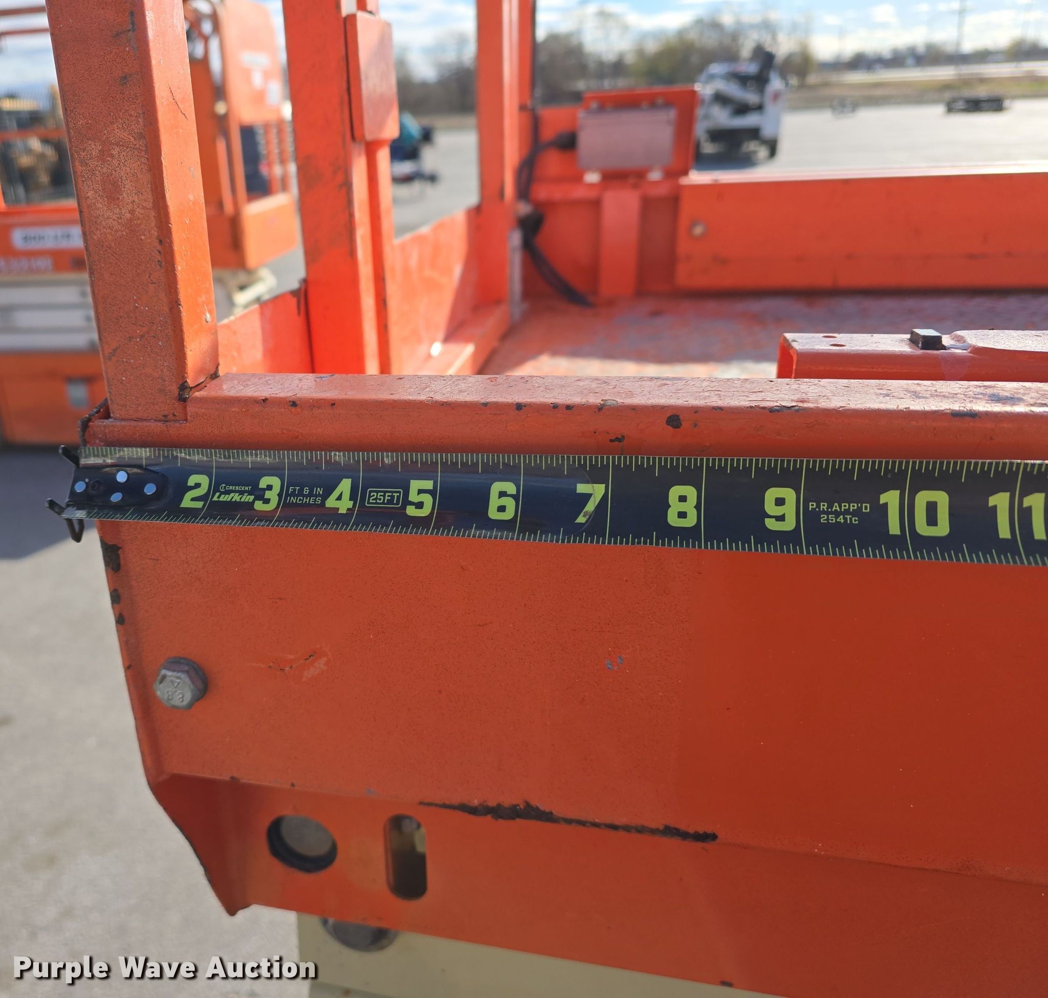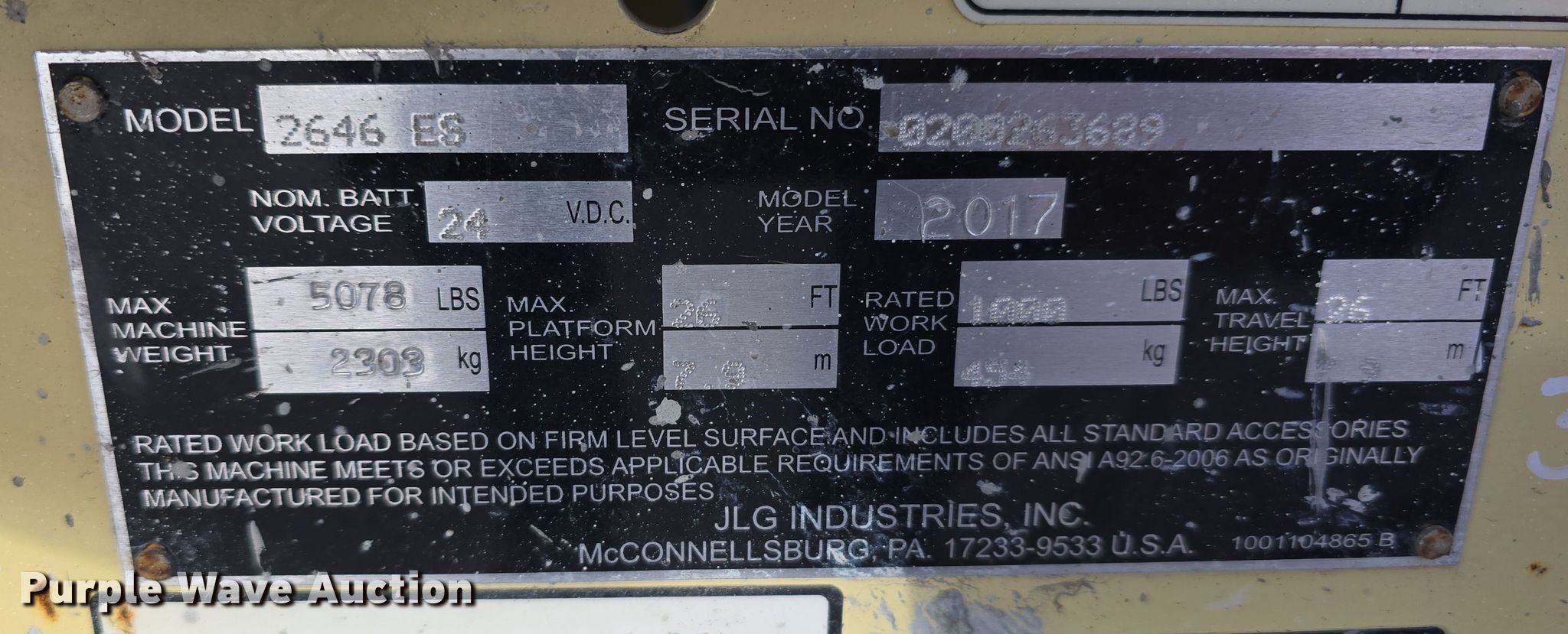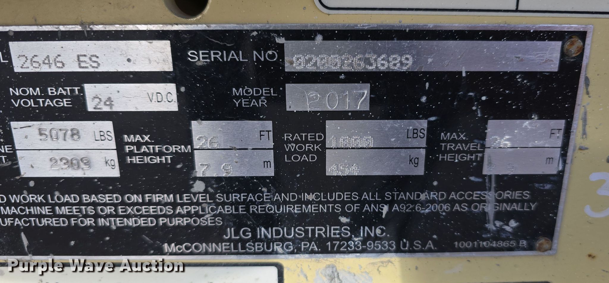 2017 JLG 2646 ES scissor lift. Hours: 49 on meter, Serial: 0200263689. Electric Motor Volts: 24. Features Maximum lift capacity: 1,000 lbs, Maximum lift height: 26', Platform: 146" L x 44" W, AC power outlet, Controls: Remote Control, Ground, Platform extensions: Manual, Safety alarm. Tires Tire size: 406X125, Solid, Non-marking. Notes Platform extension manual release lock issues, possible broken bolt. Jordan Machinery/ S & N Auto Sales. Waterloo, NE 68069